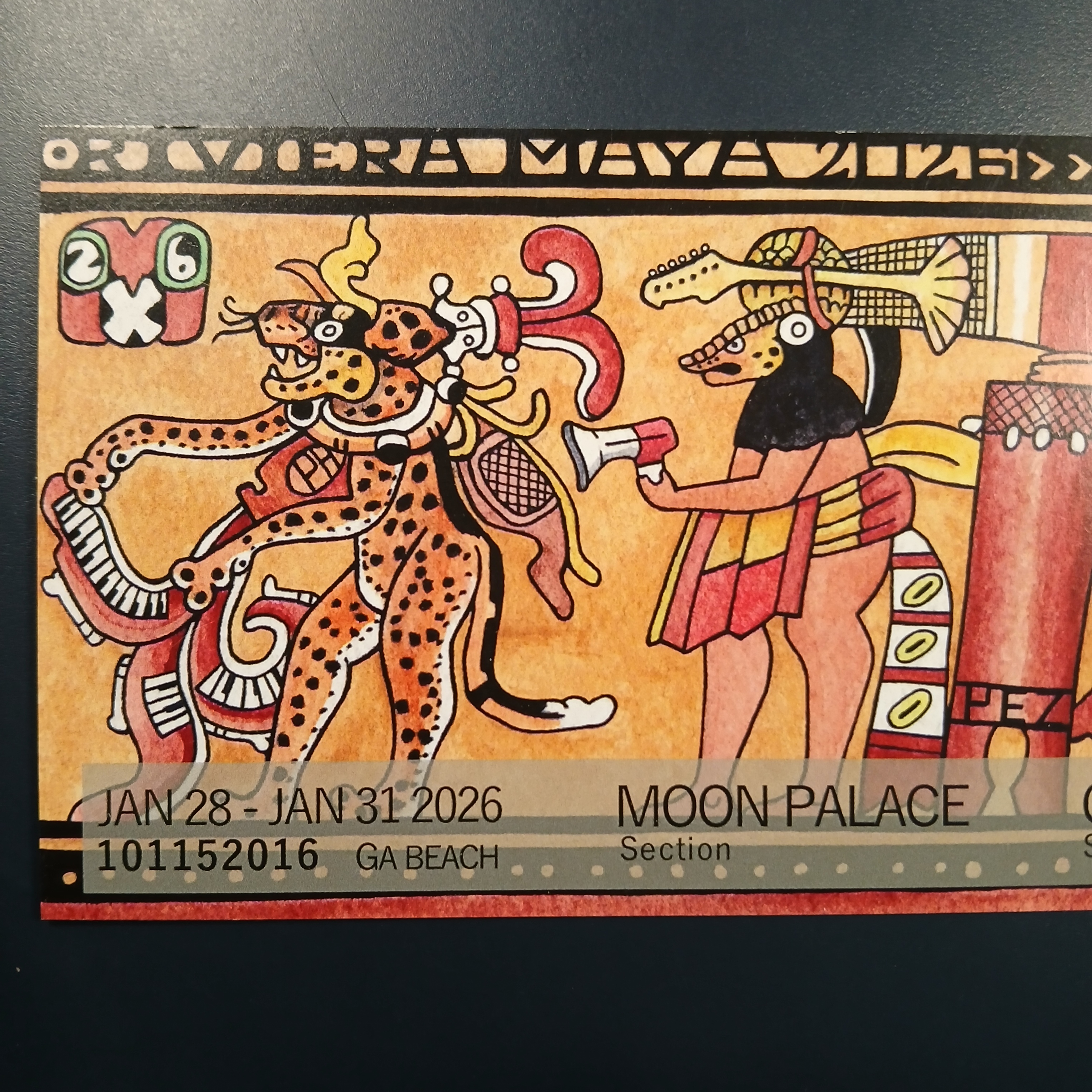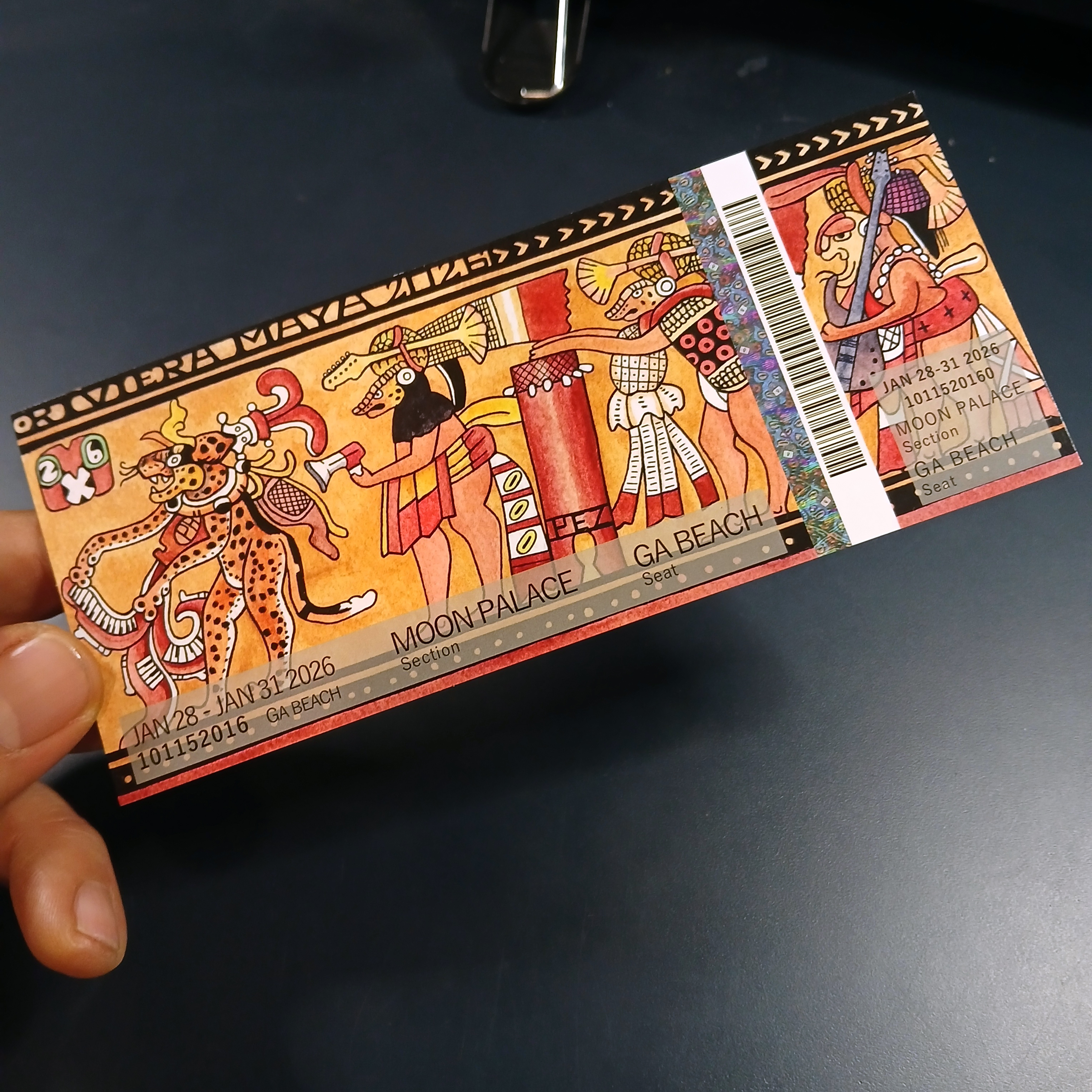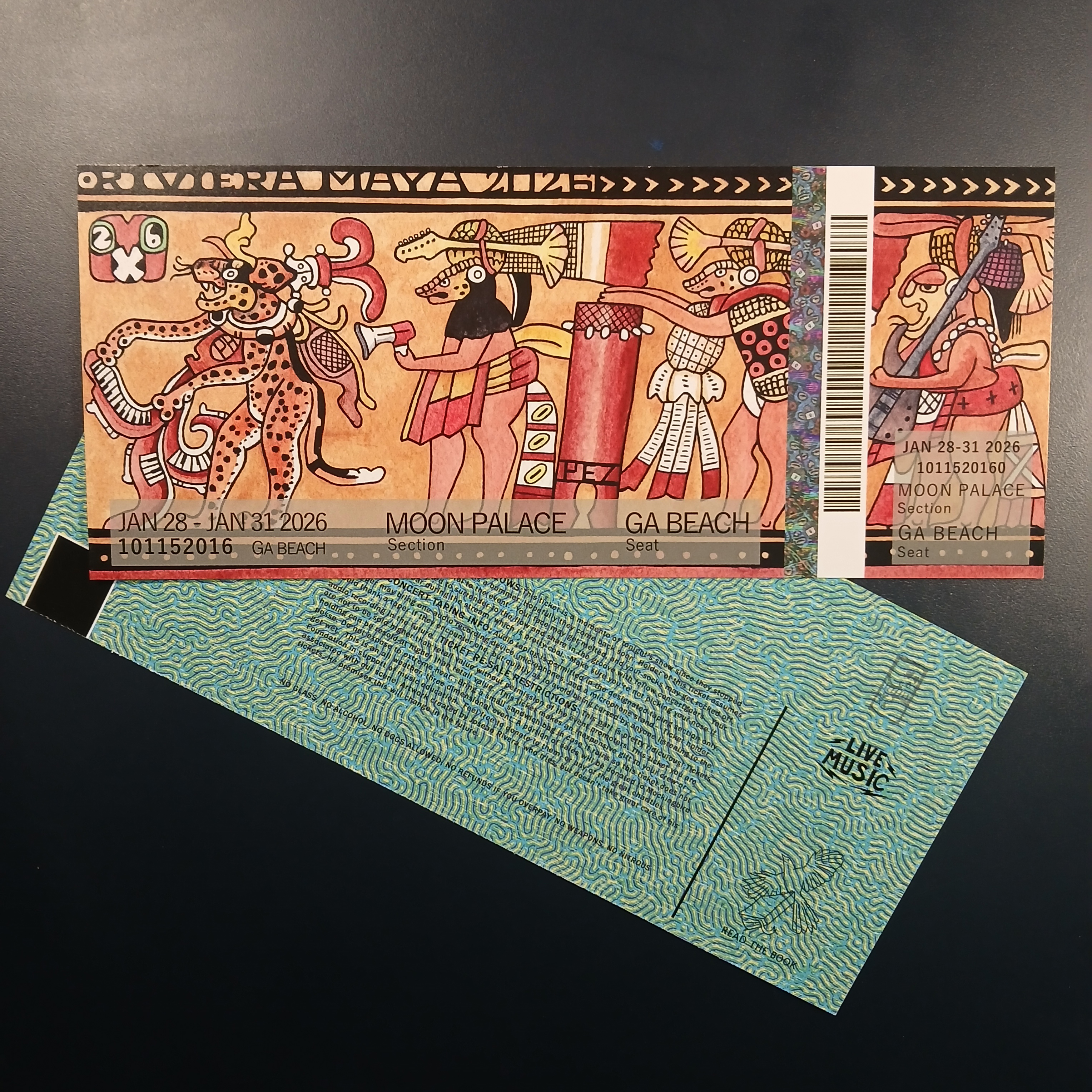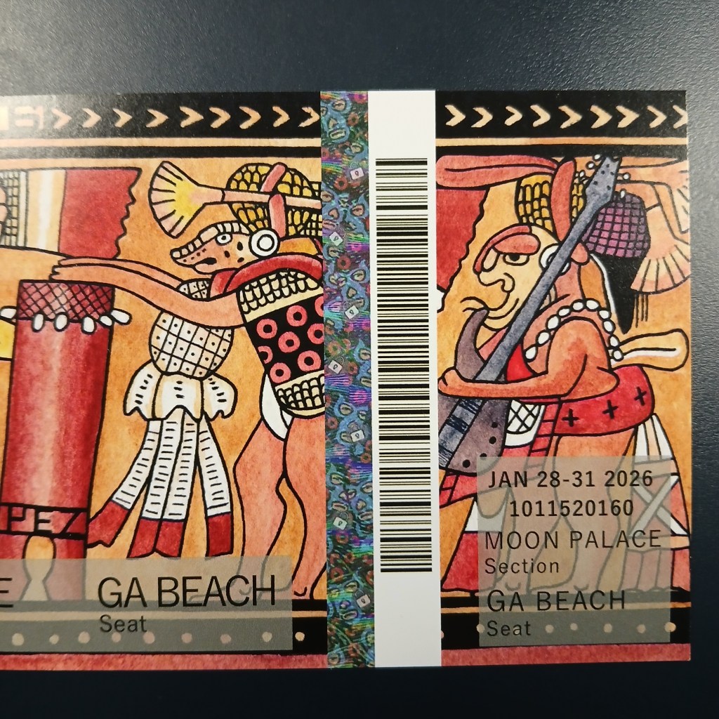 My commemorative event tickets and magnets for Phish’s 2026 Riviera Maya shows. I continued the Mayan art theme from last year’s stub. The original art was created using micron pens and watercolor. The original artwork used was an 8.5×11 watercolor painting I created.