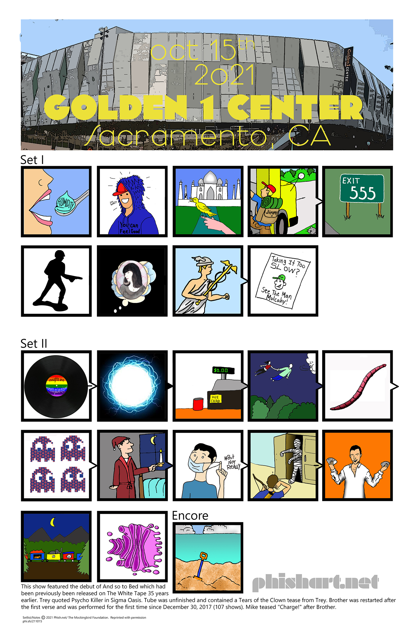 ENCORE: Sand This show featured the debut of And so to Bed which had been previously been released on The White Tape 35 years earlier. Trey quoted Psycho Killer in Sigma Oasis. Tube was unfinished and contained a Tears of the Clown tease from Trey. Brother was restarted after the first verse and was performed for the first time since December 30, 2017 (107 shows). Mike teased “Charge!” after Brother.