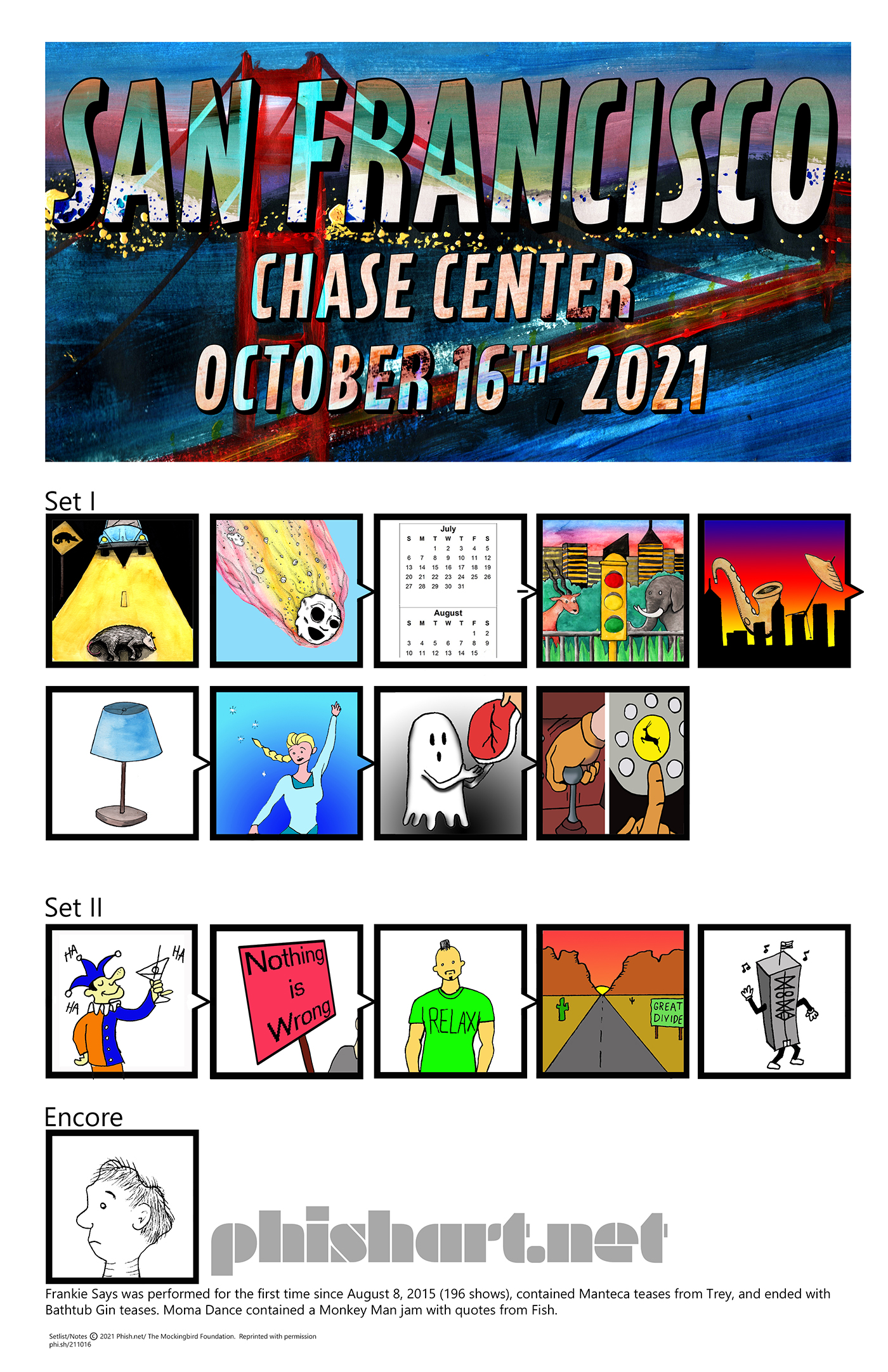 ENCORE: Carini Frankie Says was performed for the first time since August 8, 2015 (196 shows), contained Manteca teases from Trey, and ended with Bathtub Gin teases. Moma Dance contained a Monkey Man jam with quotes from Fish. This was the rescheduled date from the show that had been postponed due to the coronavirus COVID-19 outbreak in 2020.
