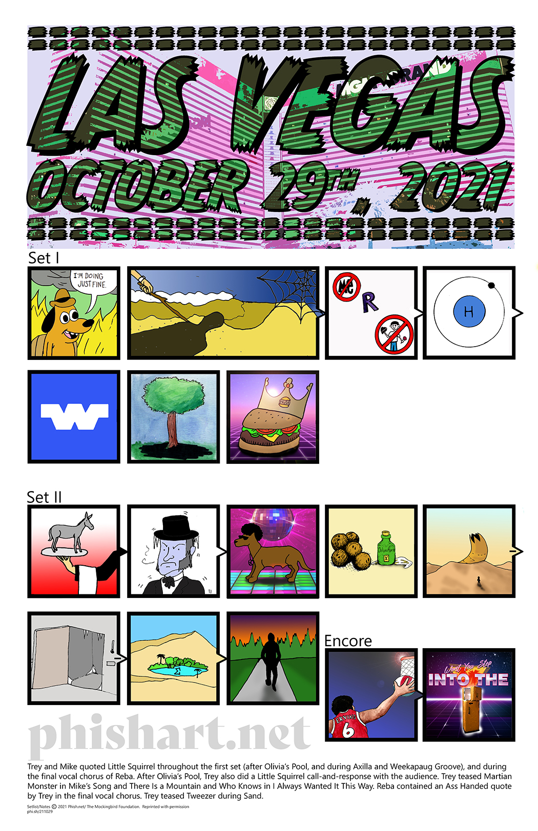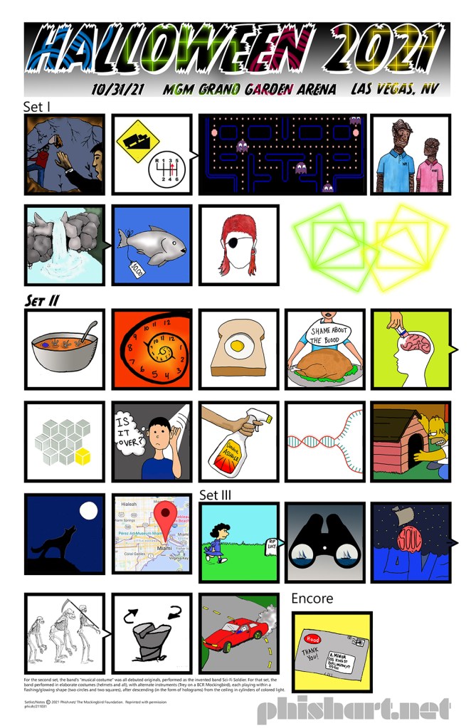 ENCORE: Harry Hood For the second set, the band’s “musical costume” was all debuted originals, performed as the invented band Sci-Fi Soldier (a 14-page comic book distributed upon entry detailed the group’s adventure to save the planet). For that set, the band performed in elaborate costumes (helmets and all), with alternate instruments (Trey on a BCR Mockingbird), each playing within a flashing/glowing shape (two circles and two squares), after descending (in the form of holograms) from the ceiling in cylinders of colored light. Knuckle Bone Broth Avenue included extended choreography by Trey and Mike. During Get More Down, matching upright geometric shapes danced around behind the band, reducing to the two circles overlapped by Egg in a Hole, which featured pyrotechnics. Before Clear Your Mind, Trey introduced the band as from the year 4680 (the total of the October 28, 2021 songs as noted during that night’s encore-ending Grind). During The 9th Cube, there were projections of donuts and turtles on a cube above the band. Fireworks rained down on the stage during The Inner Reaches of Outer. For I Am in Miami, Trey switched to an acoustic guitar and the band stood together at stage front with the four-mic a cappella setup. After the set, the band departed as holograms back up the colored tubes. The start of Harry Hood included alternate lyrics (Holy Blankenstein). Soul Planet contained Knuckle Bone Broth Avenue and Don’t Doubt Me quotes.