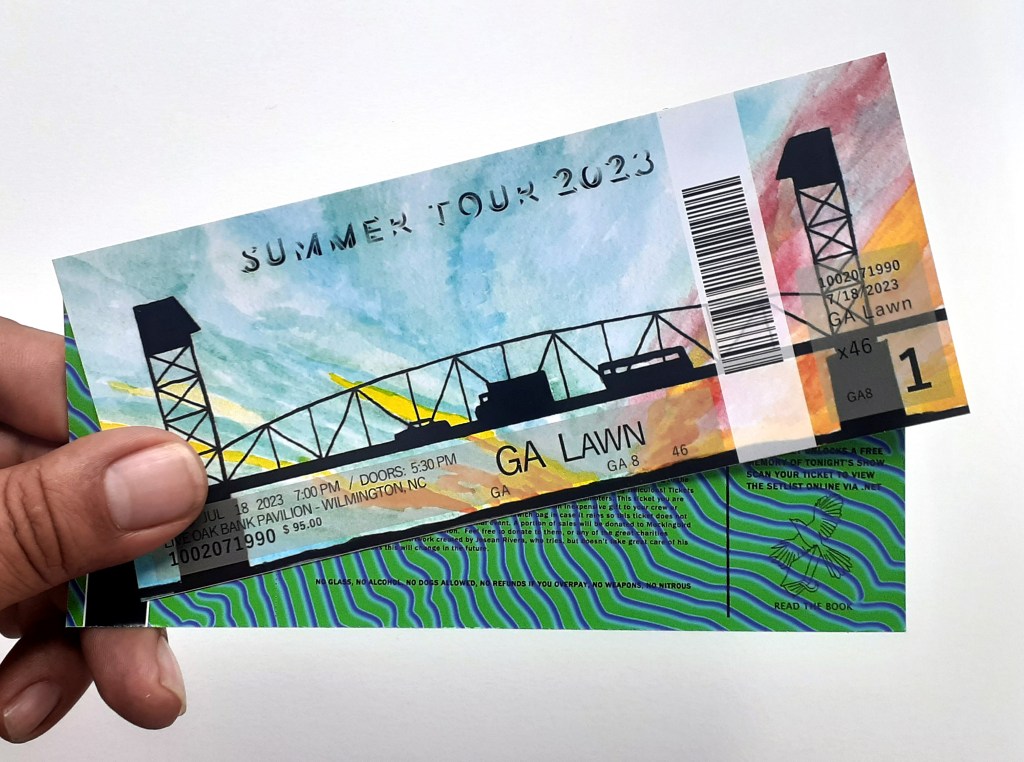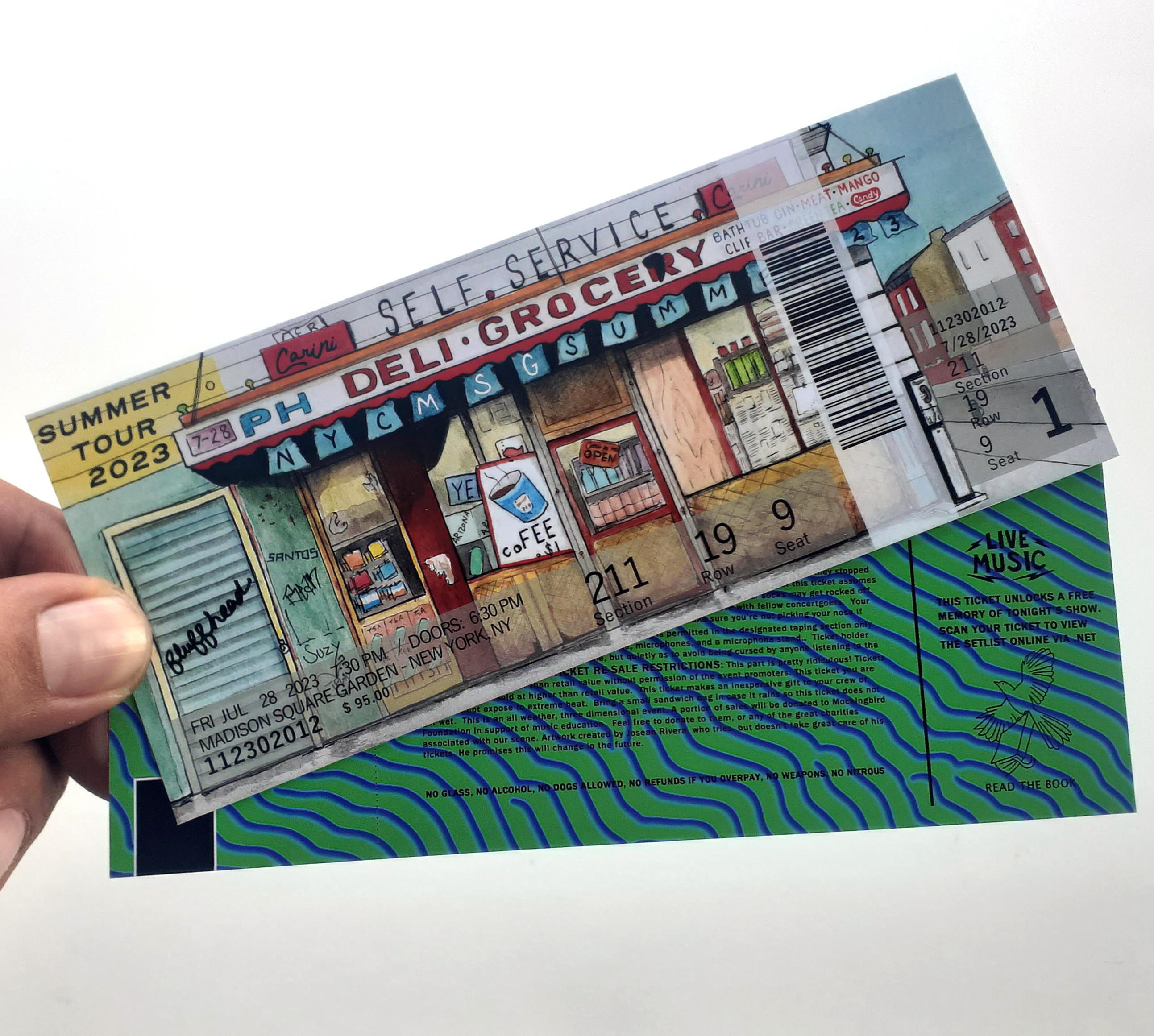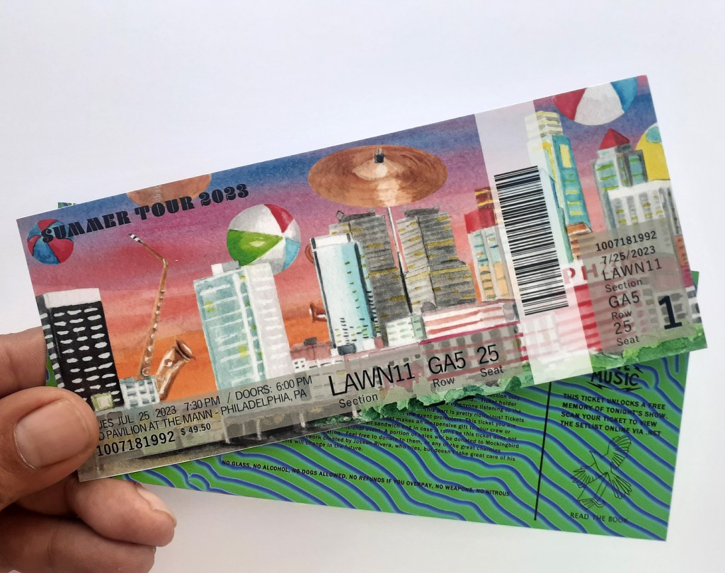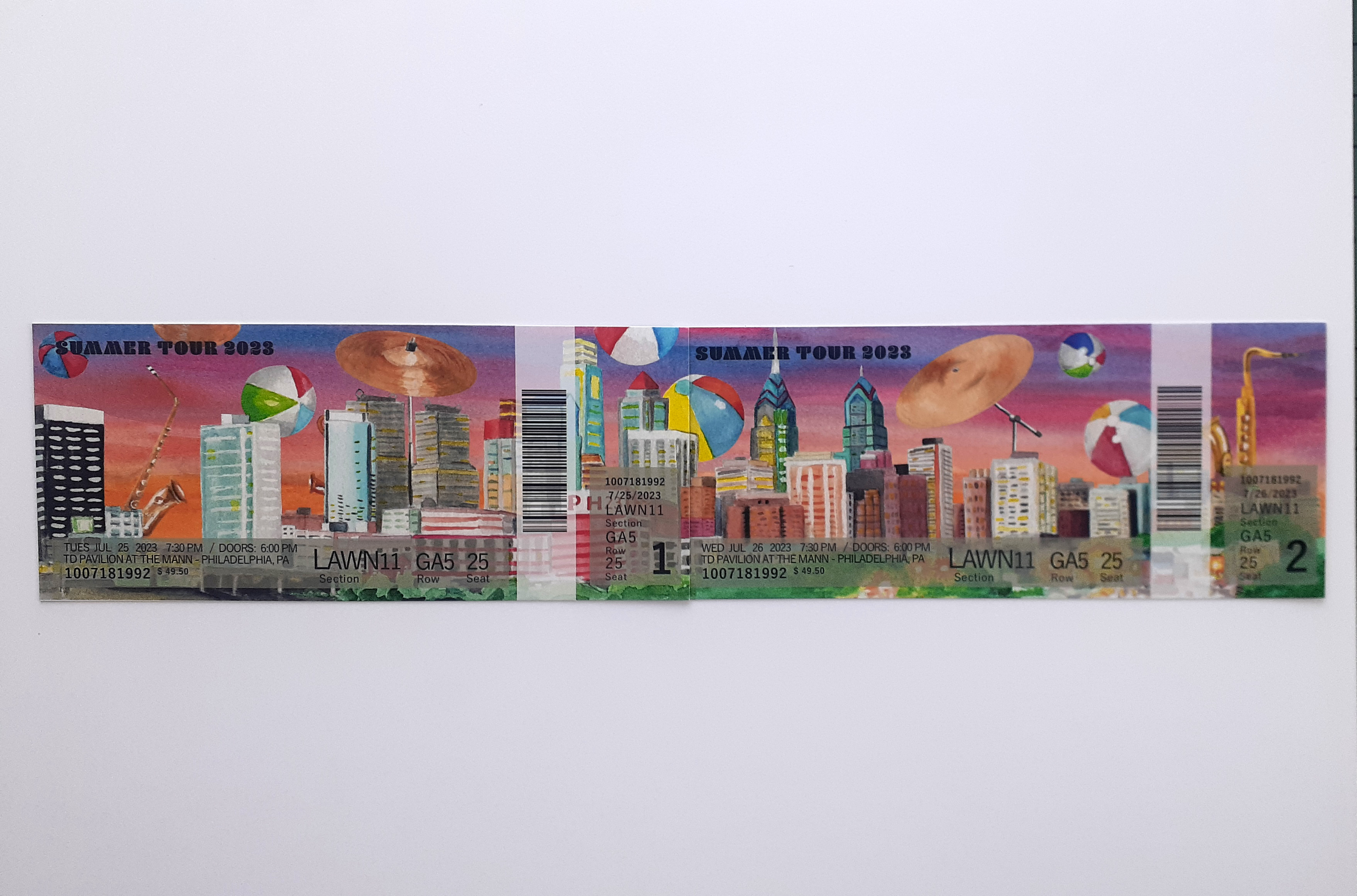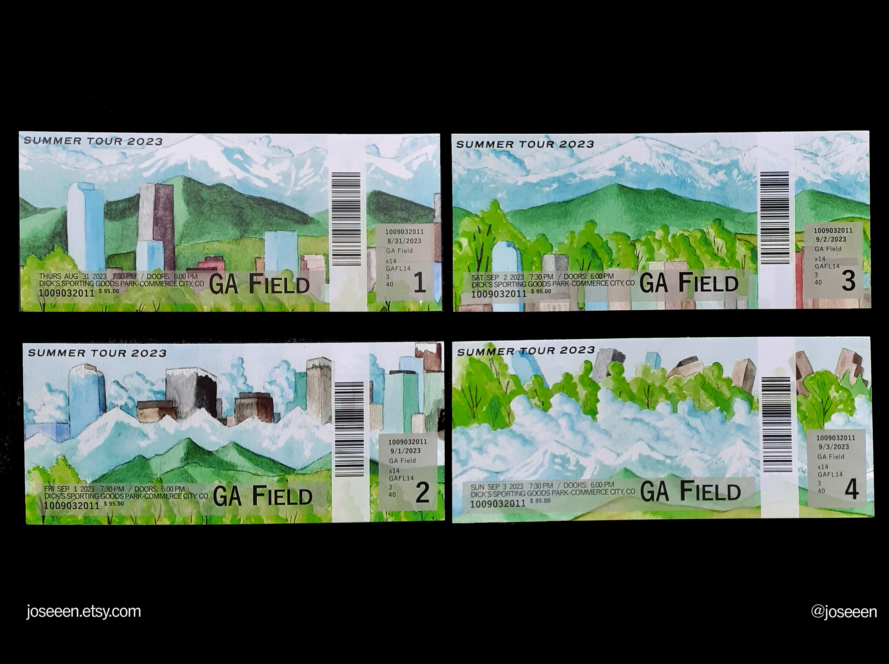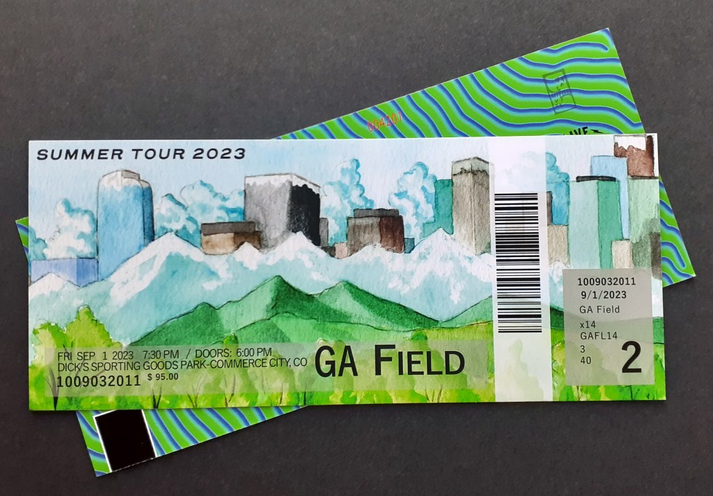 My commemorative ticket stubs for Phish’s 4-day run at Dick’s Sporting Goods Park in Commerce City, CO. The original art was watercolor on paper, which was then scanned to create the tickets. Inspired by PTBM (Phish tickets by mail) ticket stubs. The barcode actually scans and links to each night’s setlist on Phish.net!