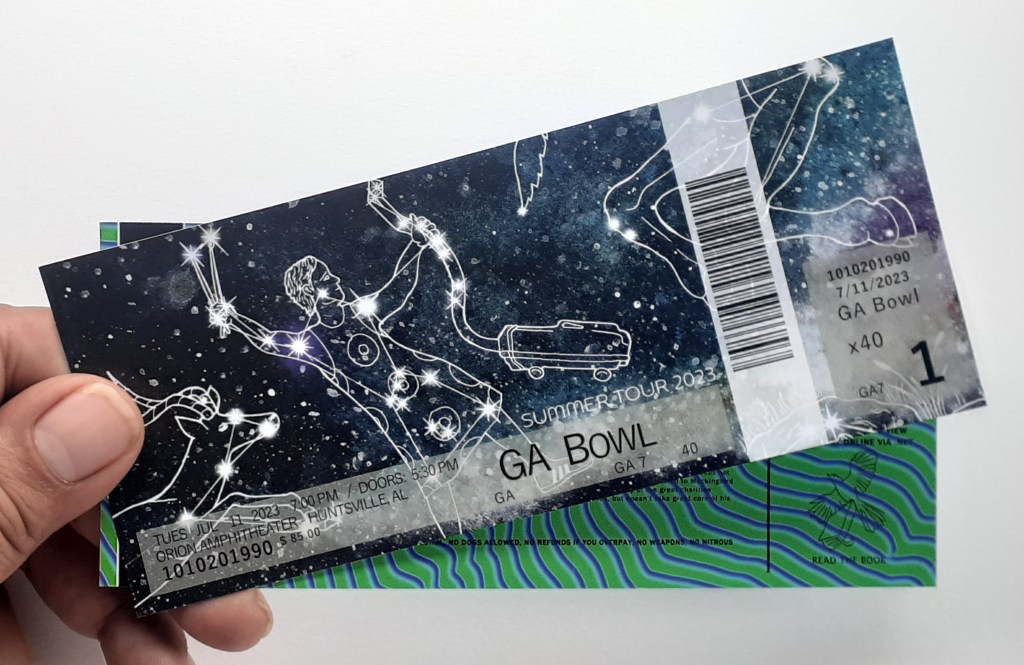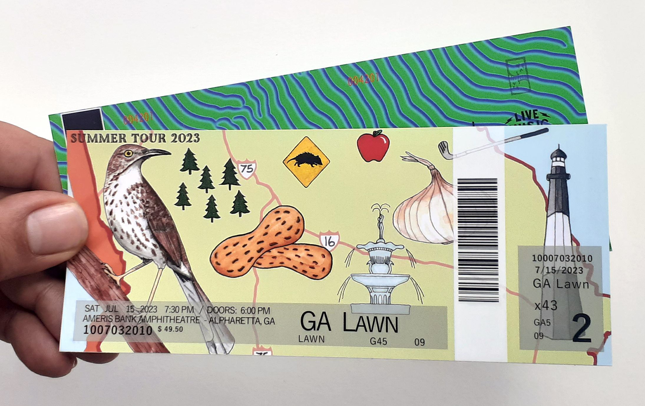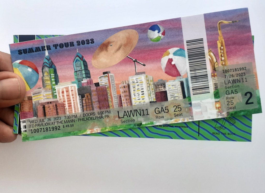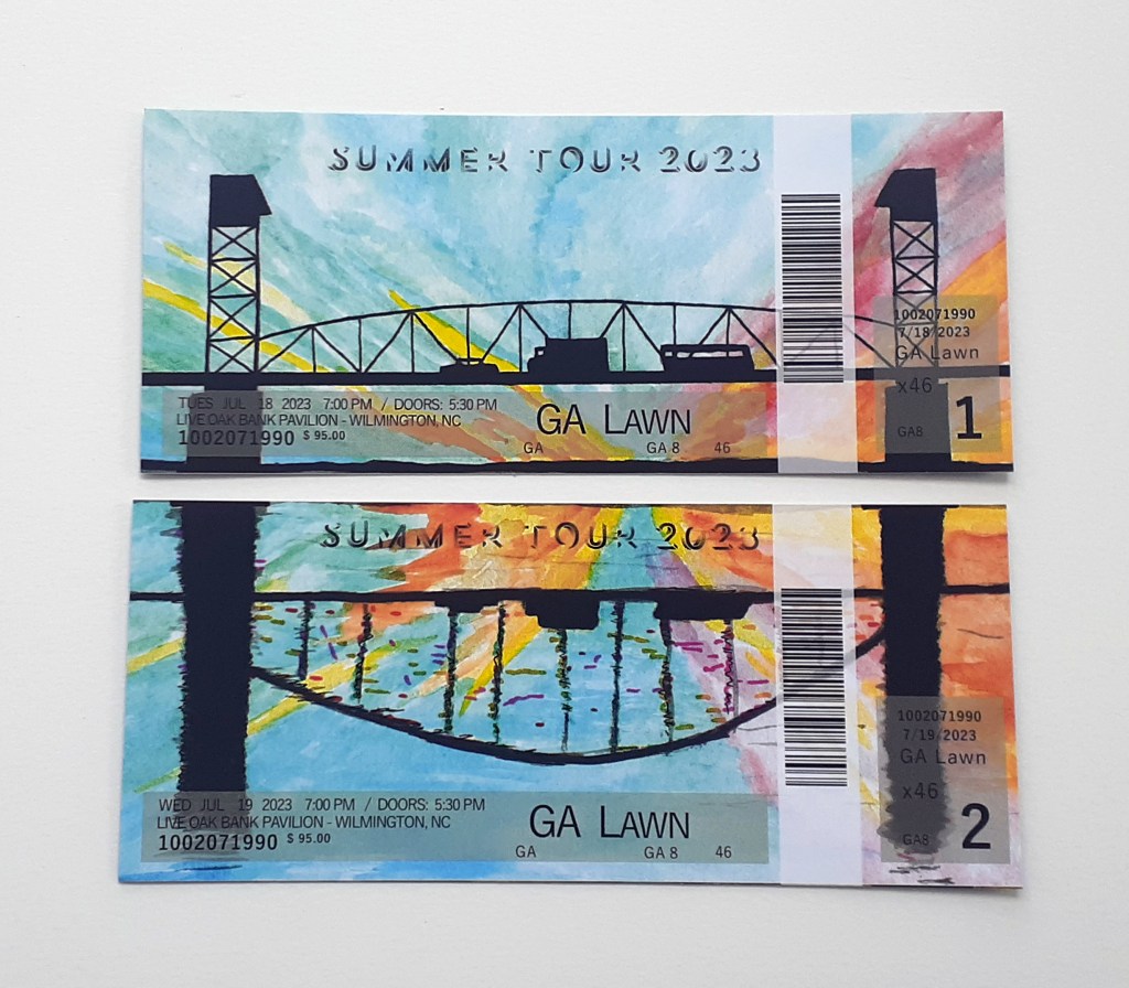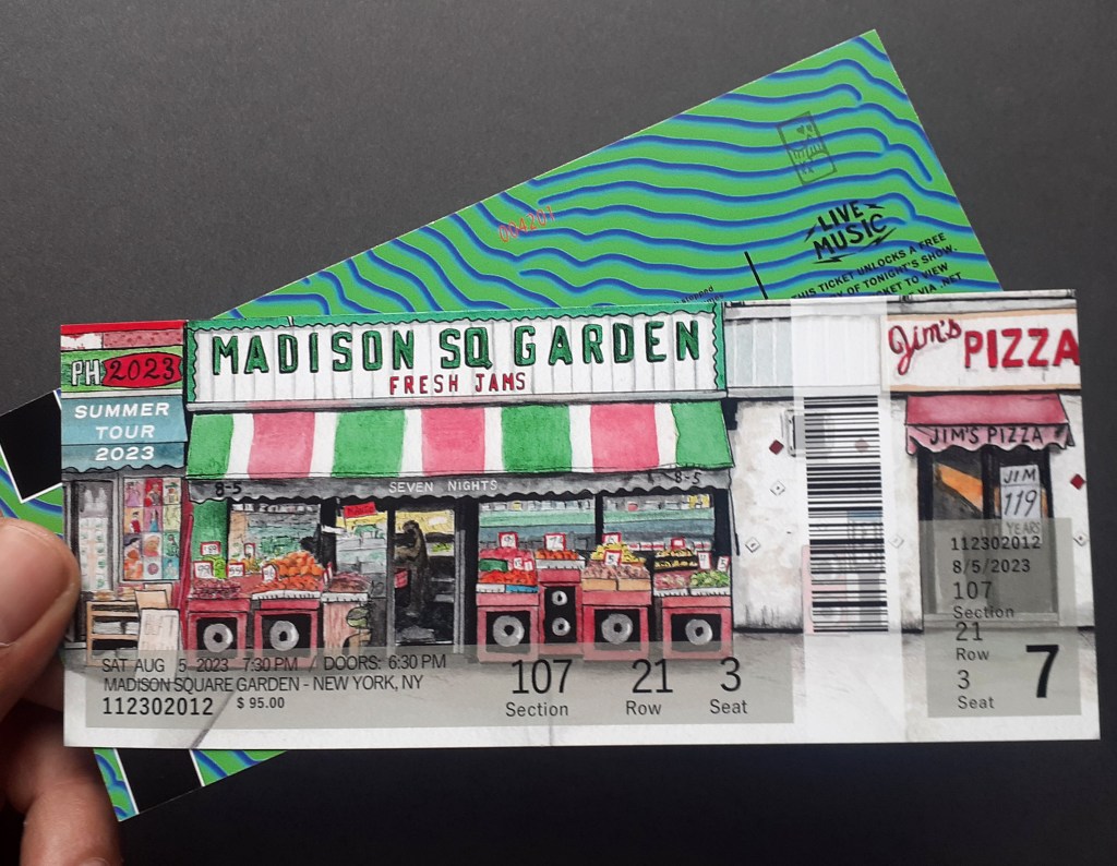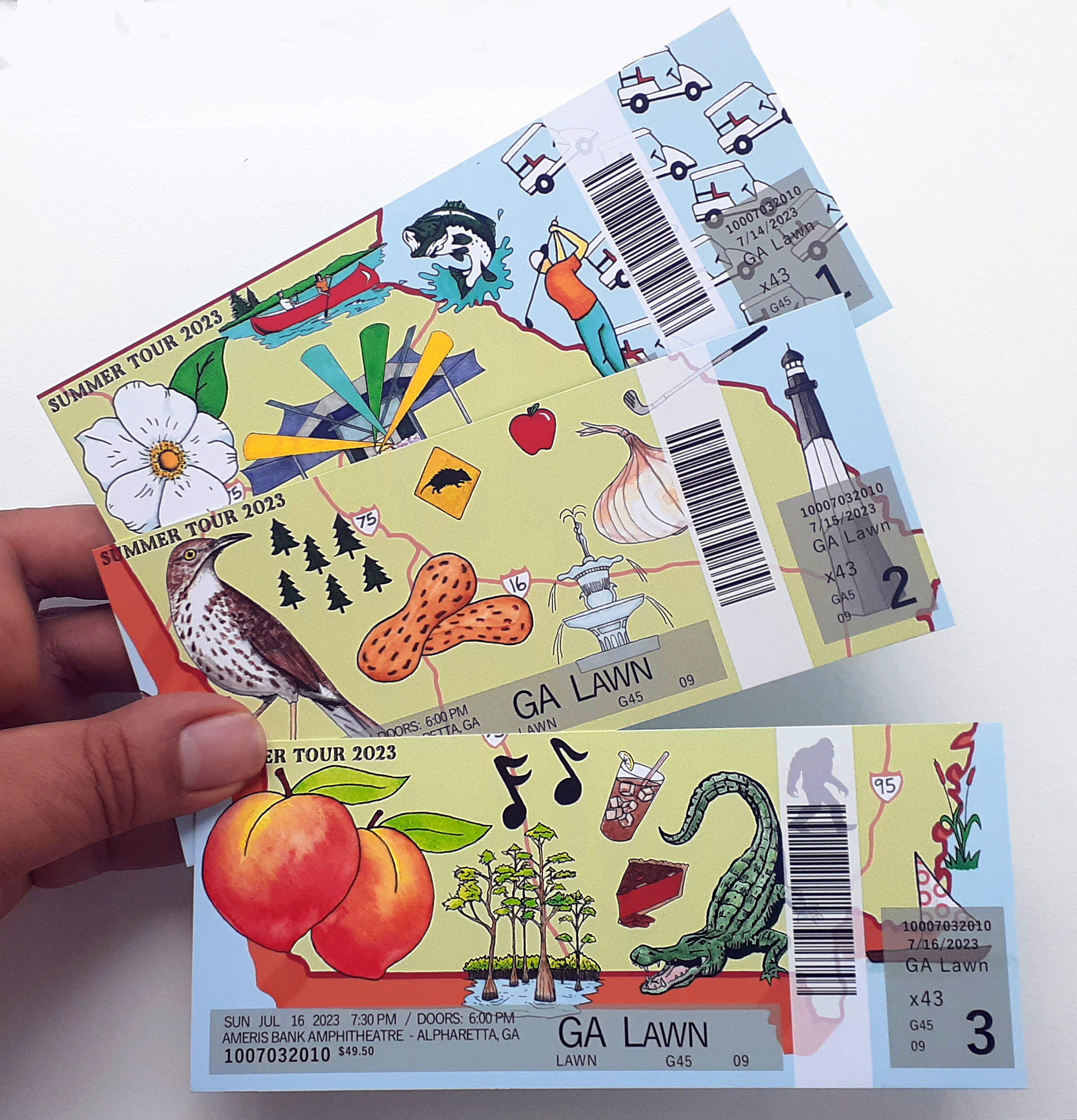 My commemorative ticket stubs for Phish’s 4-day run at Dick’s Sporting Goods Park in Commerce City, CO. The original art was watercolor on paper, which was then scanned to create the tickets. Inspired by PTBM (Phish tickets by mail) ticket stubs. The barcode actually scans and links to each night’s setlist on Phish.net!