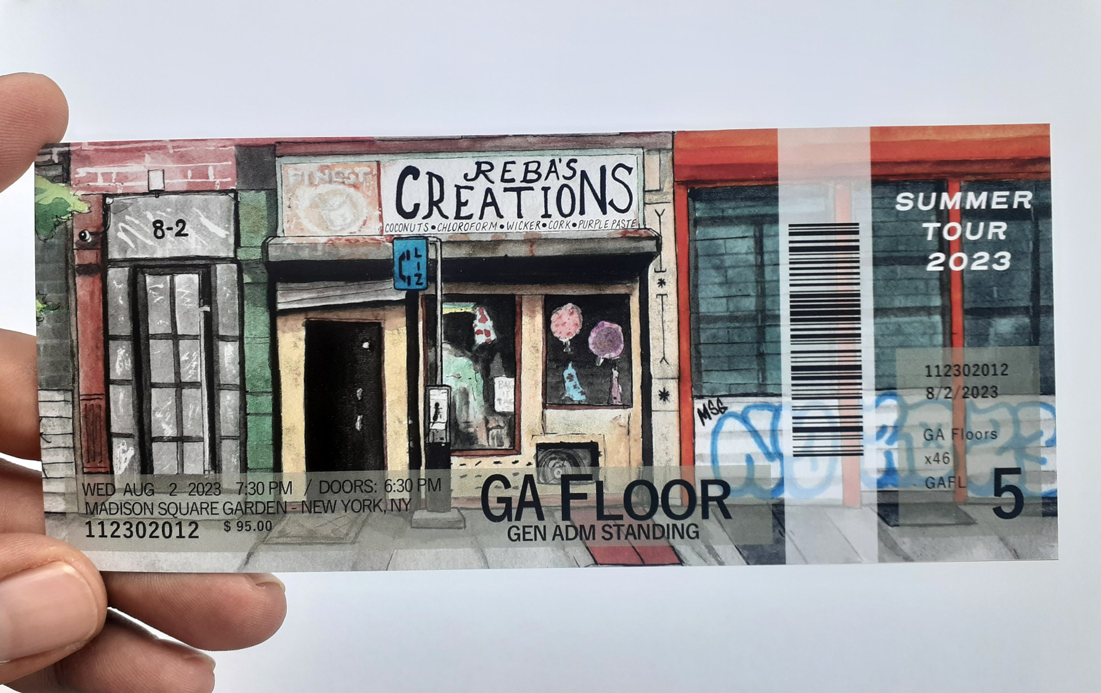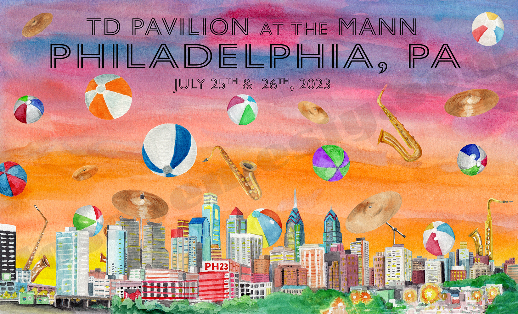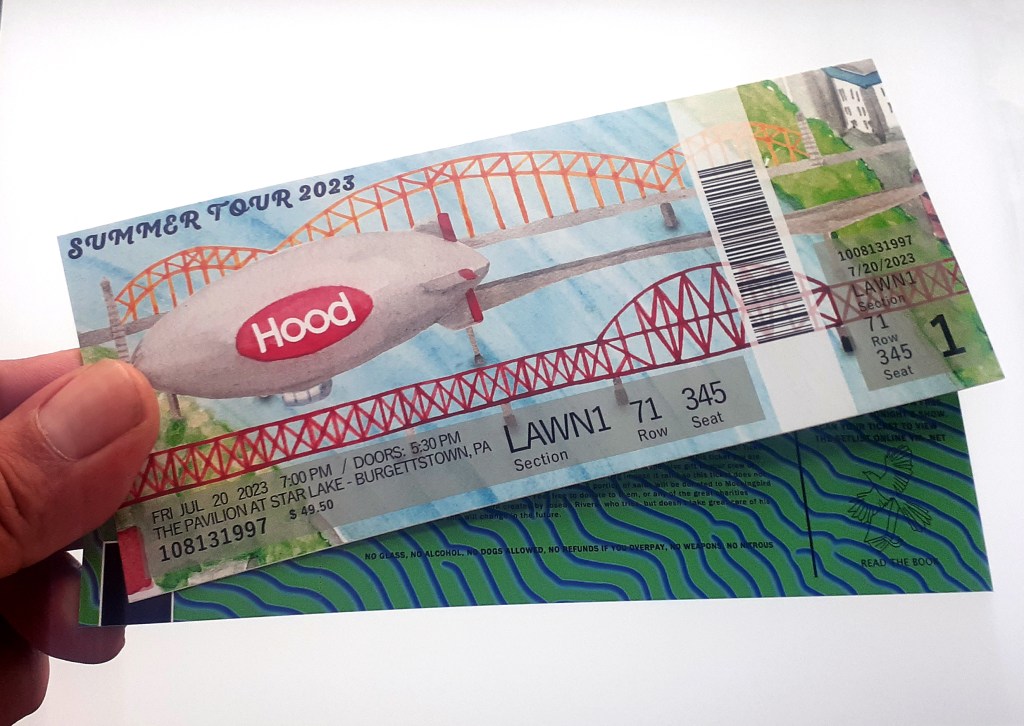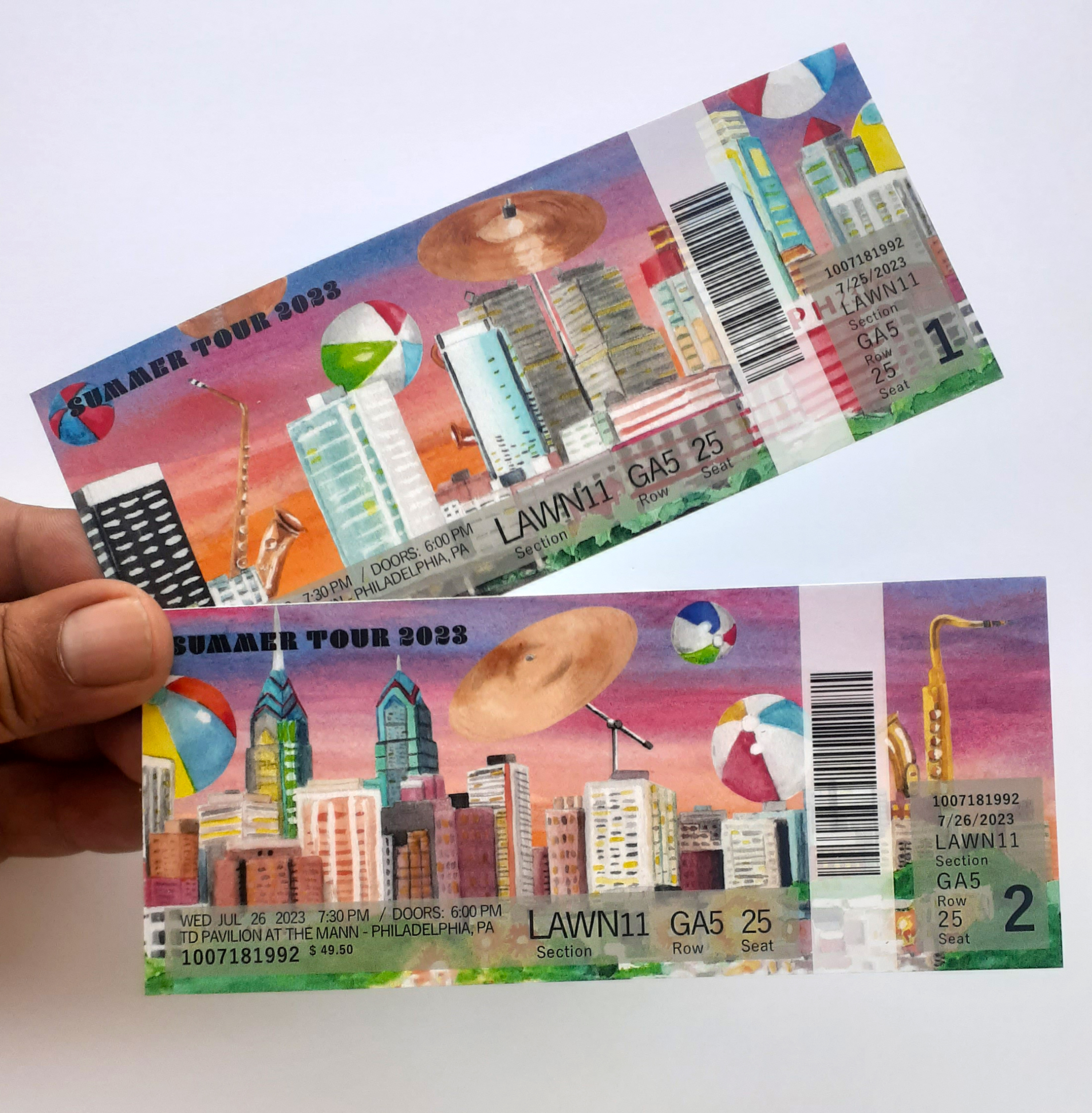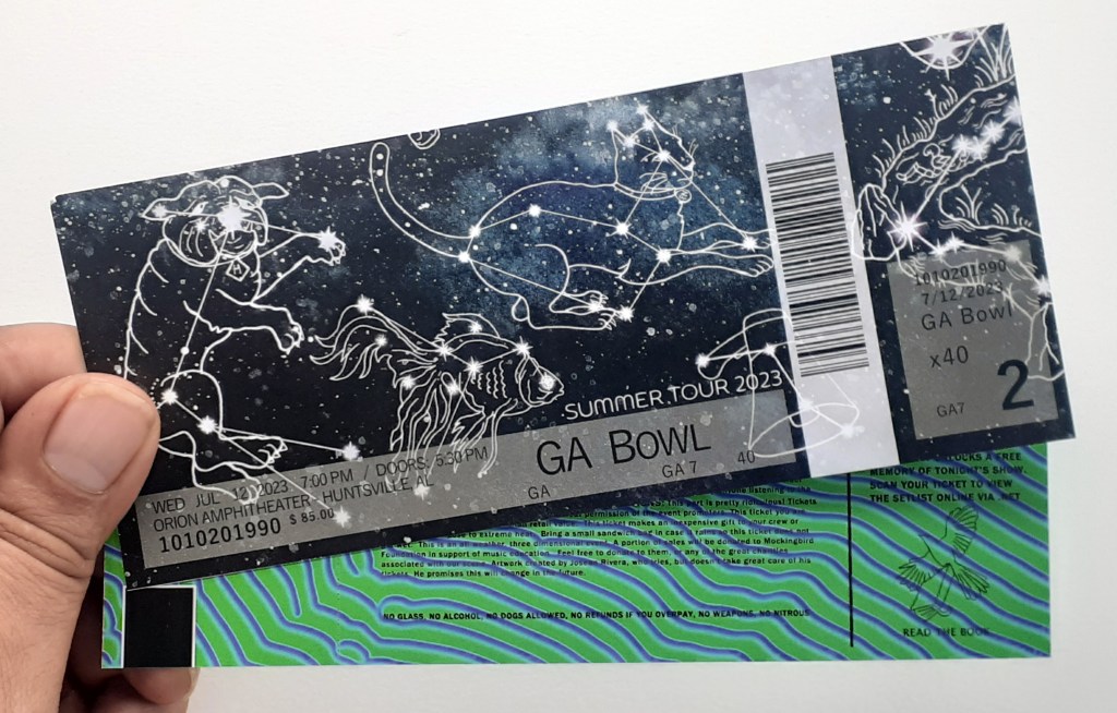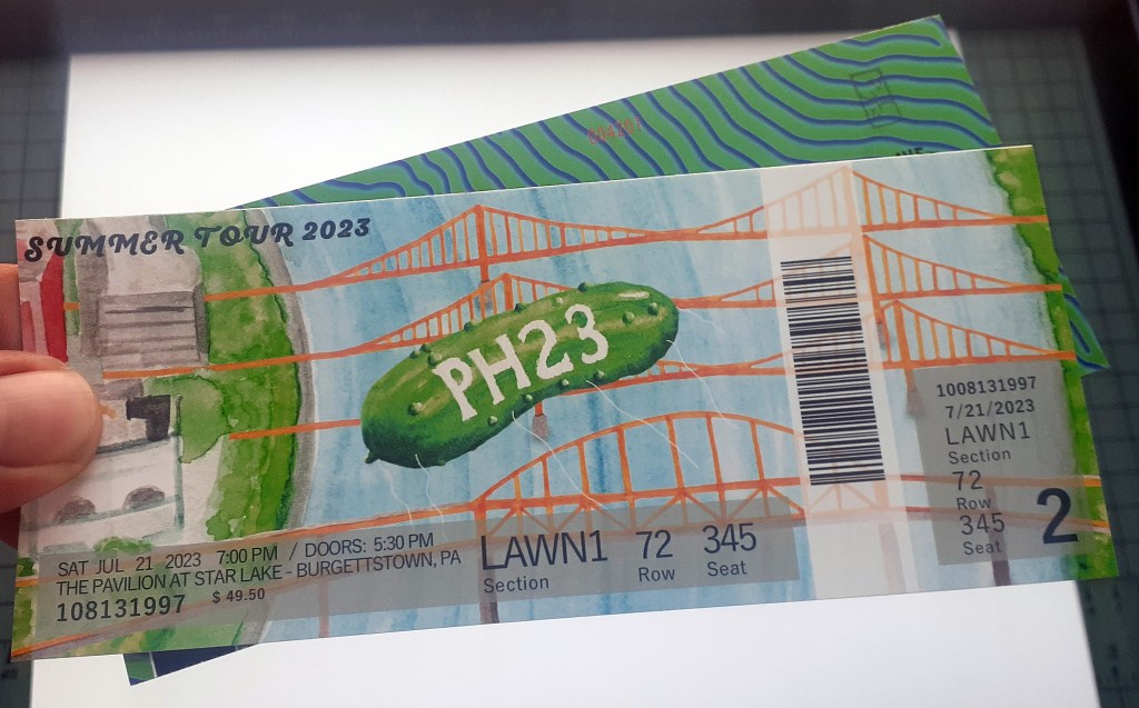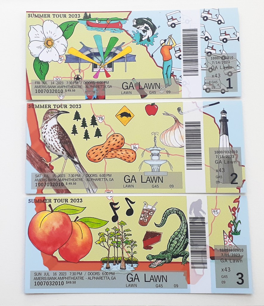 My commemorative ticket stubs for Phish’s 4-day run at Dick’s Sporting Goods Park in Commerce City, CO. The original art was watercolor on paper, which was then scanned to create the tickets. Inspired by PTBM (Phish tickets by mail) ticket stubs. The barcode actually scans and links to each night’s setlist on Phish.net!