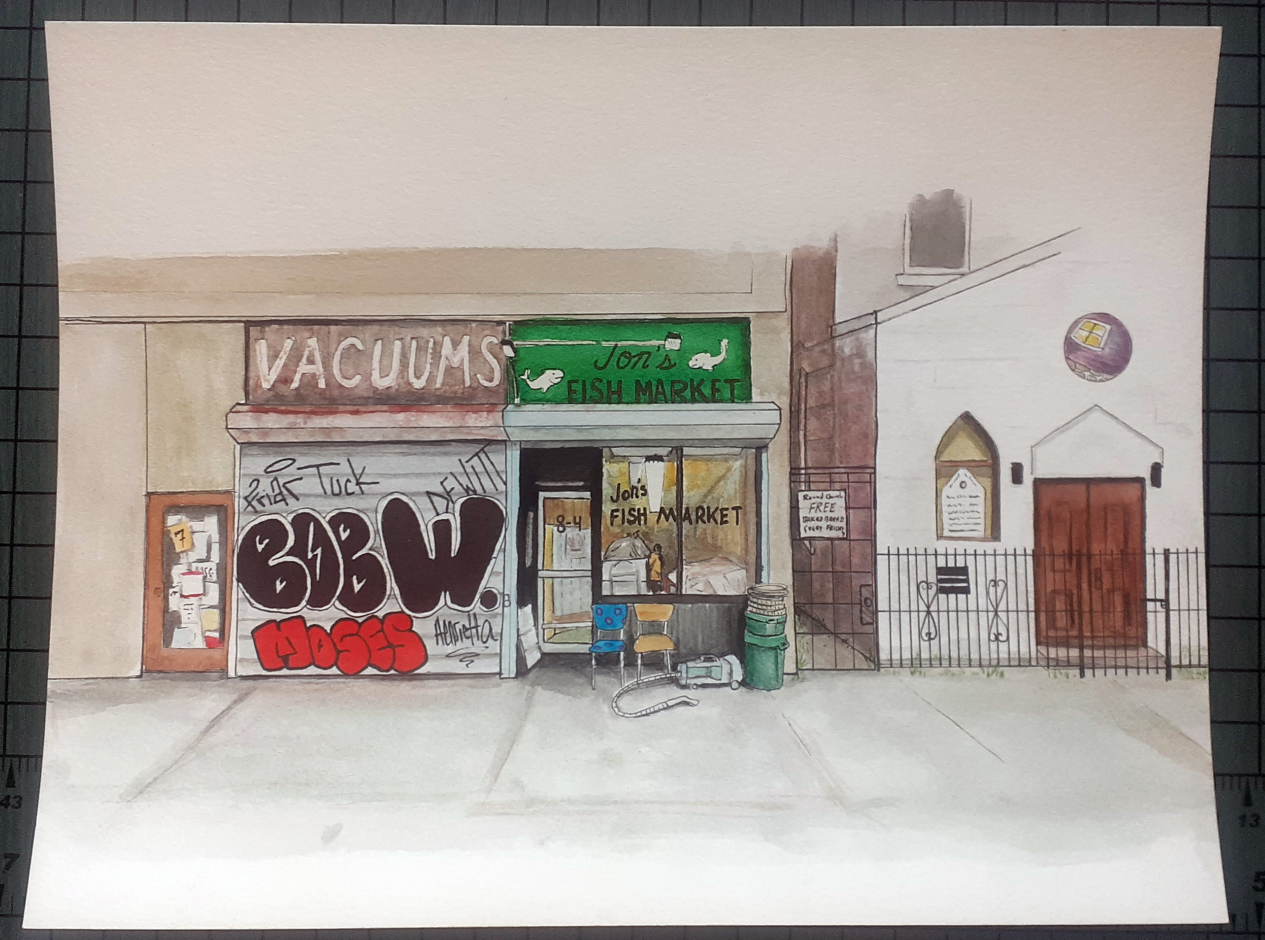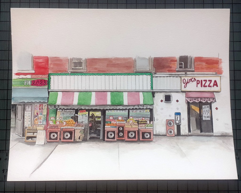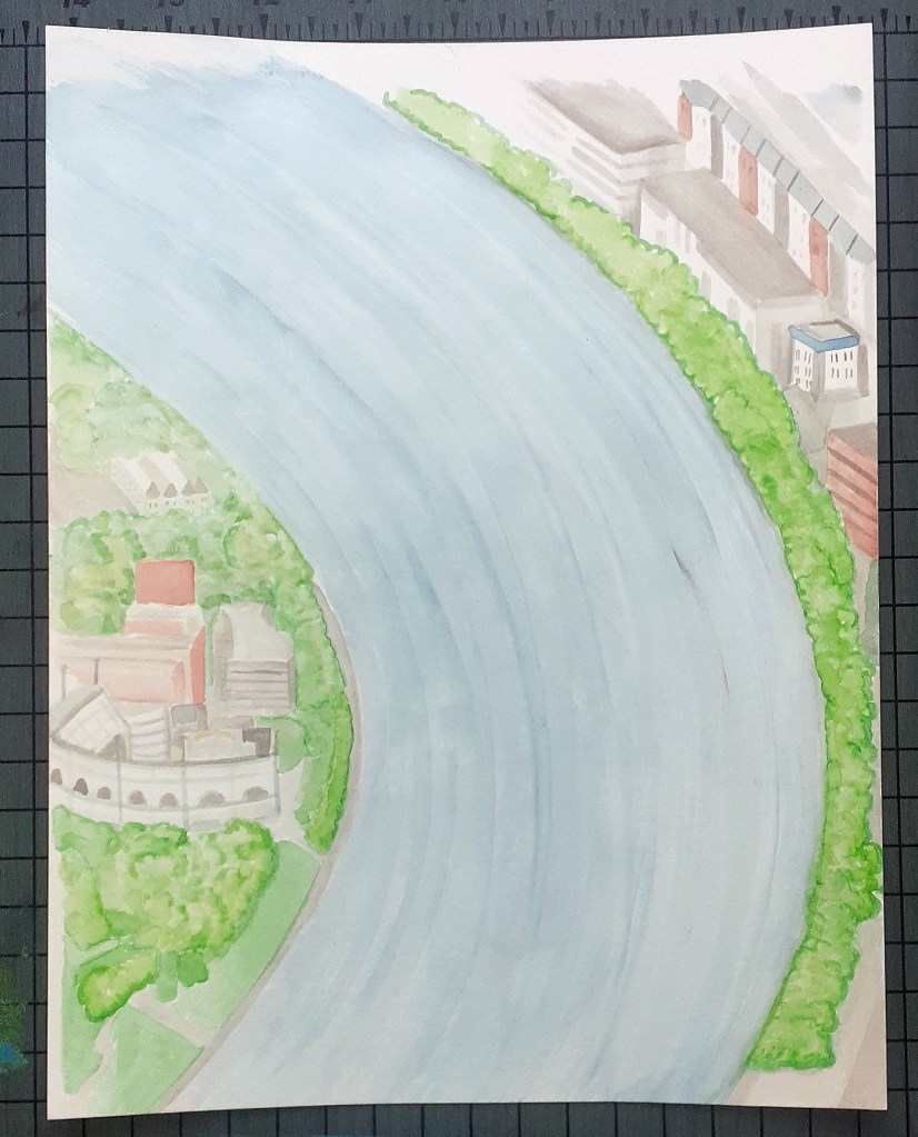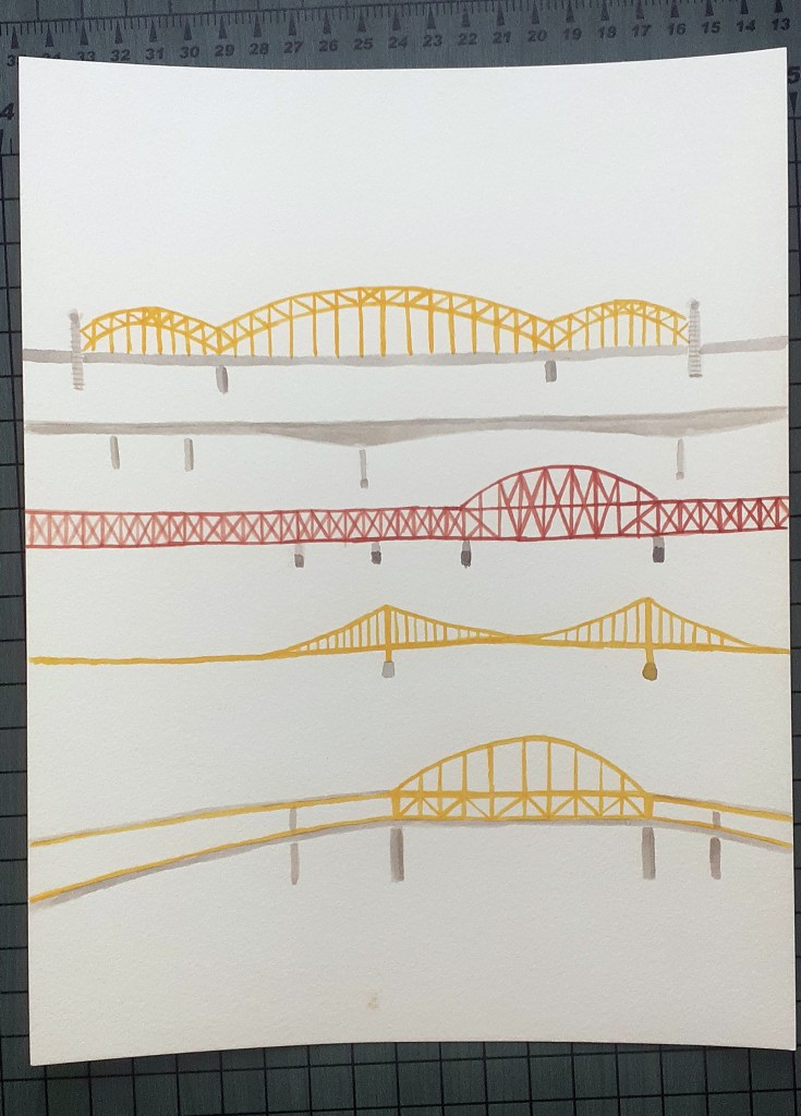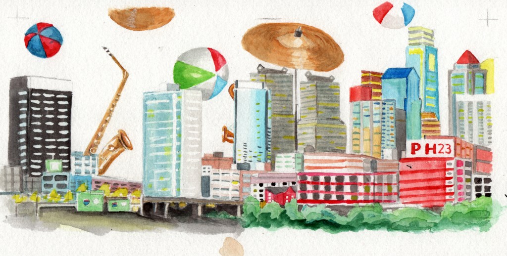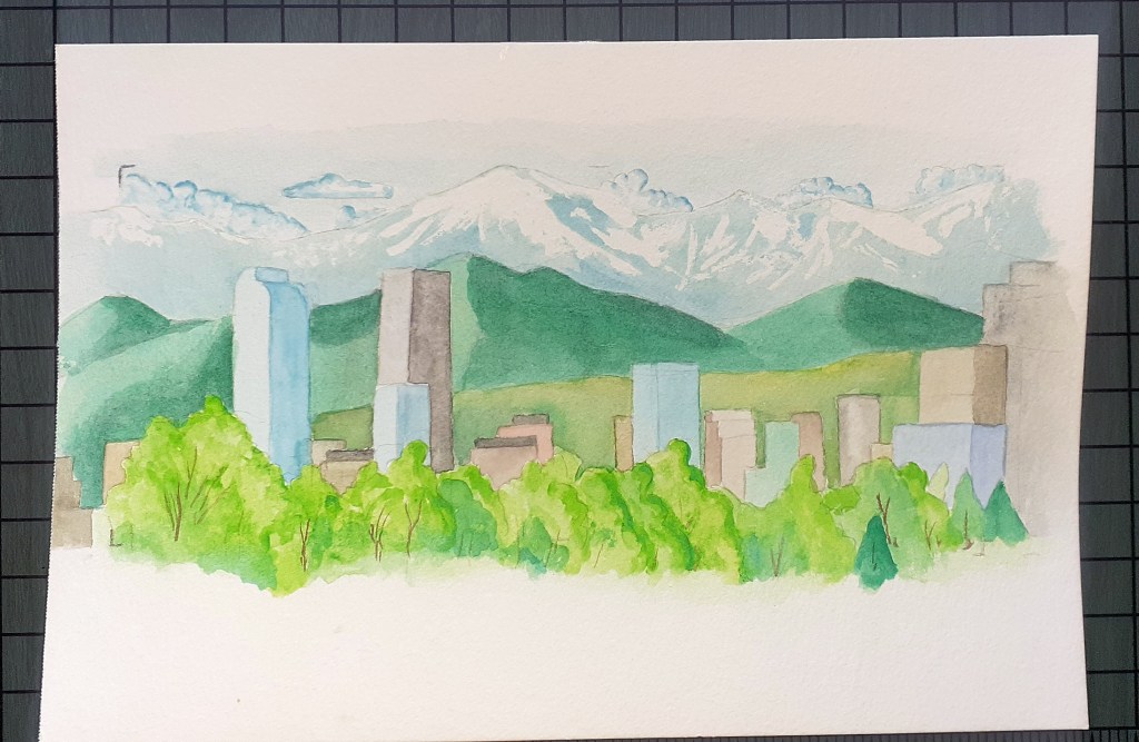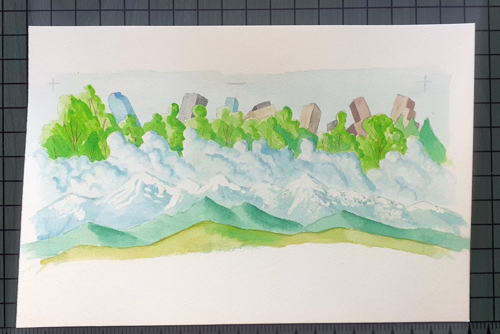 By the time I started working on these, my summer had ended and I was back to teaching. My free time was very limited, and the surprise of the SPAC shows threw my timeline off. In my search for inspiration, I was looking at pictures of the view of Denver from Commerce City. At this point, I was getting frustrated and in a state of artistic delirium, just thought “What if I replace the mountains with the buildings? What if I replace the clouds with buildings?” This amused me enough that I sketched up the possible scenarios and then created the paintings. Working on these was beneficial in dealing with the stress involved with a new school year. I must admit that I prolonged how long they took to complete since it was one of the things I looked forward to most when getting home from school, besides seeing my wife and cat!