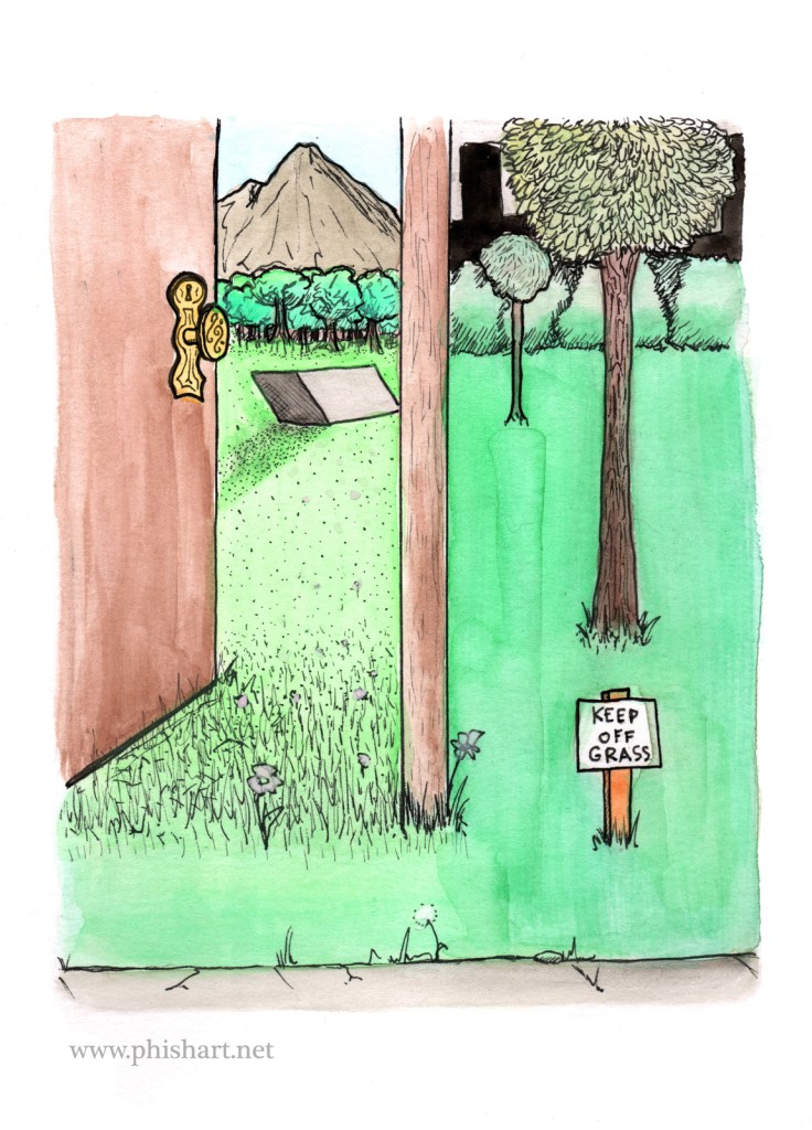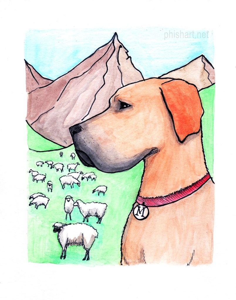 Once Phish reunited in 2009, I was regularly going to shows but wasn’t really creating too much artwork inspired by them. By 2012 I was making spray-painted canvas panels of antelope crossing signs that I would sell while walking around the lots before shows. In 2013 I decided to begin illustrating Phish songs. Each painting was mixed media on 8.5×11 paper. I had intended to draw the rest of the songs in the same framed design, but never got a chance to finish them.