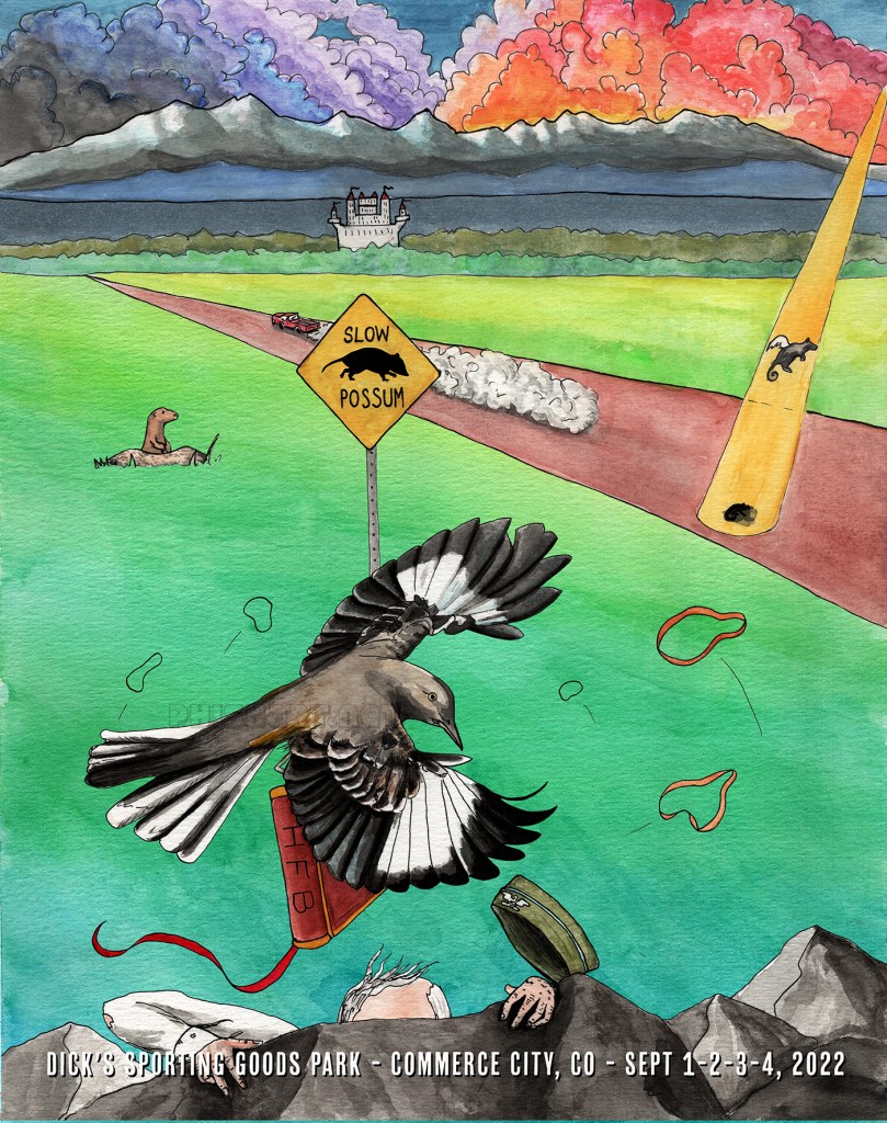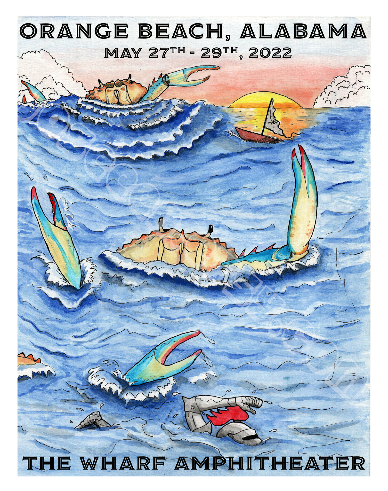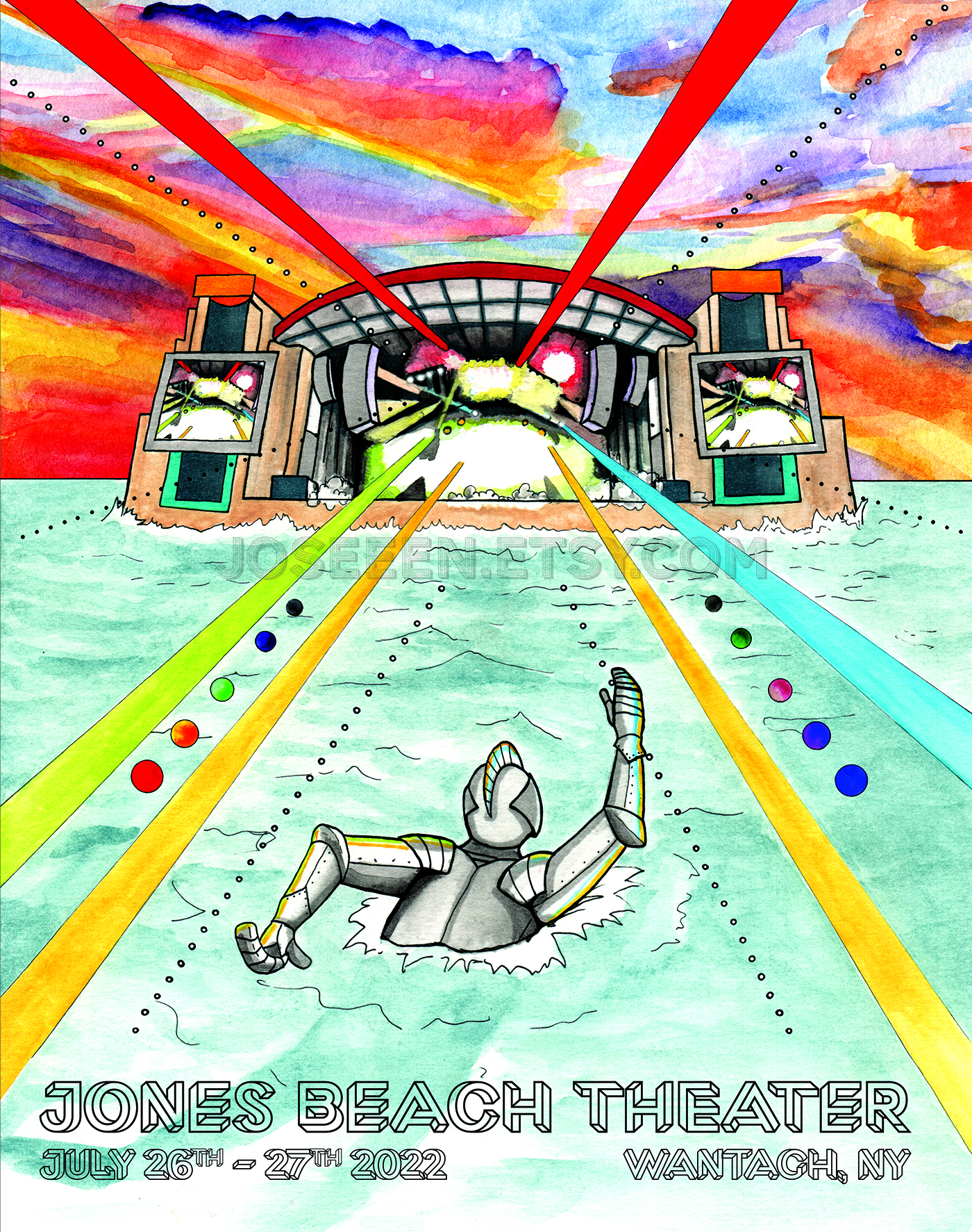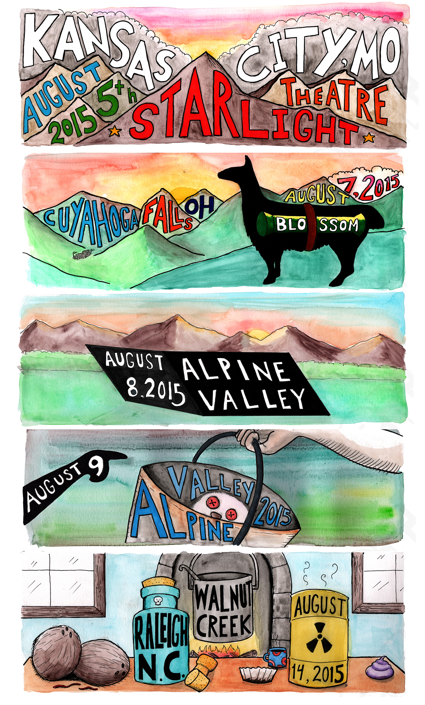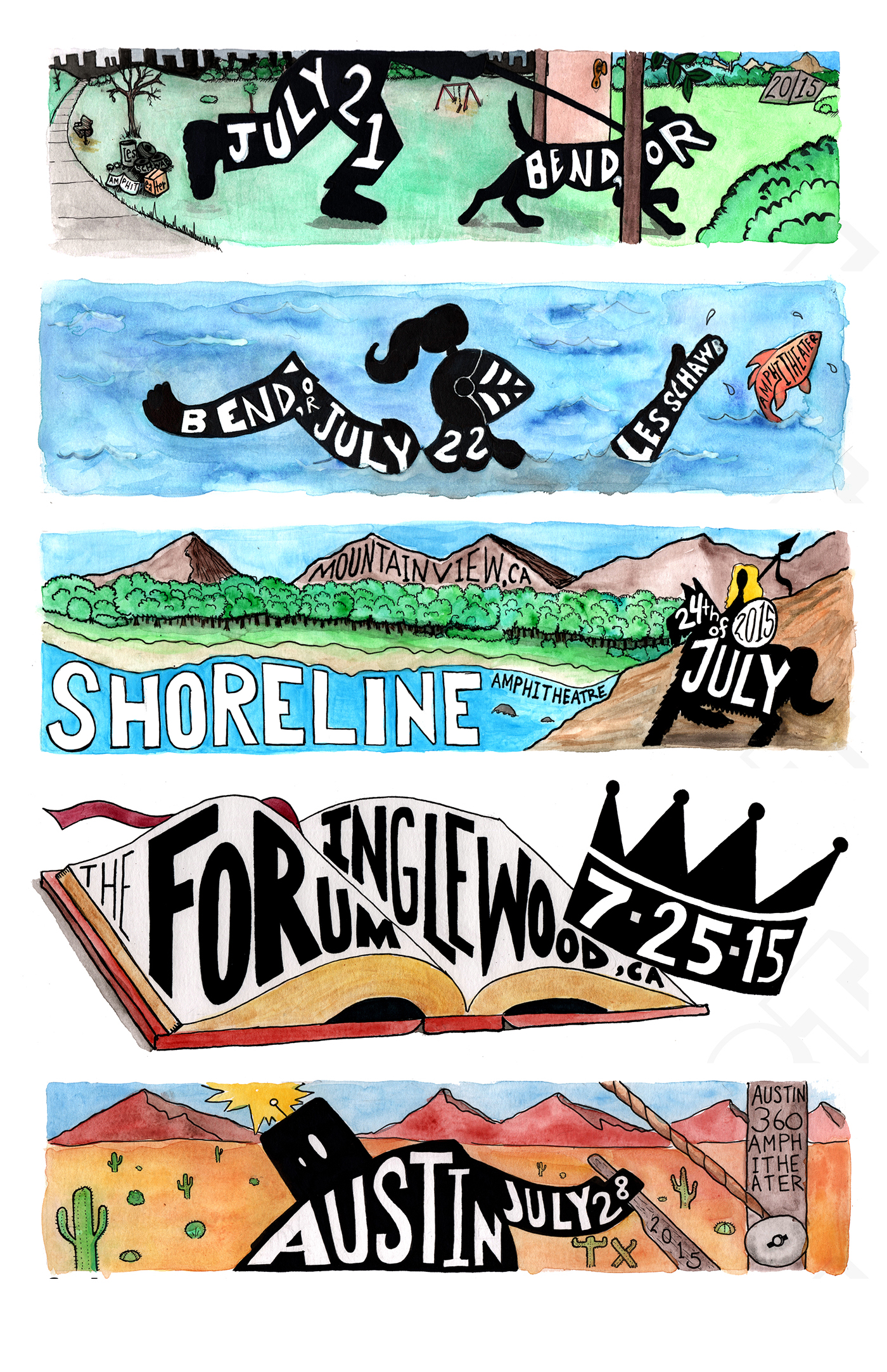 In 2015 I focused mainly on my illustrated setlists, which had gained traction shortly after being introduced the year before. I started doing more of them with physical ink and watercolor, with the previous year’s setlist art being mainly ink drawings that were digitally colored. For that year’s summer tour setlist art, I decided to create the headers as illustrations inspired by Gamehendge songs. They were challenging to create, but a lot of fun figuring out how to approach the songs in a different way than I had done previously.