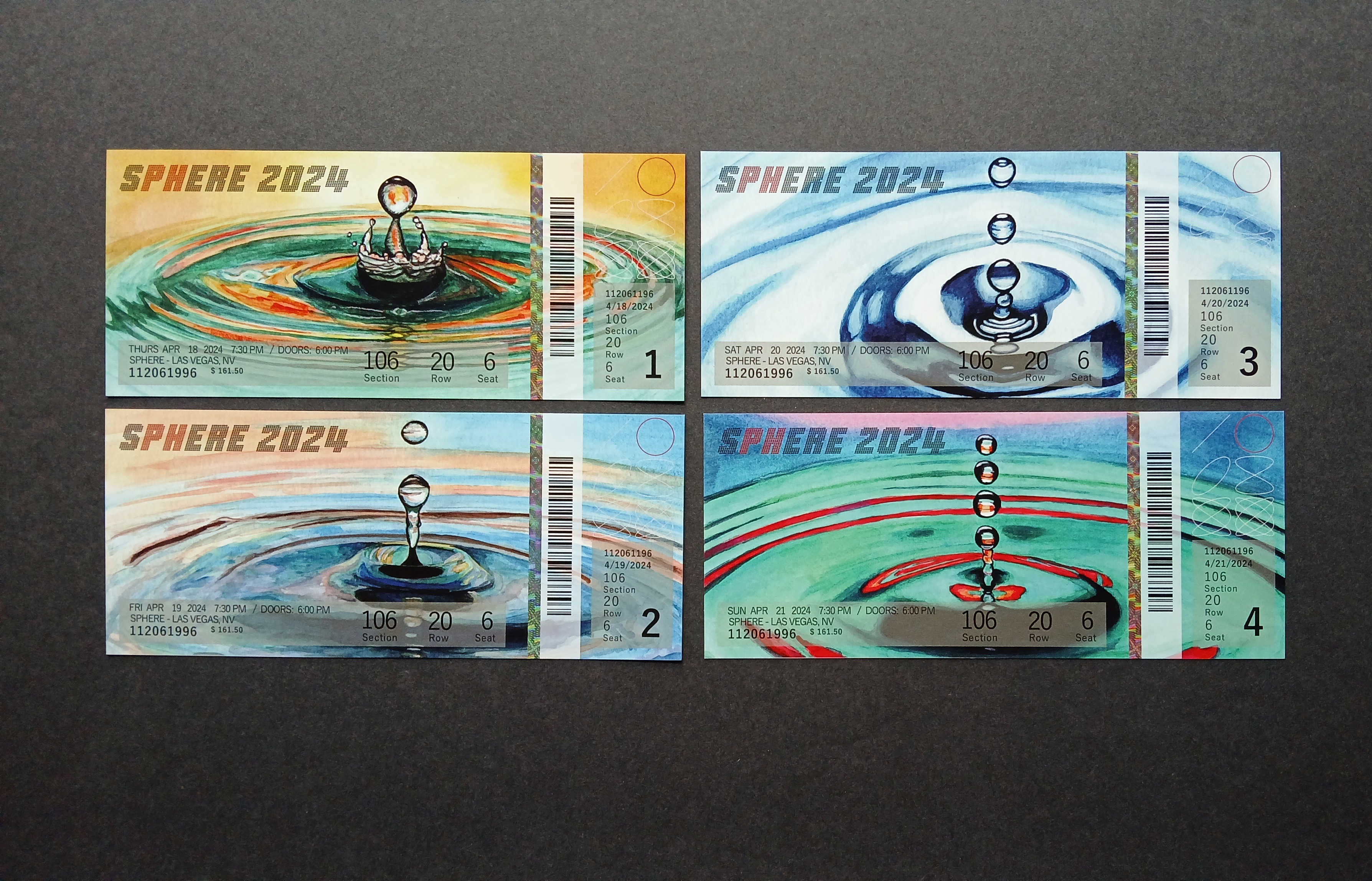I’m excited to share the commemorative ticket stubs I created for the upcoming Phish Sphere run in Las Vegas. Each stub measures 2.75×6.5 inches (The same size as PTBM tickets) and is printed on 130lb gloss paper (slightly thicker than actual stubs), printed by Fireball Printing in Philadelphia. Tickets are available individually, pick 2 or 3, or as a full set.