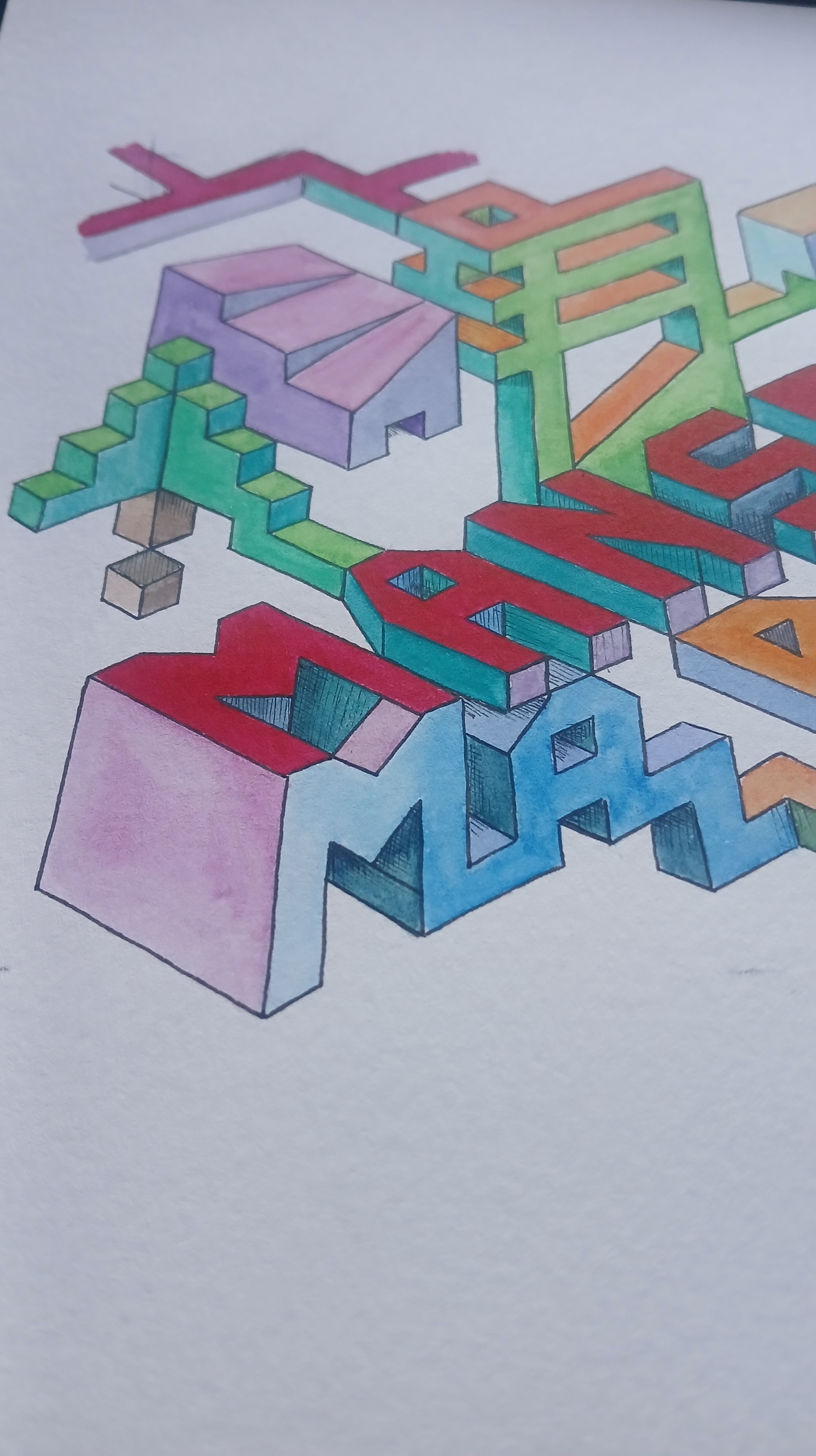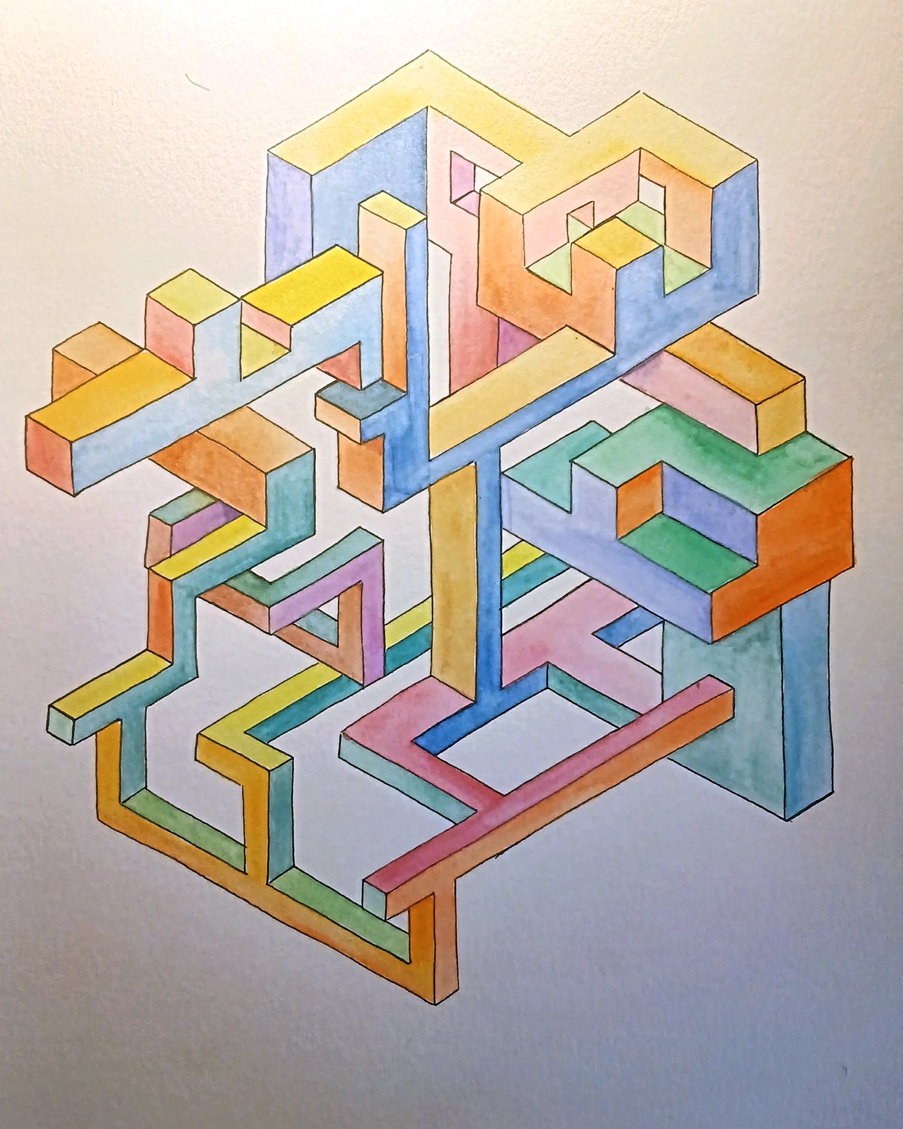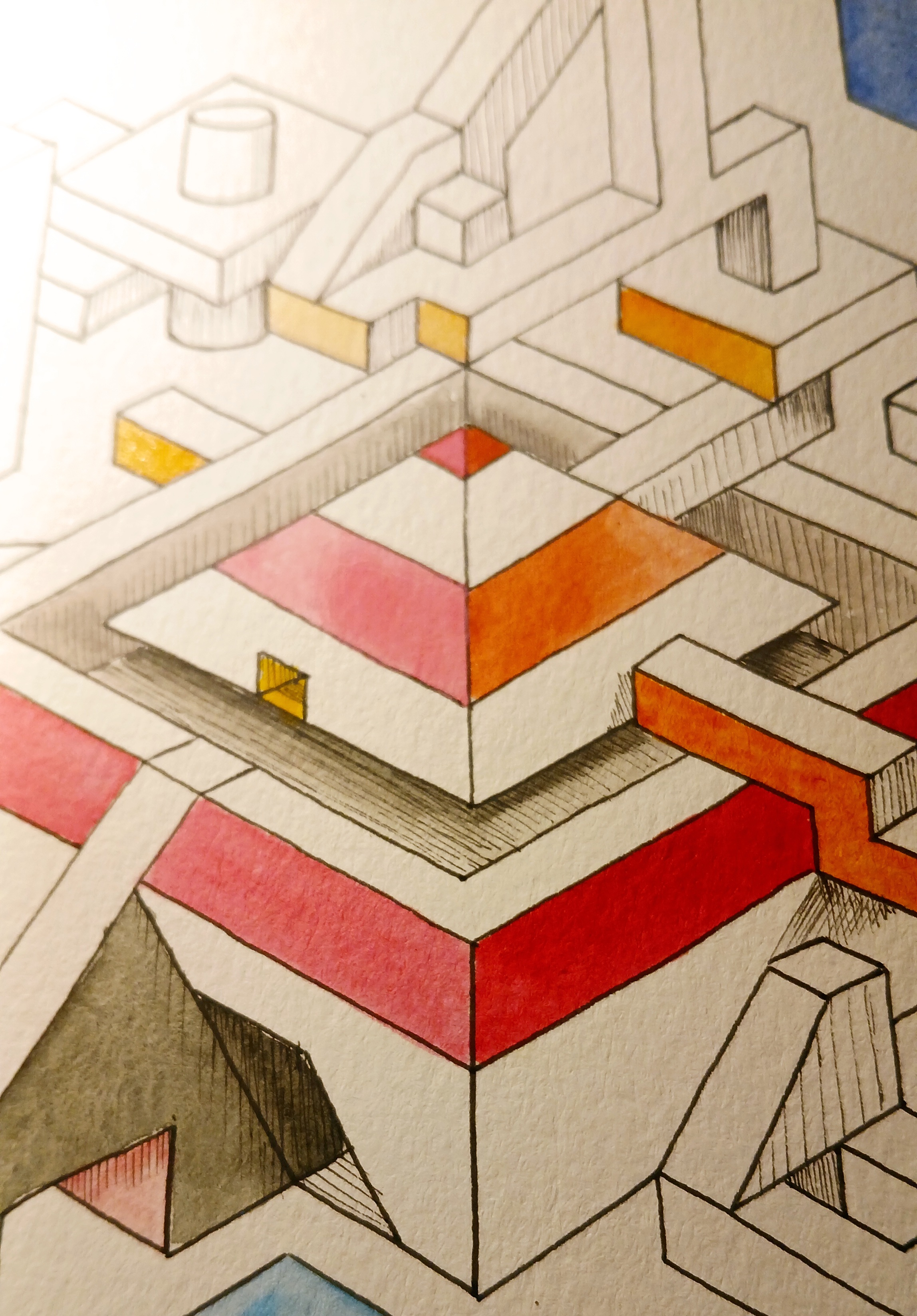 I was inspired by isometric drawings for this tour, which I had known about for a while, but never really drawn. During our annual standardized testing time, I found myself without a classroom and subjugated to “art on a cart”. I had to find something simple that students could work on in their classroom, and in some cases quietly since other students may still be testing. While most had a tough time doing the activities, it made sense to a few, who promptly demanded more challenging drawings to do. This had me researching and creating isometric drawings for worksheets. Something I noticed was how much I enjoyed drawing them. It felt like a challenging puzzle that was also a relaxing activity.