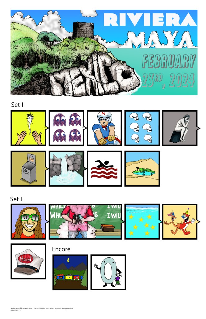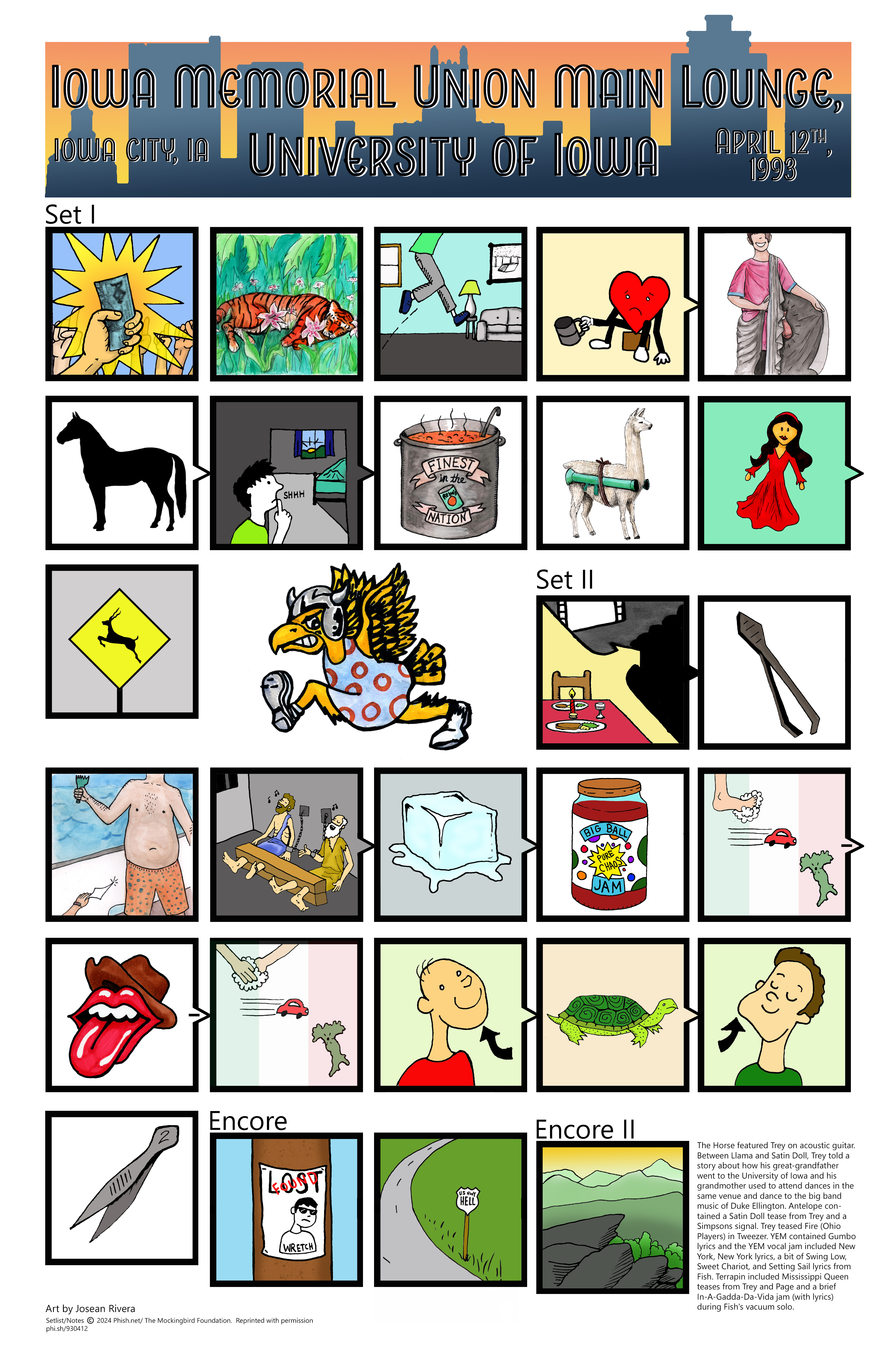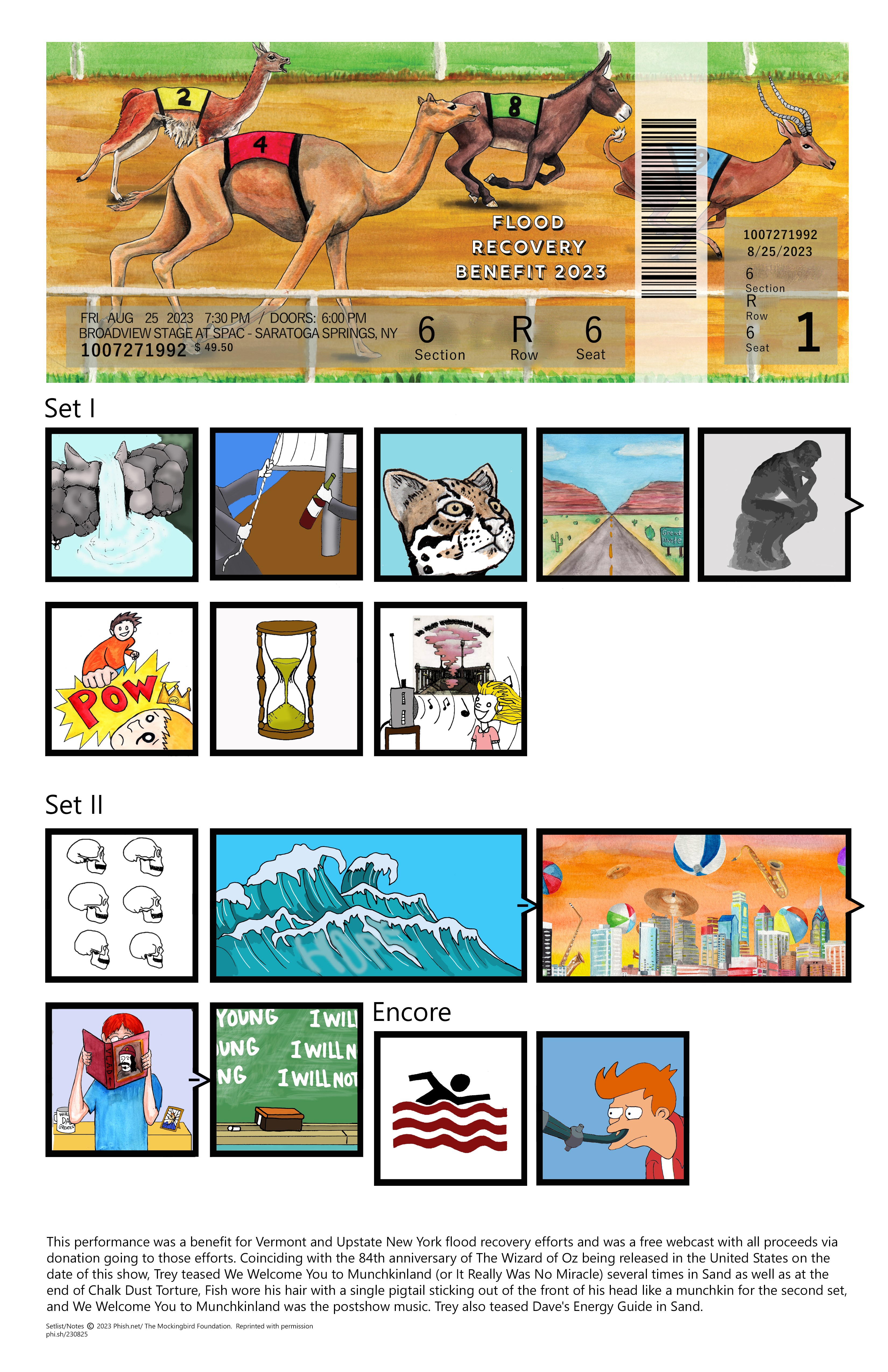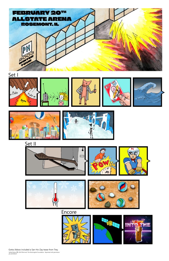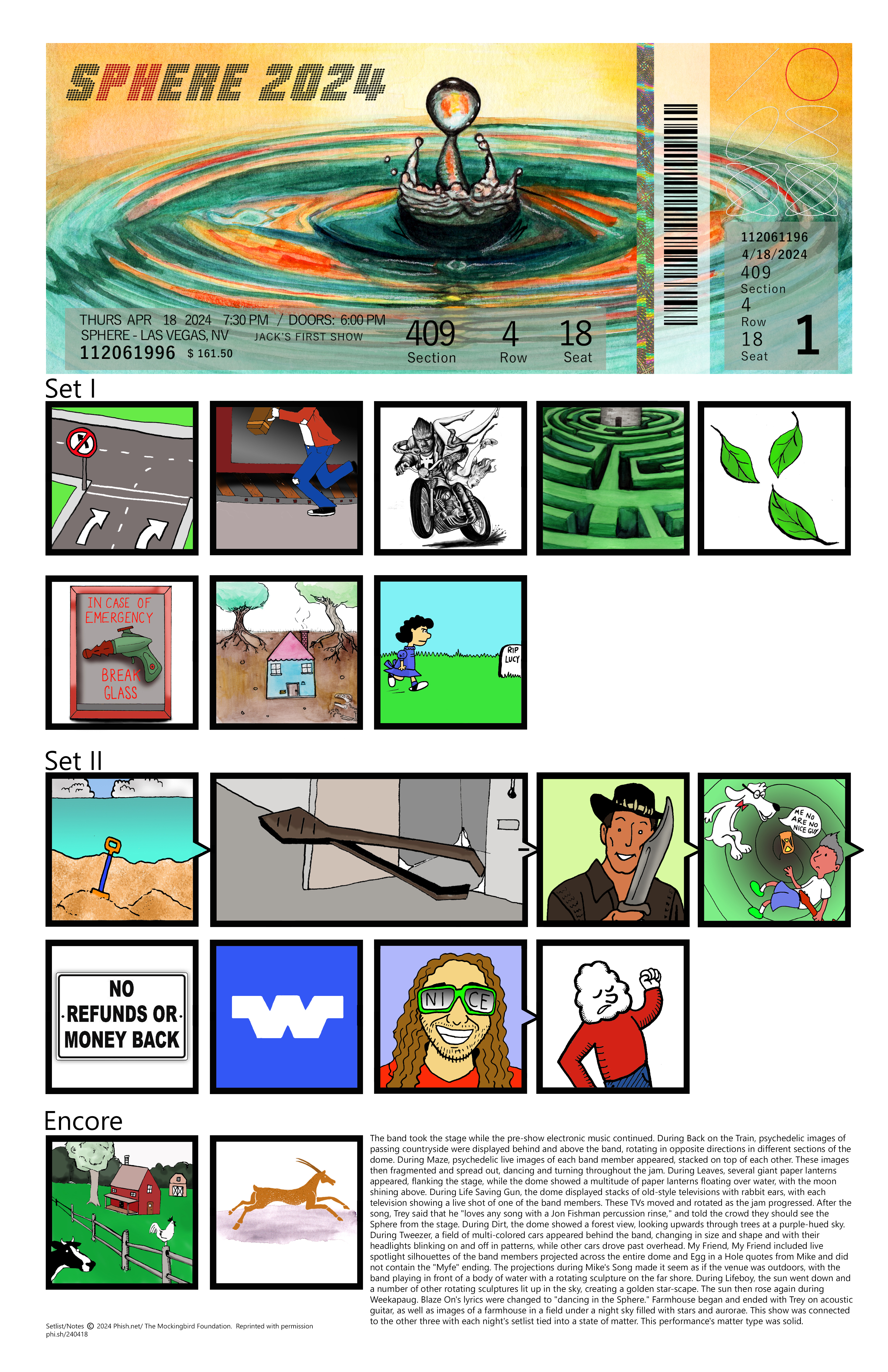 As I finish off my third year of creating commemorative Phish ticket stubs, I still enjoy creating illustrated setlists of shows. I usually keep commissions open for setlists of past shows throughout the year, with 9 commissioned setlists created this year. These commissions allow me to listen to shows for the first time, or revisit others. I also get to hear about someone’s first/ show, or in one case, how someone lost their glasses at a show, only for Fishman to be the one who found them!