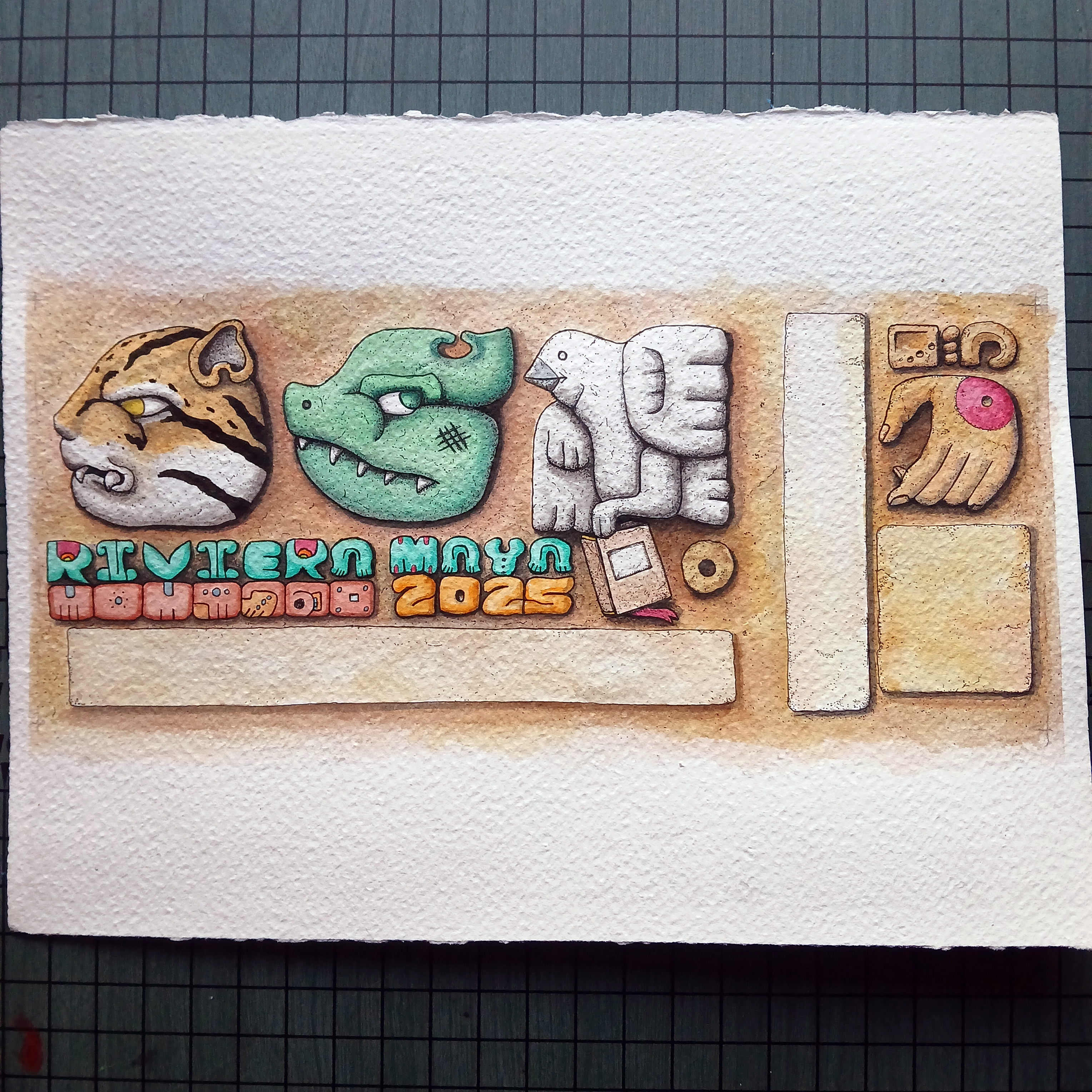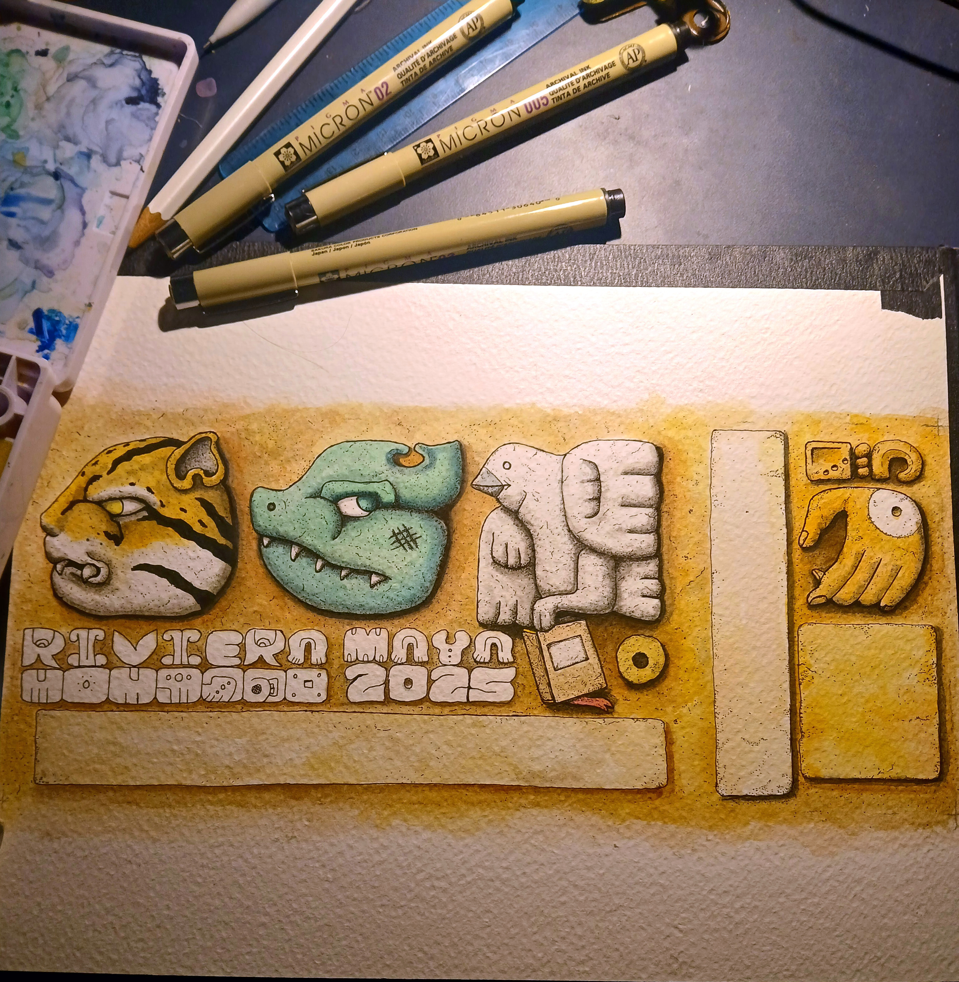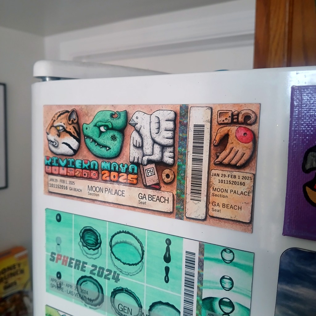 I’m excited to share my commemorative event tickets and magnets for Phish’s 2025 Riviera Maya shows. The art was inspired by Mayan glyphs and pottery. The original art was created using micron pens and watercolor.