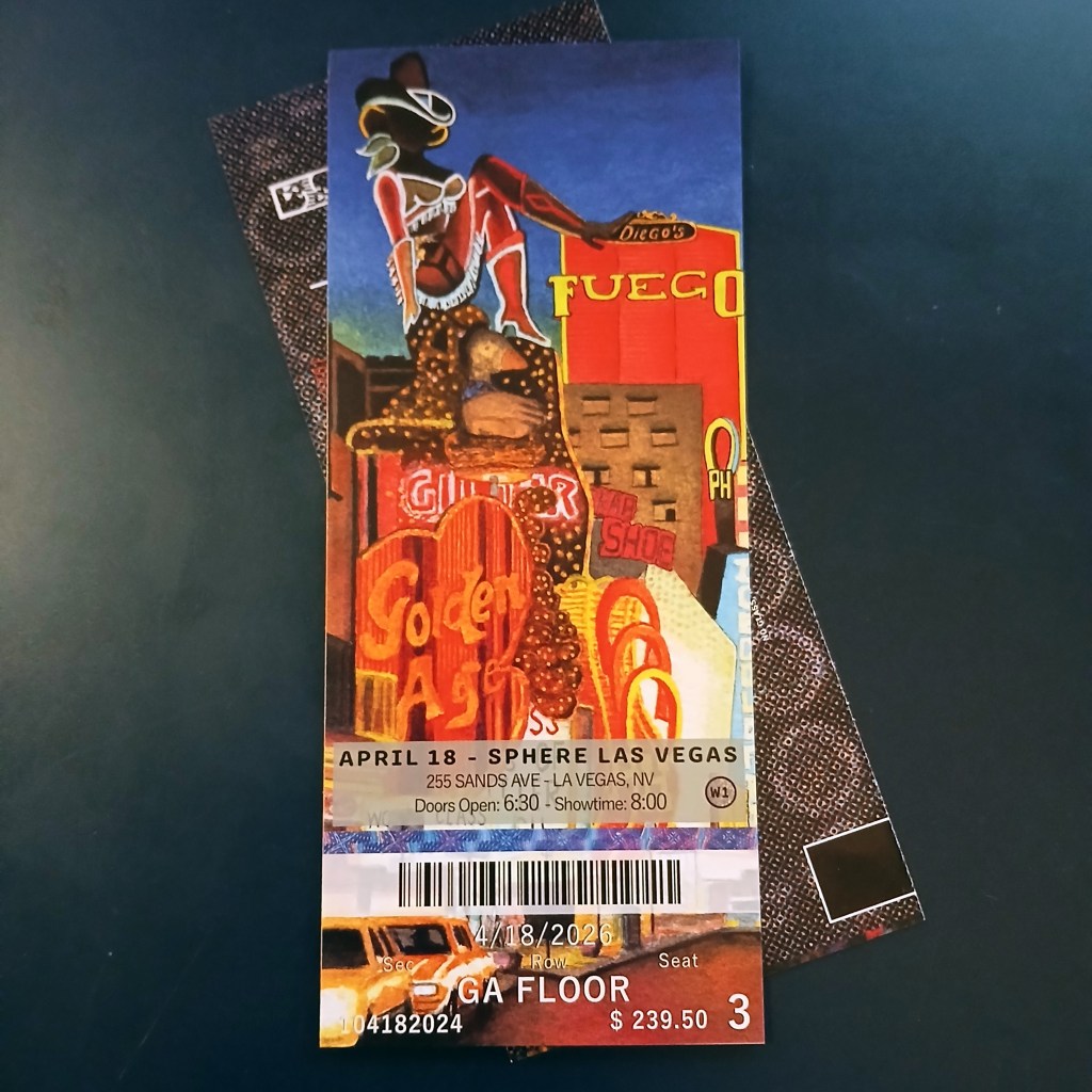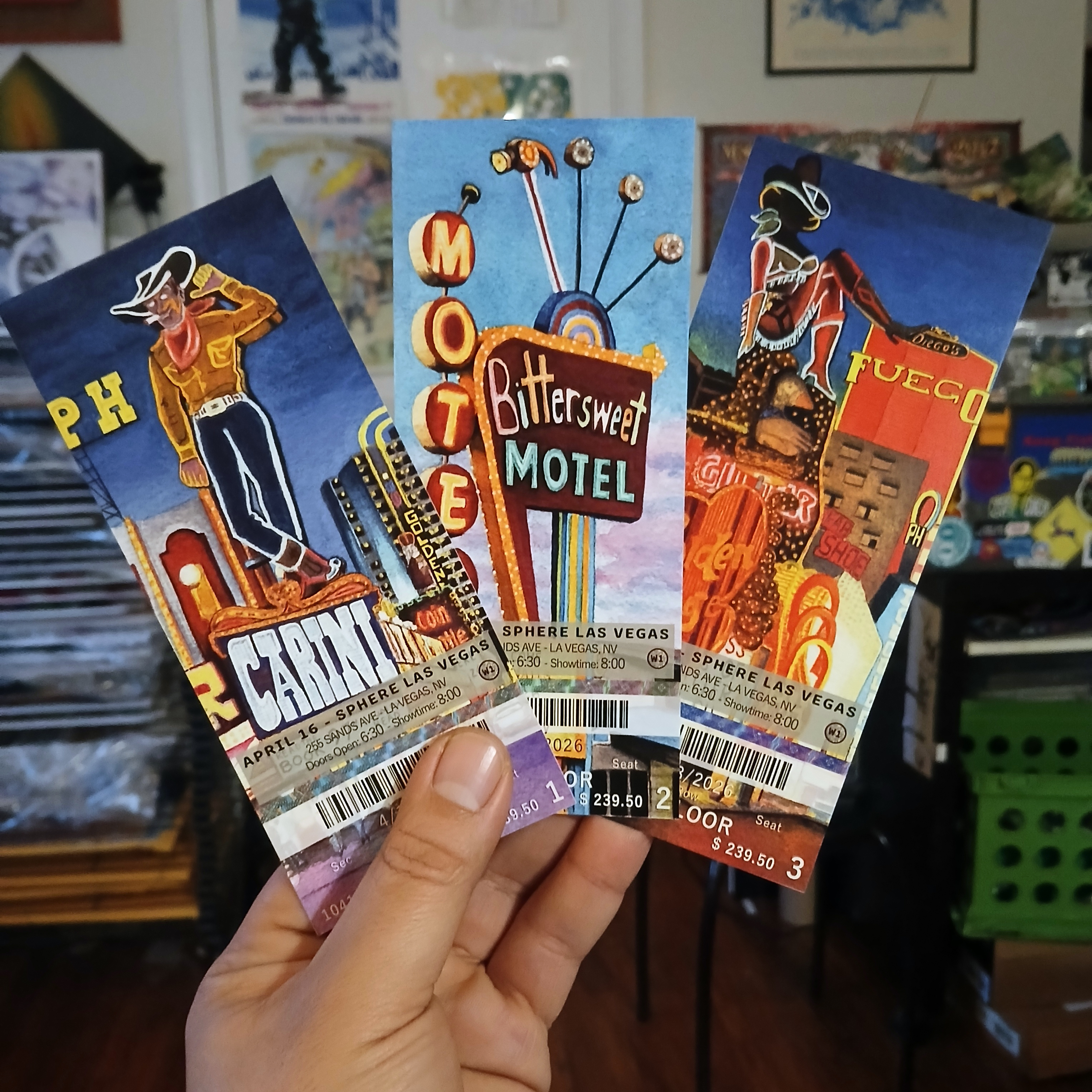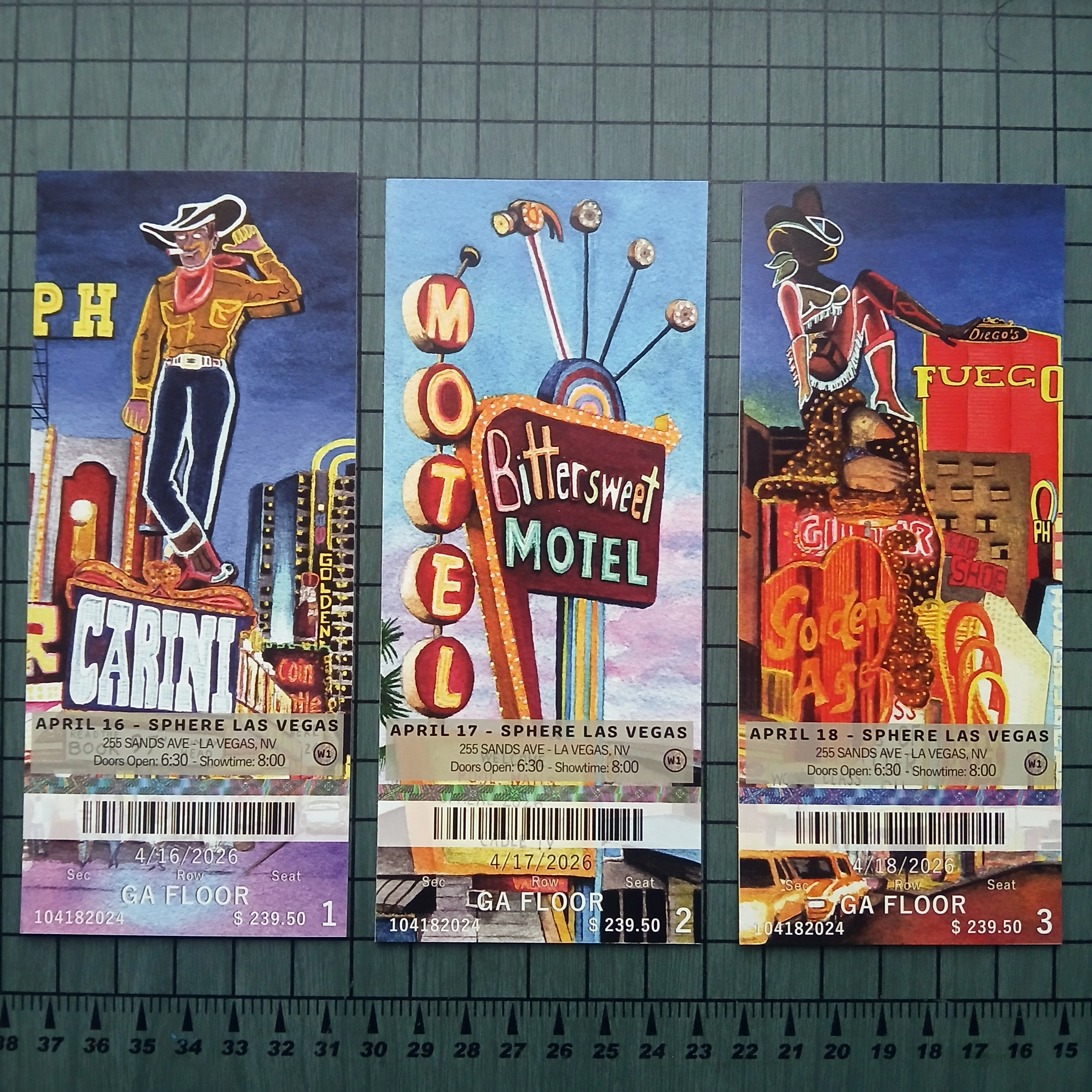 My commemorative ticket stubs for Phish’s first 3-night run at Sphere in Las Vegas on April 16th-18th. The art was inspired by vintage Las Vegas neon signs from the Pioneer Club, the Holiday Motel, the Golden Goose, and Fremont.