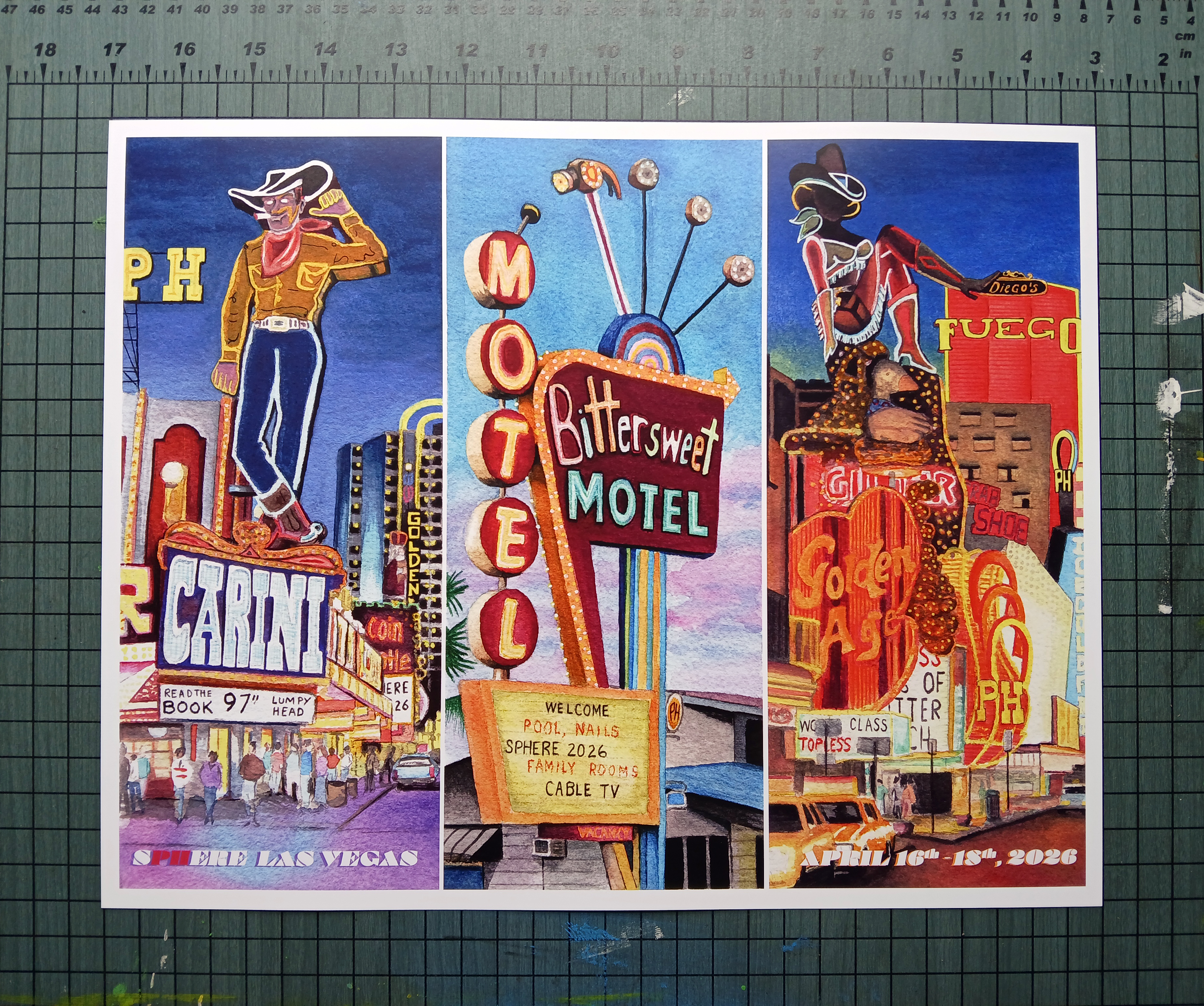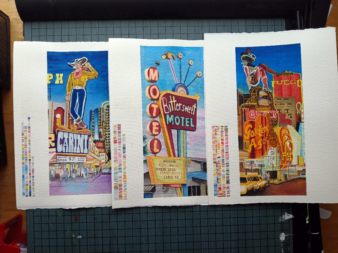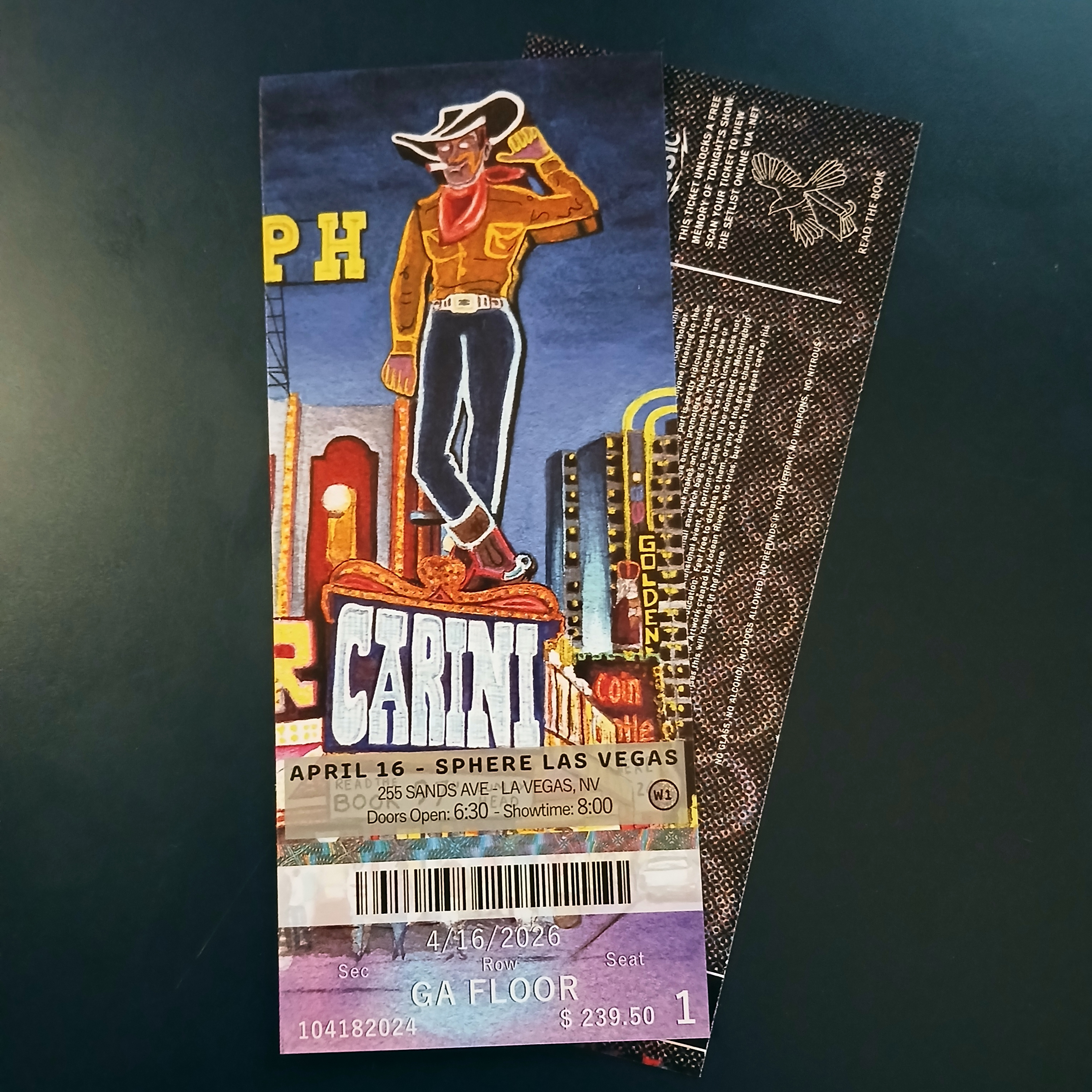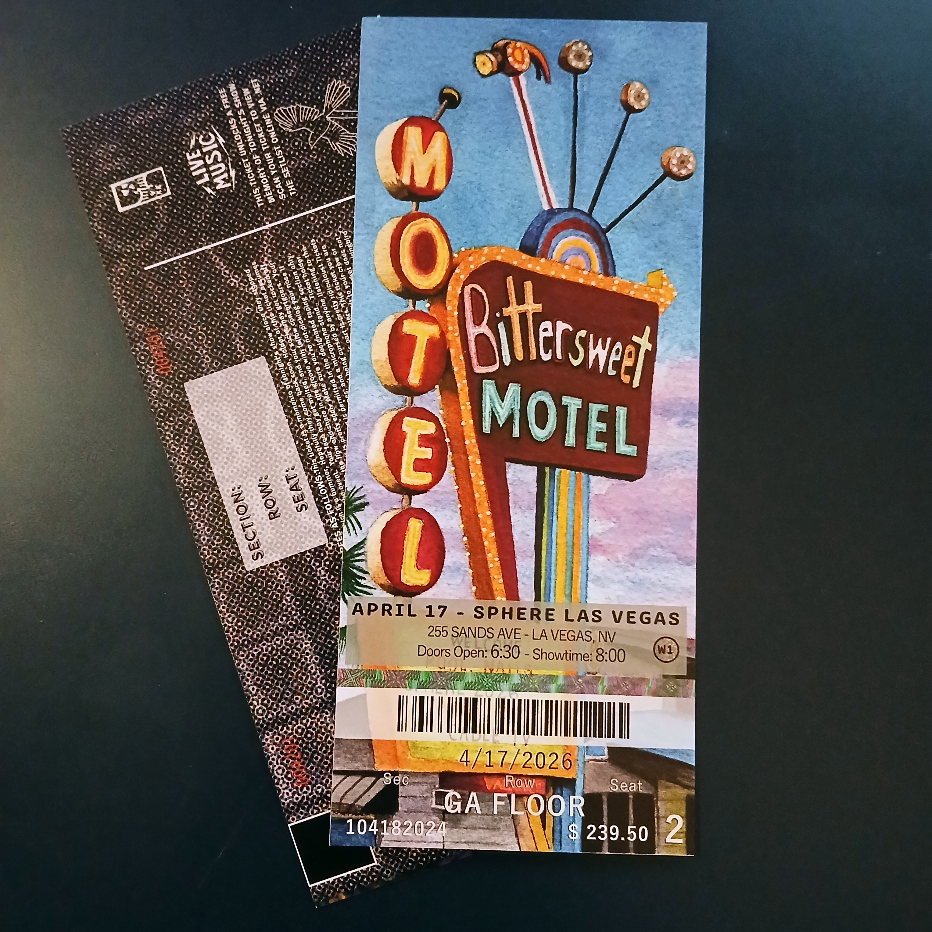 My commemorative ticket stubs for Phish’s first 3-night run at Sphere in Las Vegas on April 16th-18th. The art was inspired by vintage Las Vegas neon signs from the Pioneer Club, the Holiday Motel, the Golden Goose, and Fremont.