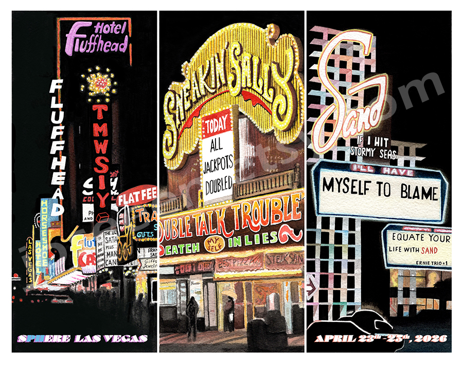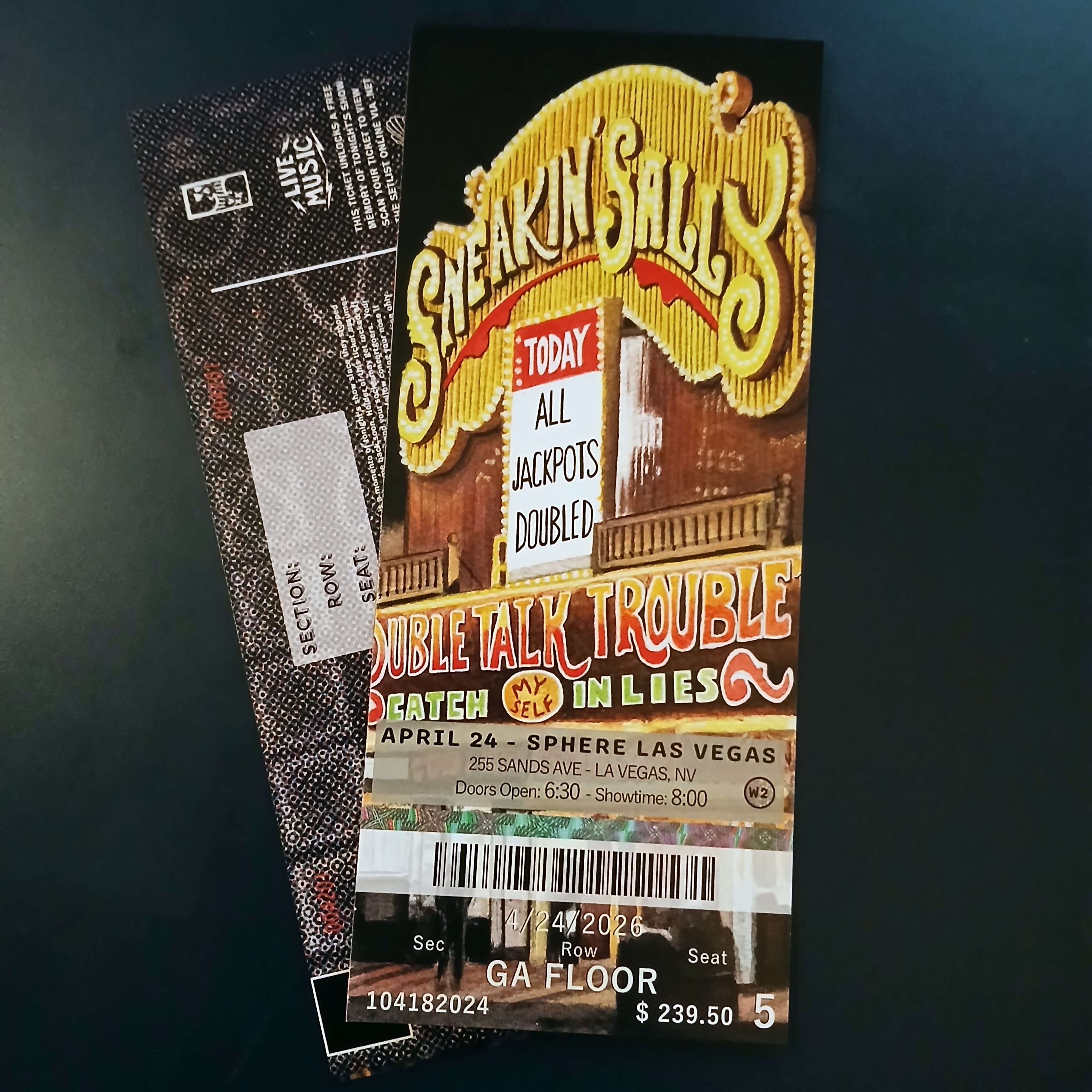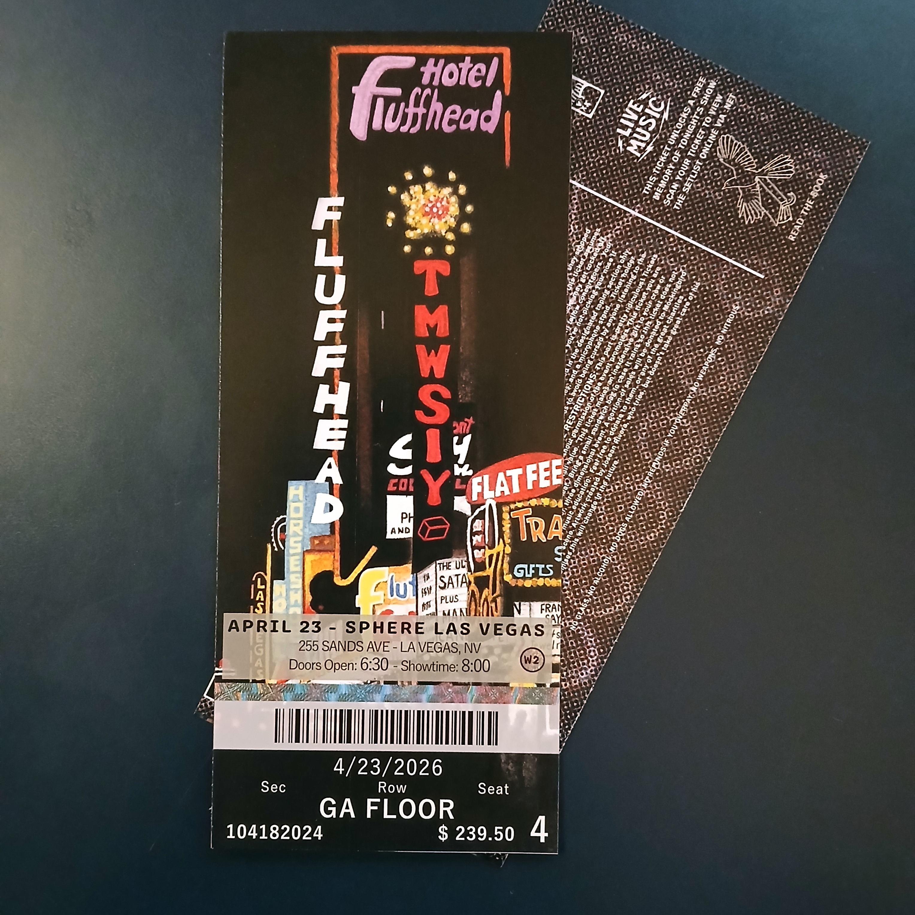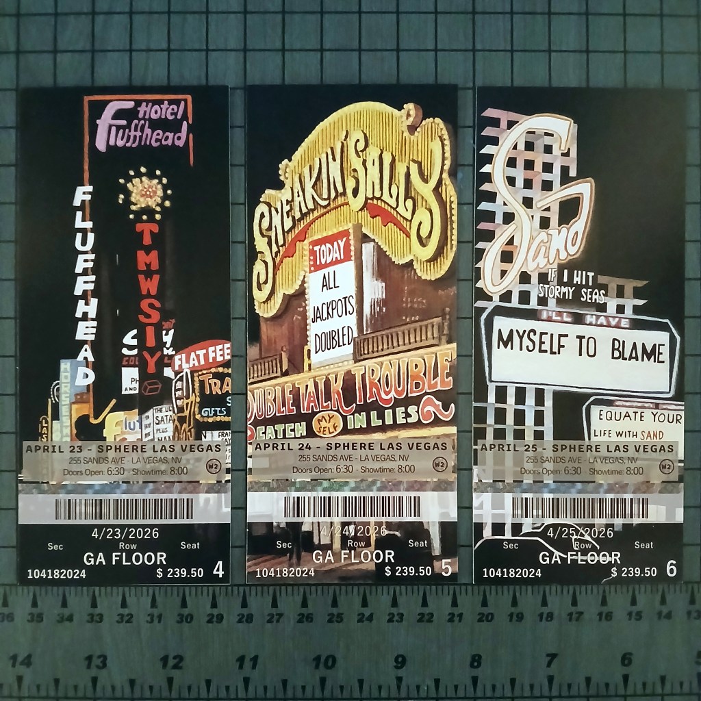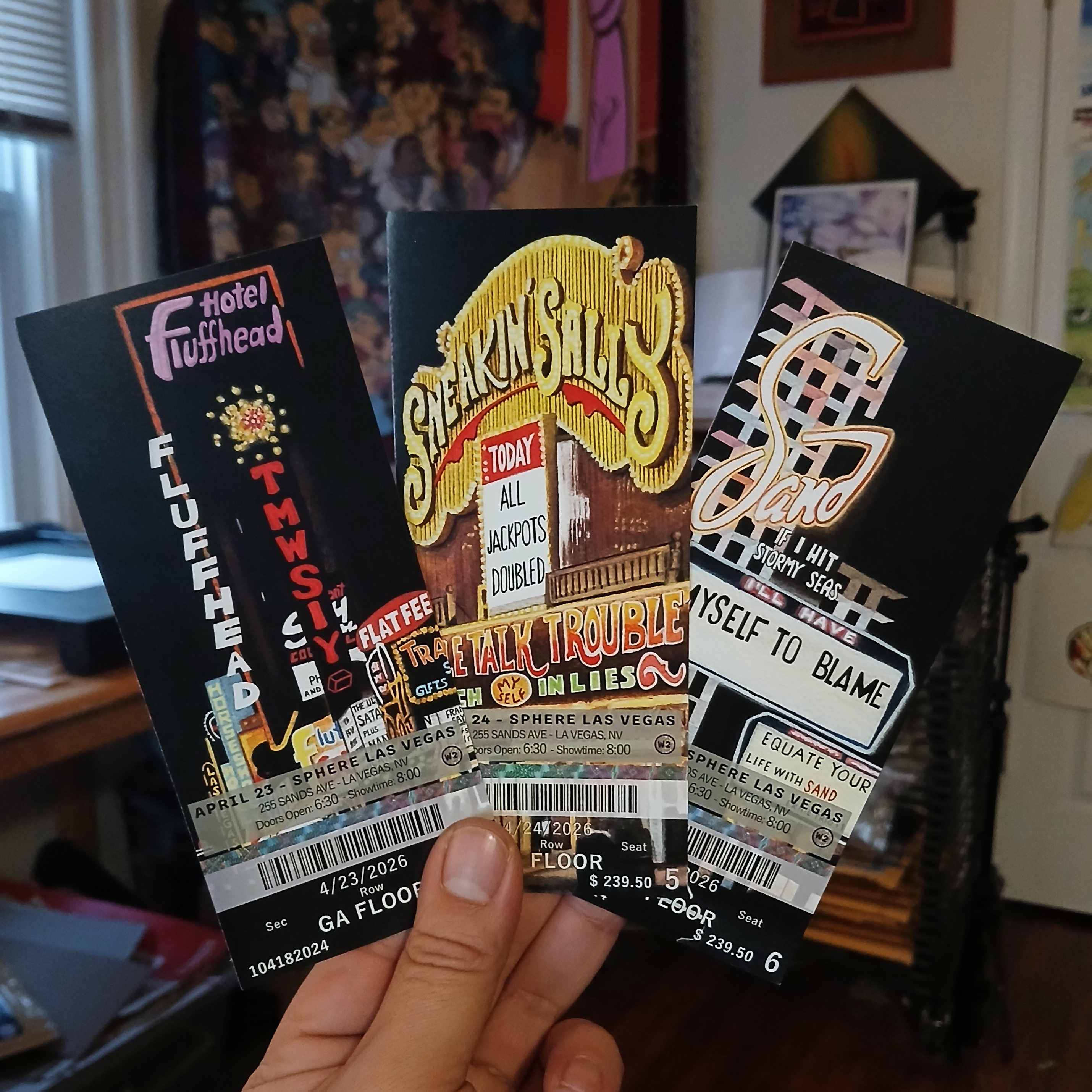 My commemorative ticket stubs for Phish’s second 3-night run at Sphere in Las Vegas on April 23rd-25th. The art was inspired by vintage Las Vegas neon signs from the Hotel Fremont, Sassy Sally’s, and the Sands Casino.
