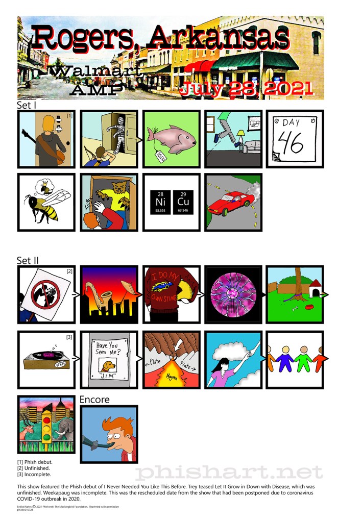 This show featured the Phish debut of I Never Needed You Like This Before. Trey teased Let It Grow in Down with Disease, which was unfinished. Weekapaug was incomplete. This was the rescheduled date from the show that had been postponed due to coronavirus COVID-19 outbreak in 2020.