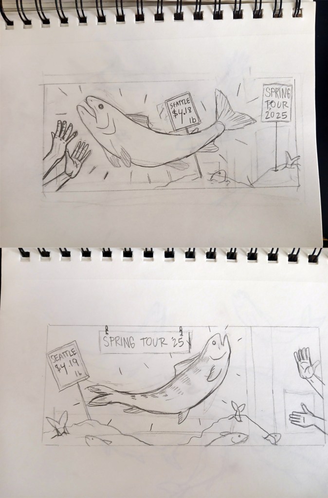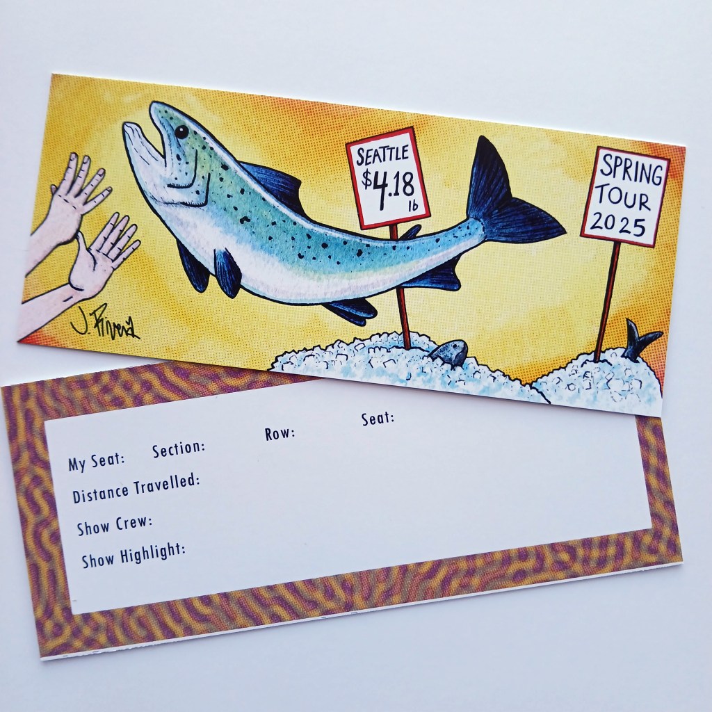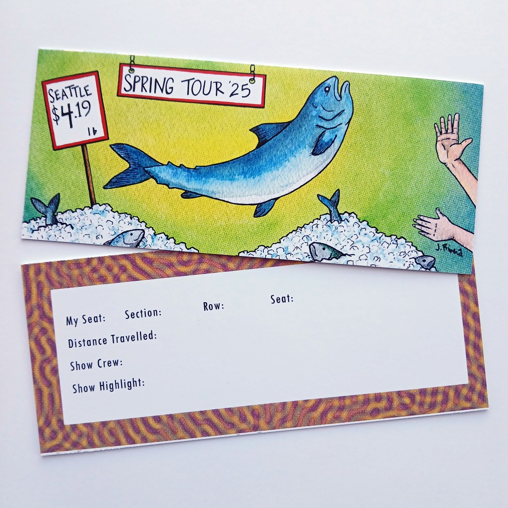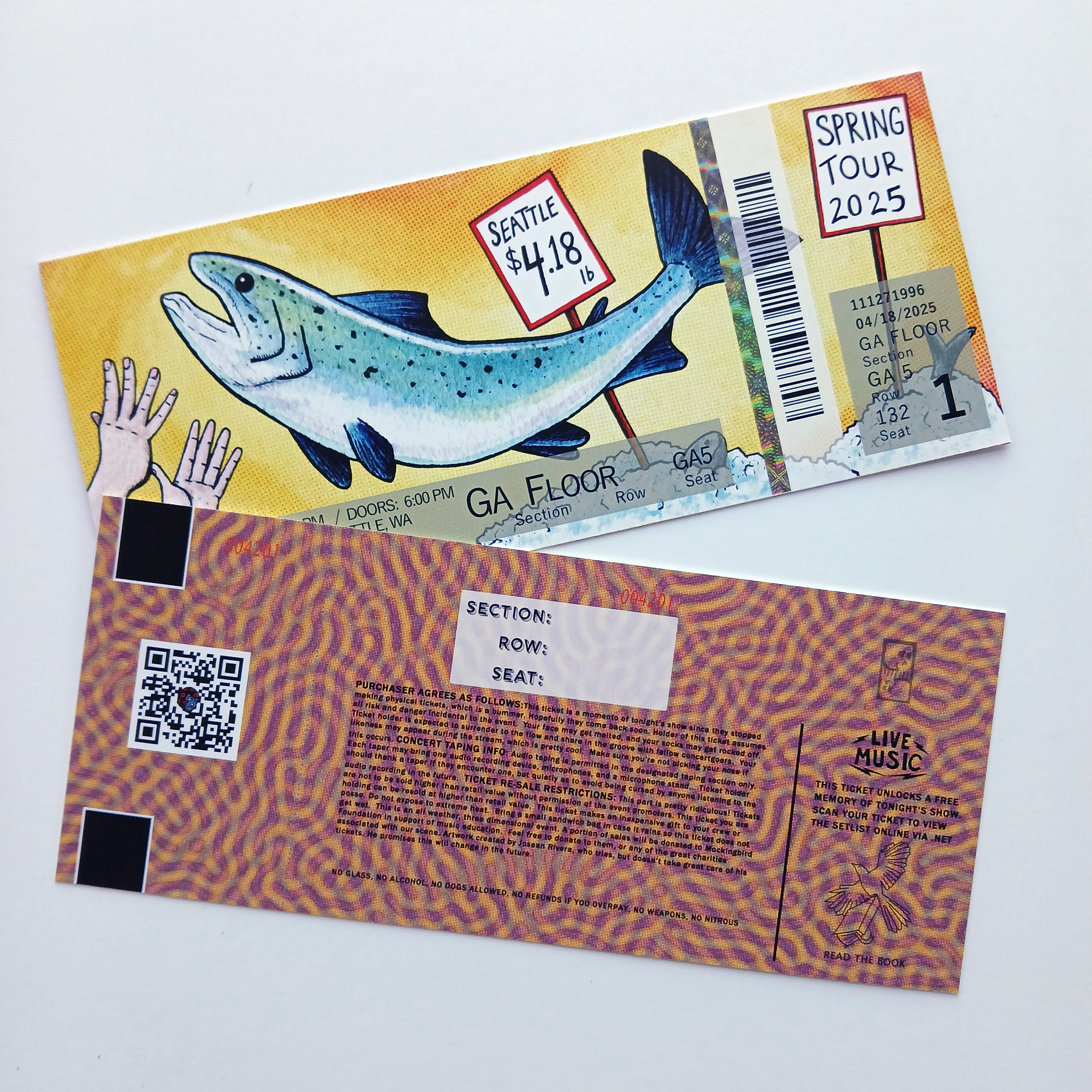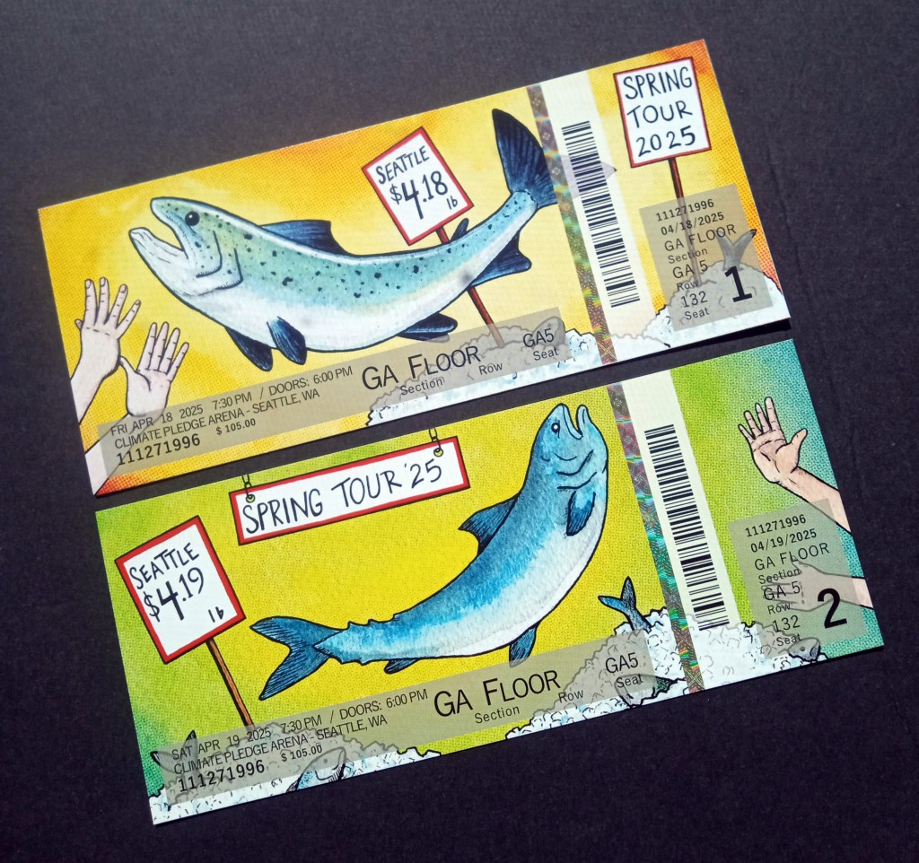 I’m happy to share my commemorative event tickets for Phish’s 2025 Seattle shows at Climate Pledge Arena, starting their spring tour. The artwork was inspired by the Pike Place Market in Seattle, famous for its fish tossing. The original art was created using micron pens and watercolor.
