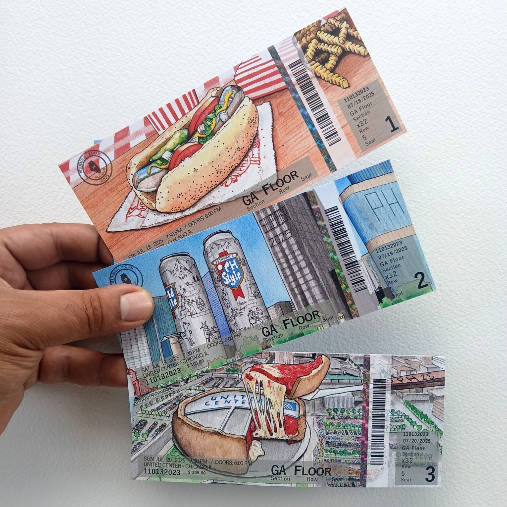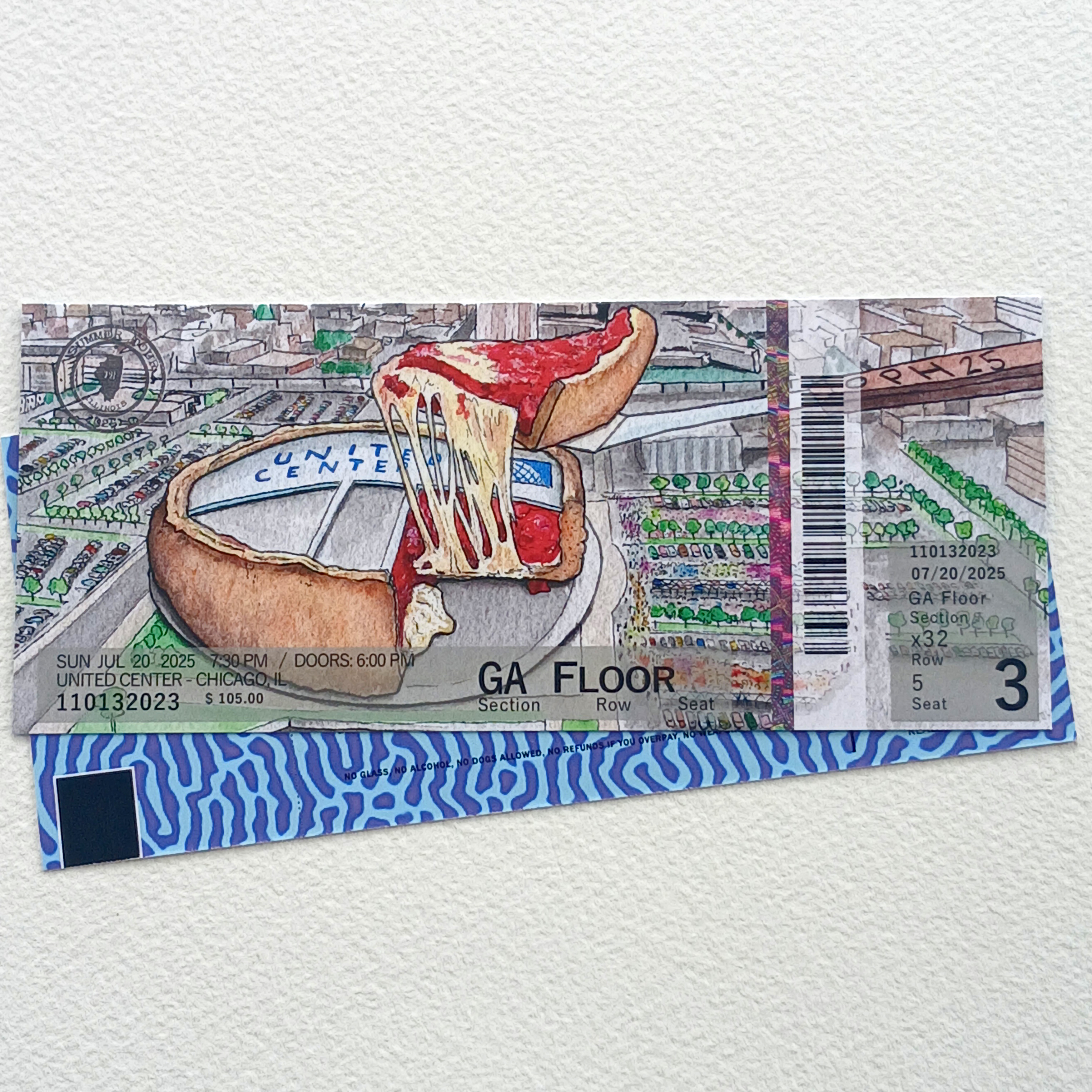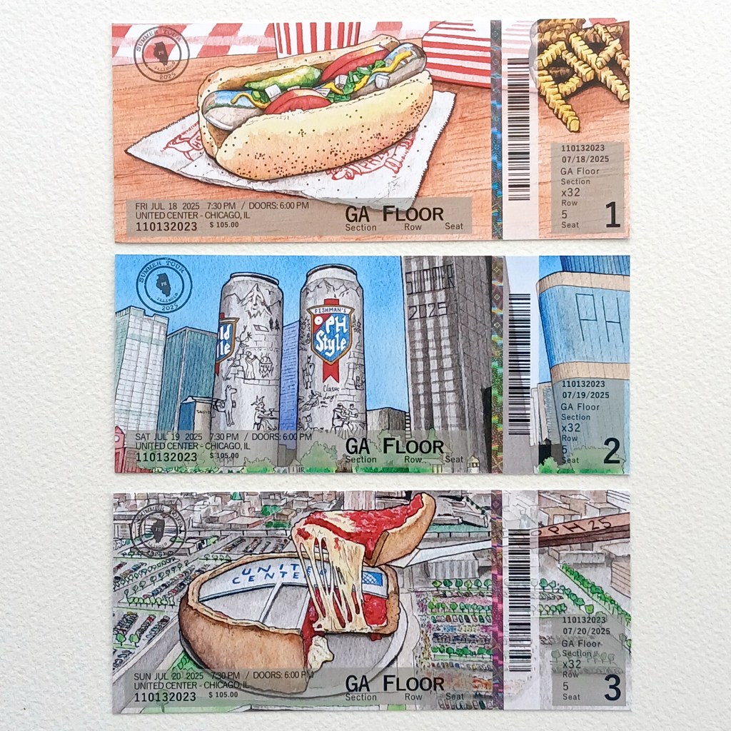 My commemorative ticket stubs for Phish’s three-day run at the United Center in Chicago, IL. The artwork used was several ink and watercolor illustrations I created. I inadvertently continued the food theme from the Philly stubs, and had this idea years ago for a tour poster series, right around 2020! I was finally able to use those ideas for these stubs. Night one has the Bean (actual name Wind Gate) in a Chicago-style hot dog. Night two has the Marina City towers replaced with Old Style tall boys, and night three presents the United Center as a deep dish pizza.
