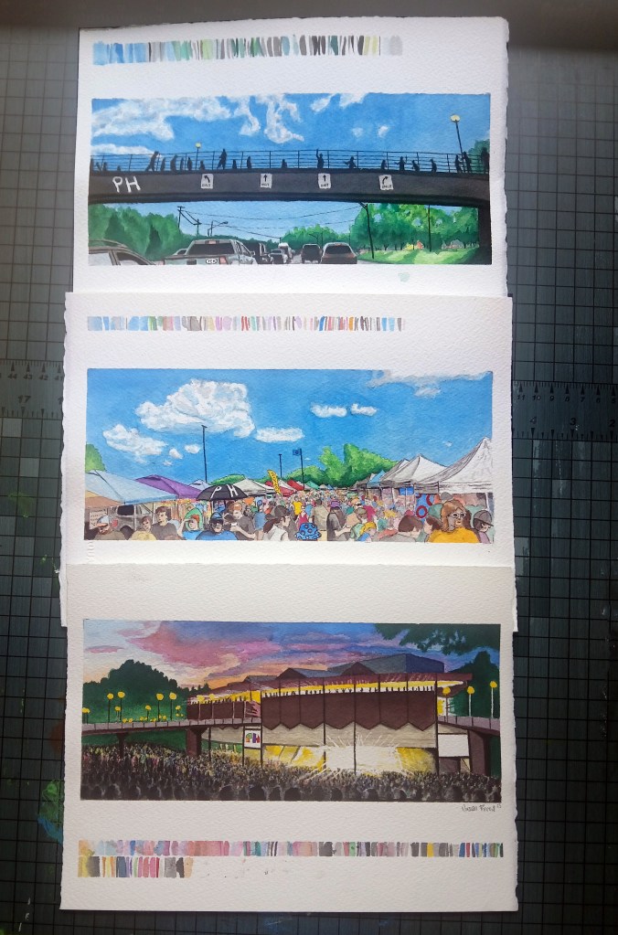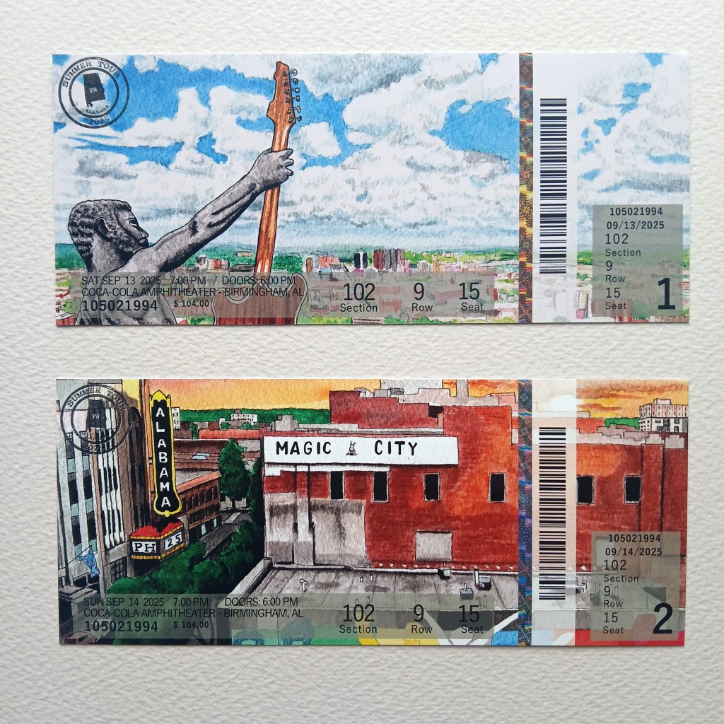 My commemorative ticket stubs for Phish’s 2-night run at the Coca-Cola Amphitheater in Birmingham, AL. The artwork used was watercolor paintings I created, inspired by the Vulcan statue and Birmingham’s theater district.