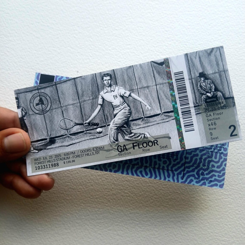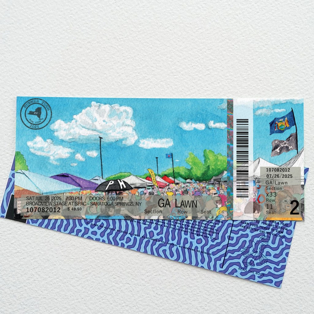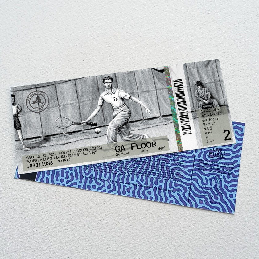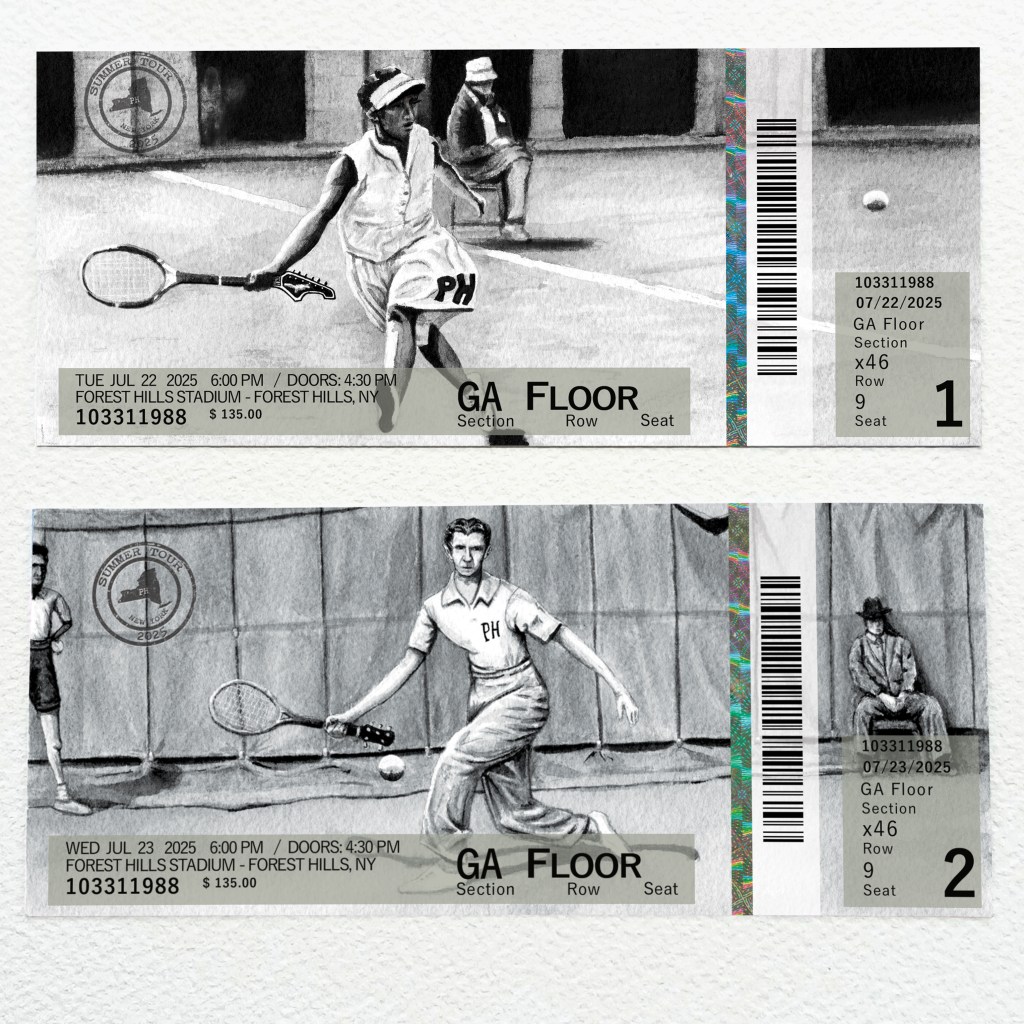 My commemorative ticket stubs for Phish’s two-day run at the Forest Hills Stadium in Forest Hills, NY. The artwork used was black and white watercolor paintings I created. I was inspired by old photographs of tennis matches that took place at the stadium, which was designed in the 1920s as the home of the U.S. Open tennis tournament.