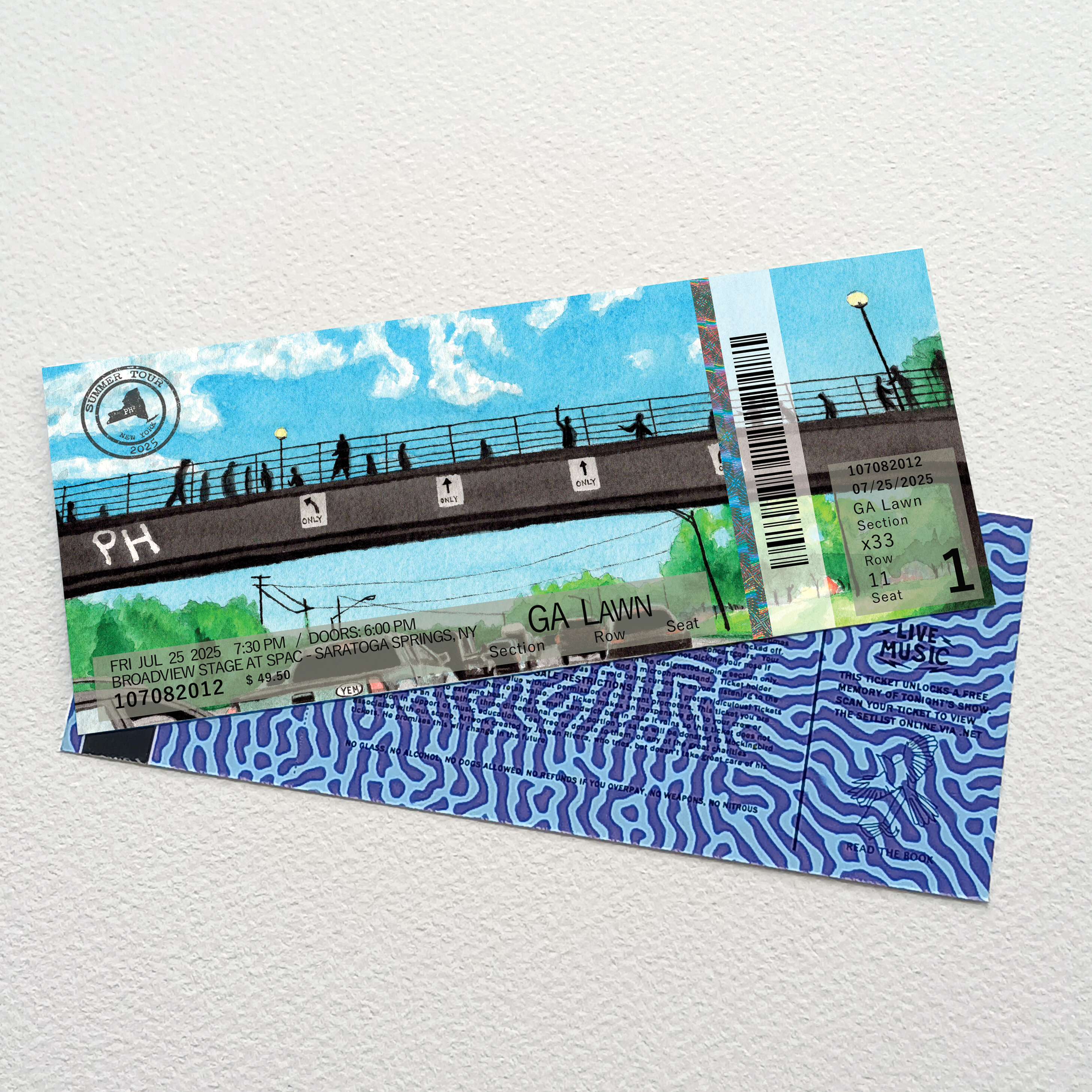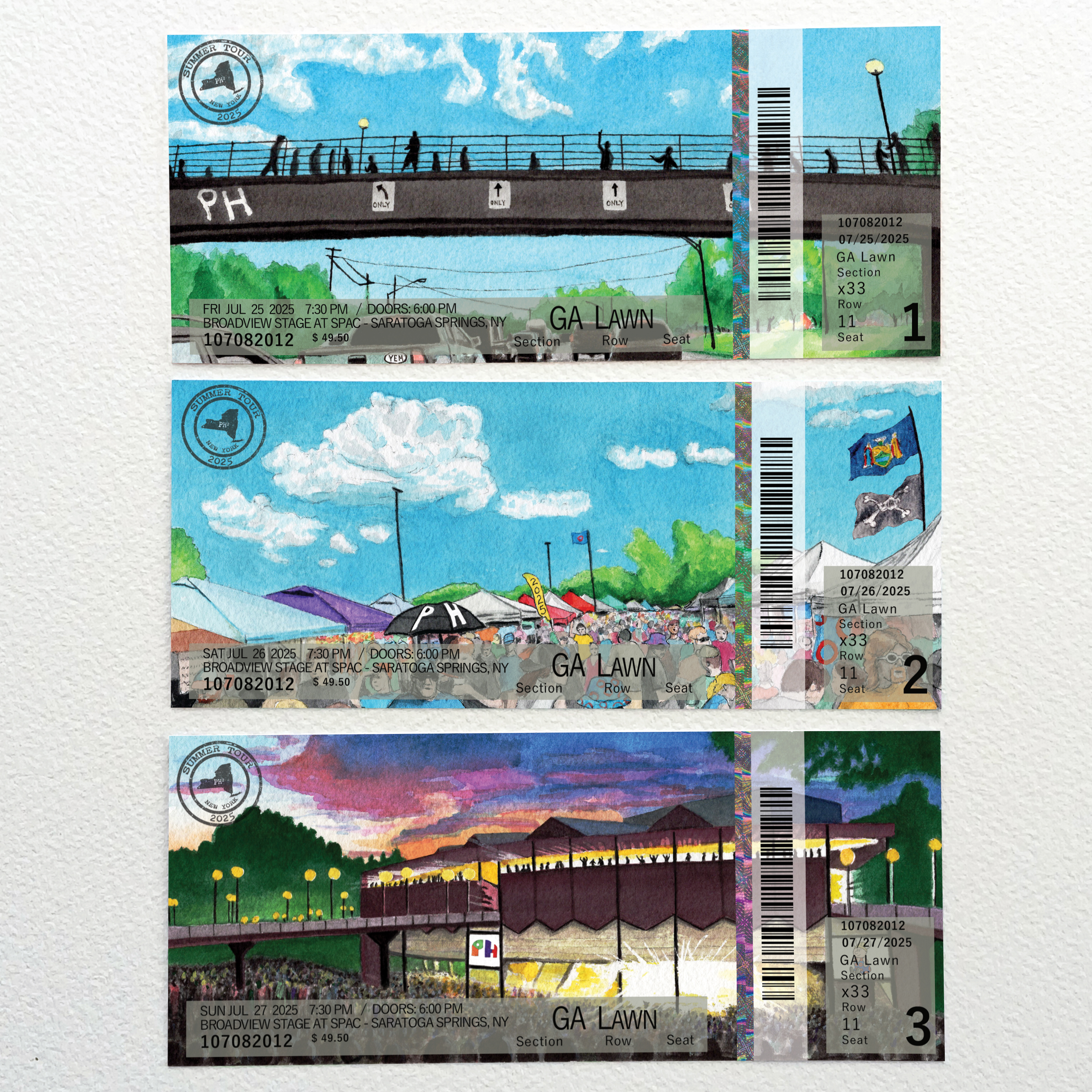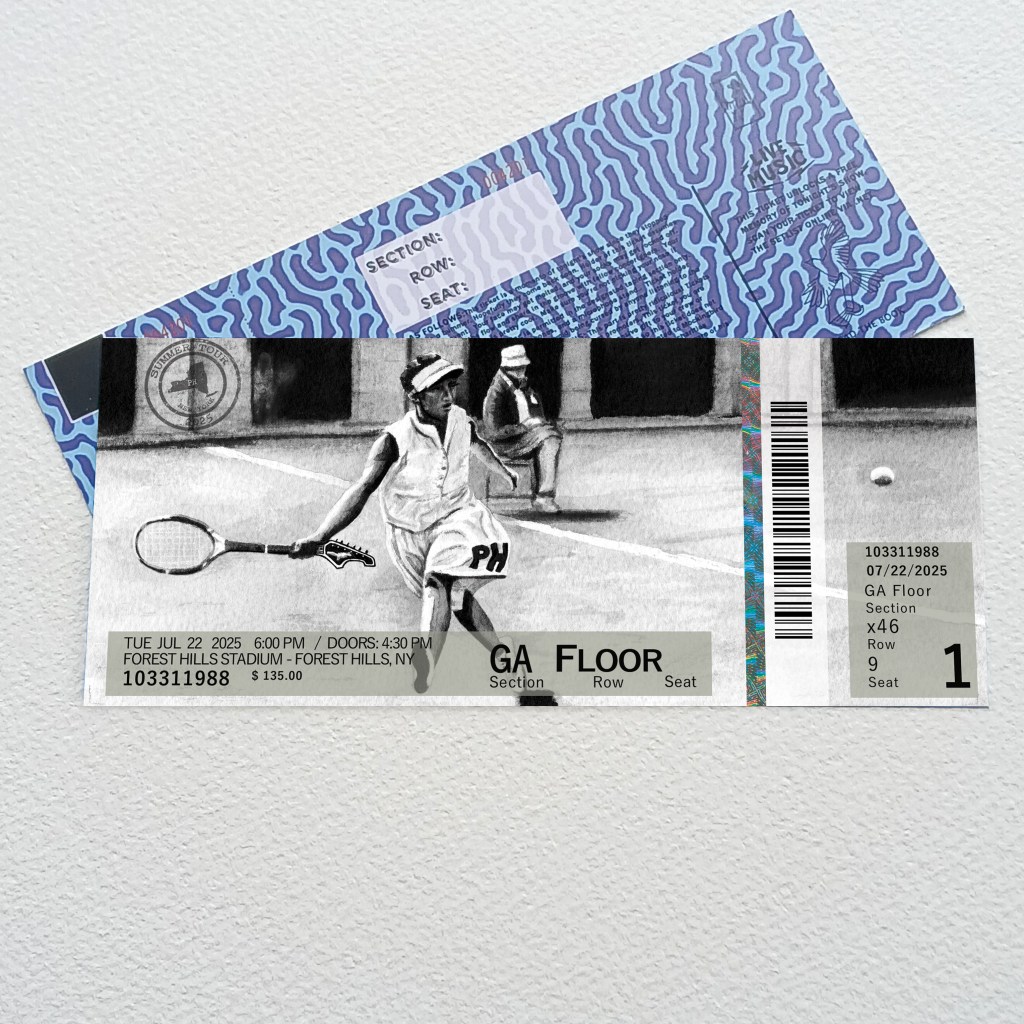 My commemorative ticket stubs for Phish’s two-day run at the Forest Hills Stadium in Forest Hills, NY. The artwork used was black and white watercolor paintings I created. I was inspired by old photographs of tennis matches that took place at the stadium, which was designed in the 1920s as the home of the U.S. Open tennis tournament.