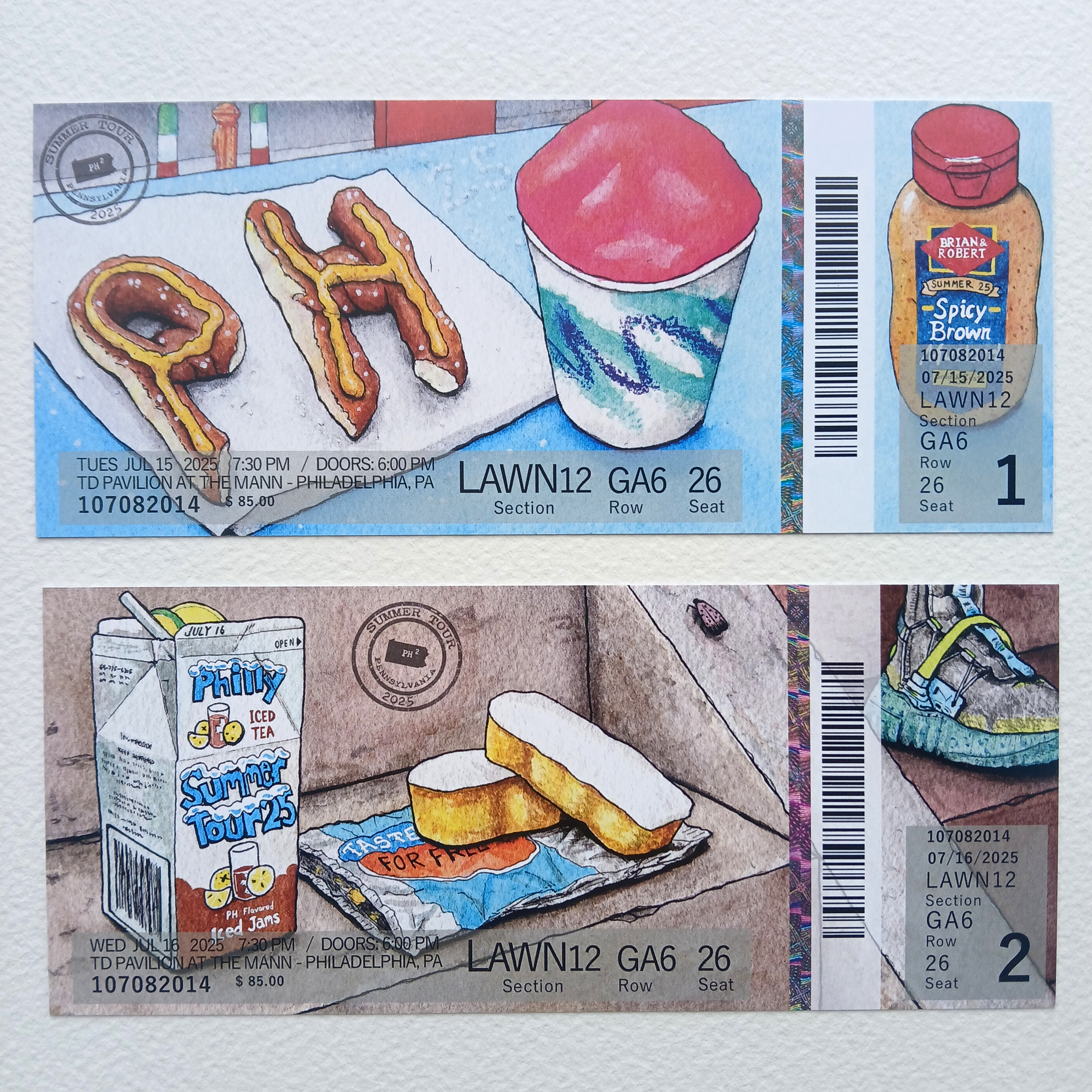 Each stub measures 2.75 x 6.5 inches (the same size as PTBM tickets) and is printed on coated 130 lb card stock by Fireball Printing in Philadelphia. The back features a spot to write down your actual seat/section. I will also include a mini art print/postcard with each order, along with other freebies while supplies last. Purchase here: https://joseeen.etsy.com/listing/4377558556