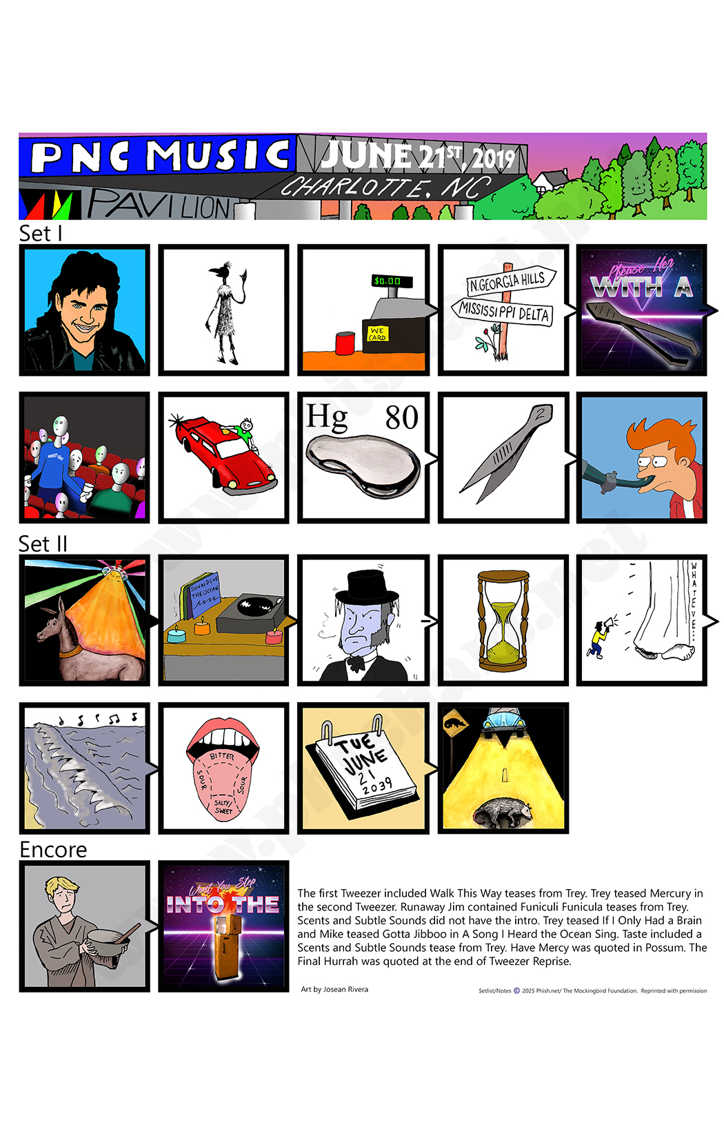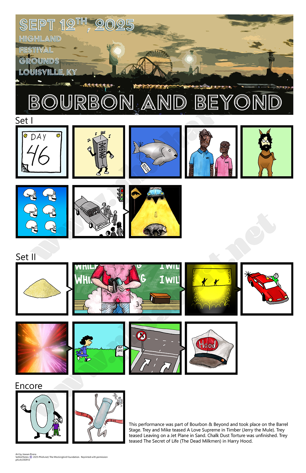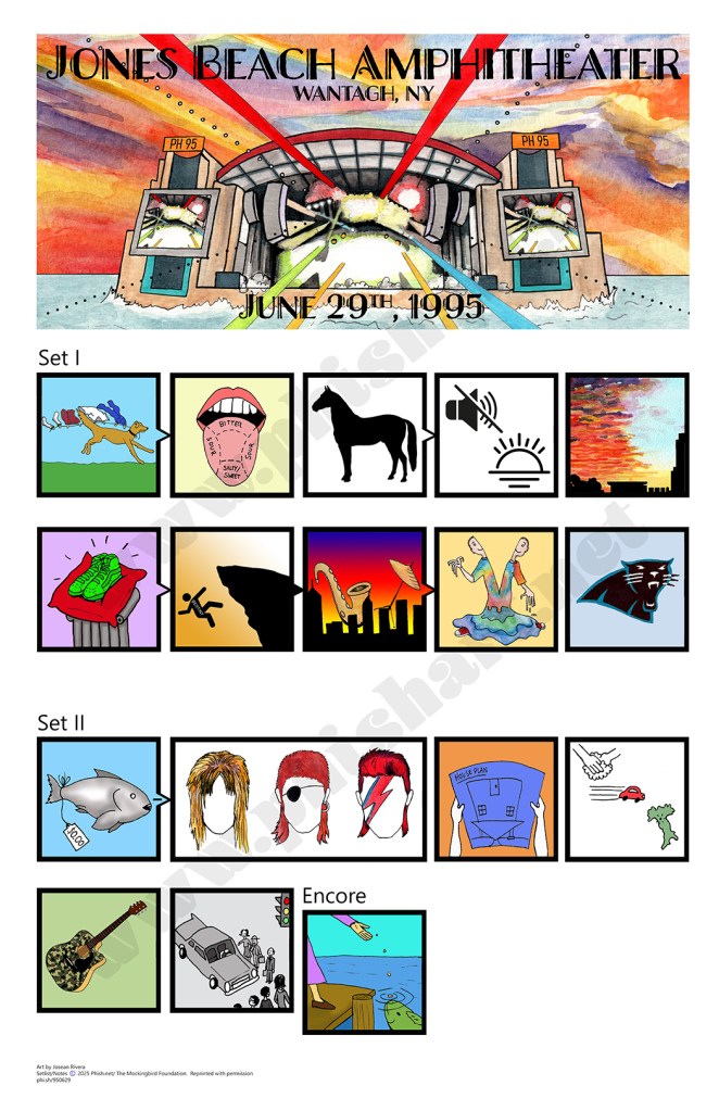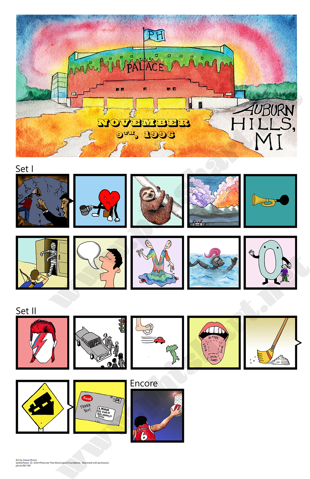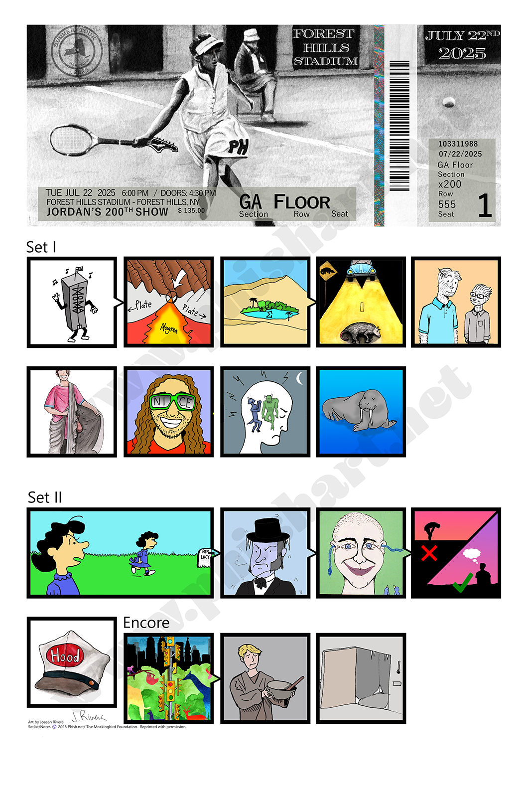 As I finish off my fourth year of creating commemorative Phish ticket stubs, I still enjoy creating illustrated setlists of shows. I usually keep commissions open for setlists of past shows throughout the year, with 12 commissioned setlists created this year. These commissions allow me to take a deep dive into these shows and choose images that best suit that specific show.