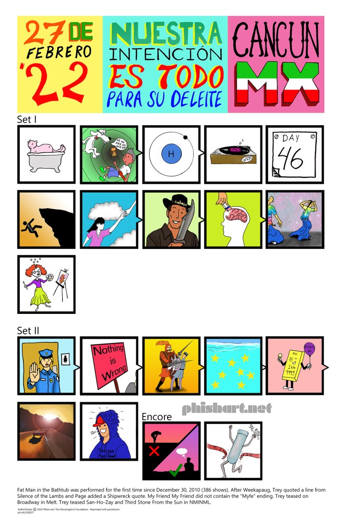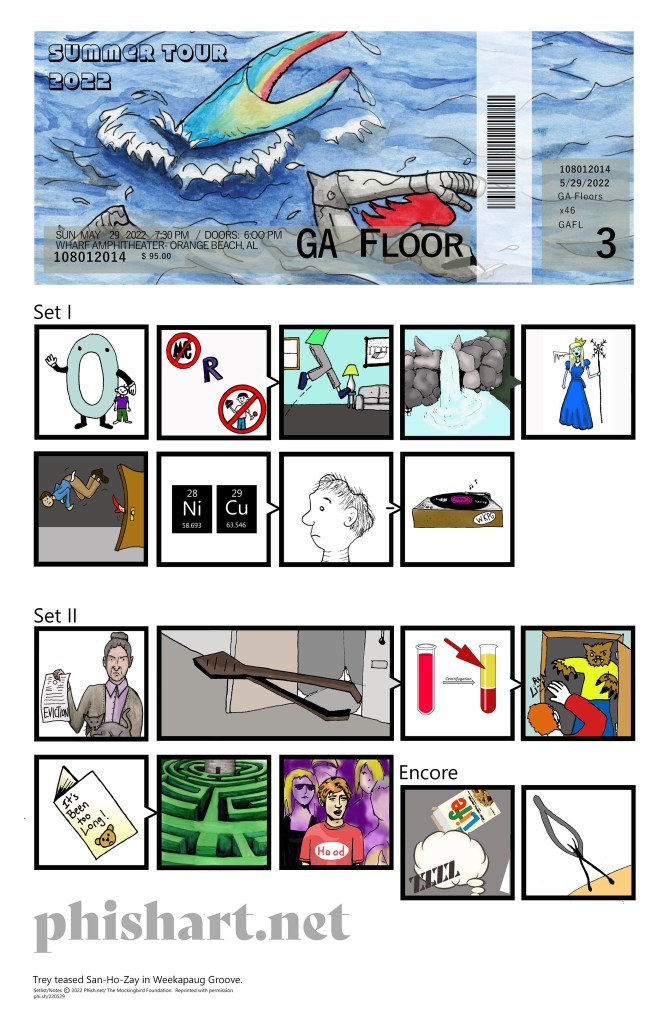 SET 1: Tweezer, Halley’s Comet -> Set Your Soul Free > Rift, Cavern > Tweezer > Shade, Mike’s Song > I Am Hydrogen > Weekapaug Groove