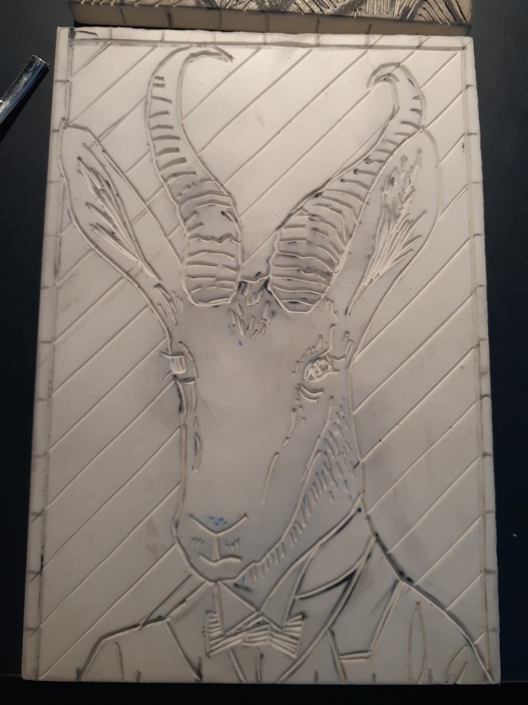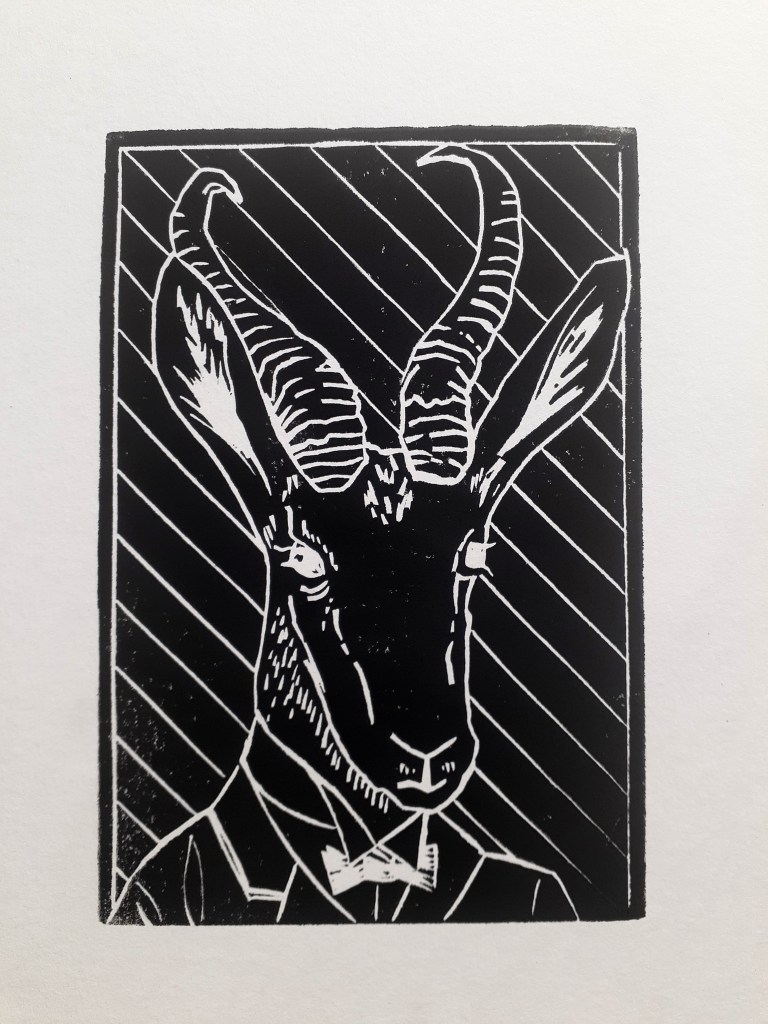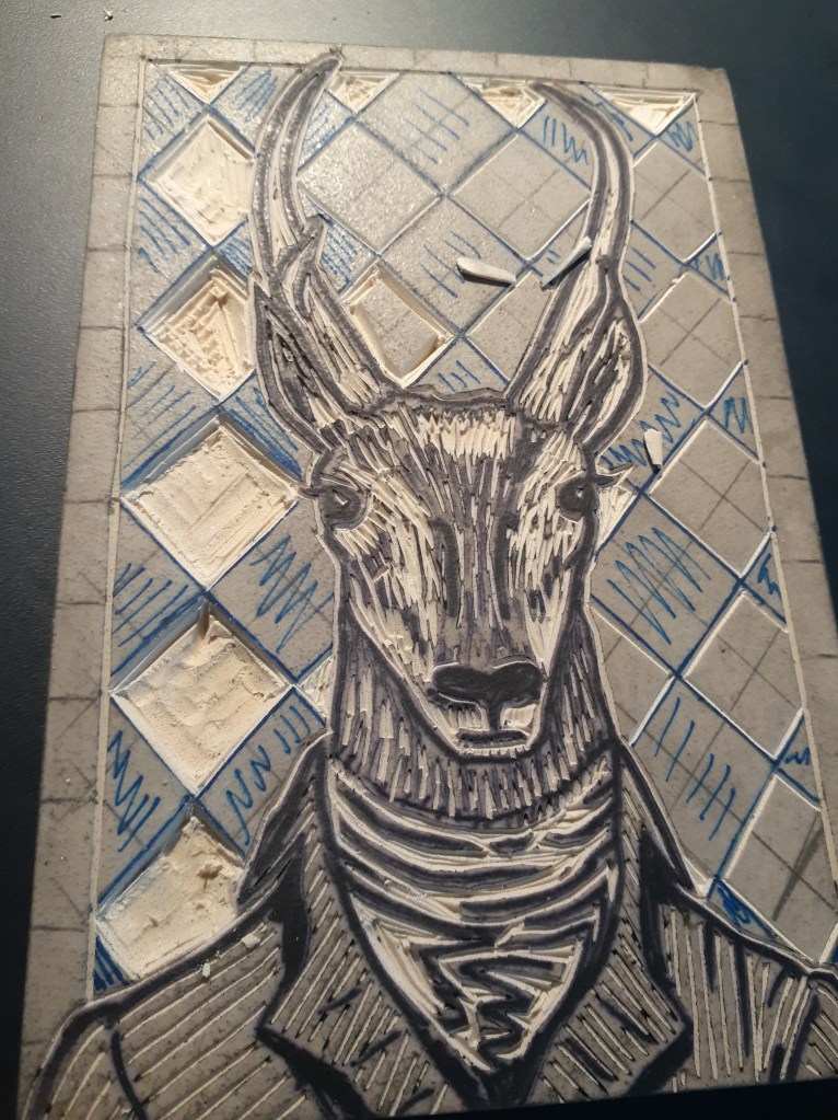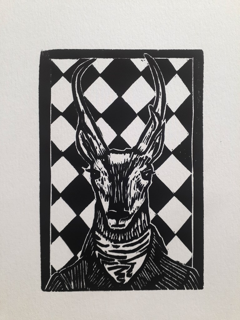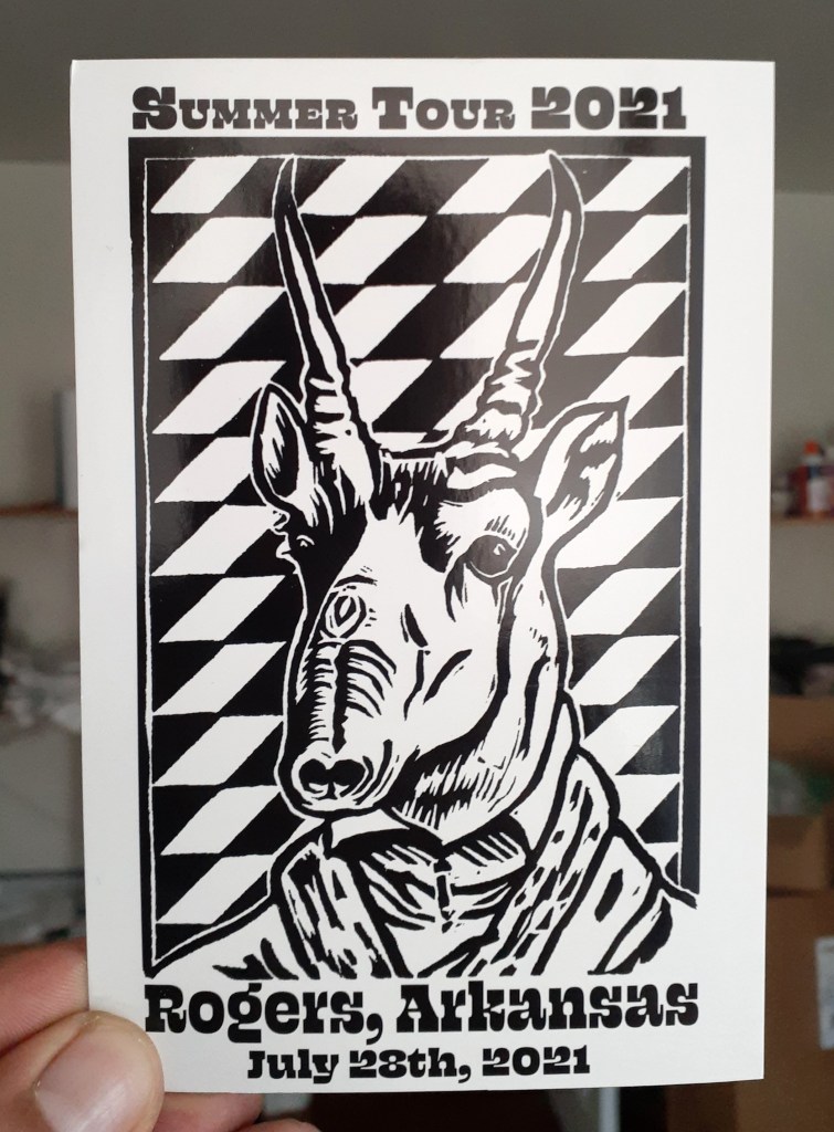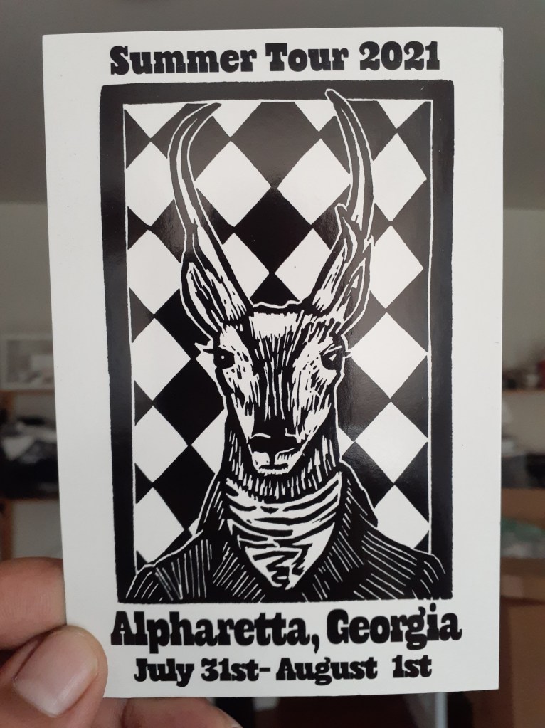 For the first three shows of the tour, I created some postcards based on linocuts I had done not too long ago. These images were created to be used as examples of different carving styles when teaching printmaking to my students. I played with the idea of doing more in the series for the whole tour early on but decided against it. Some back issues recently returned that would have made carving and hand printing impossible. I later decided to use the images to create mini-prints on postcards, which I have often done for my prints. I’ve often heard the phrase “I love it, but I don’t know where I’ll put it” way too many times. A postcard can go up on the fridge, or framed alone or in a set! These postcards are available on their own or as a set of the first 5 shows