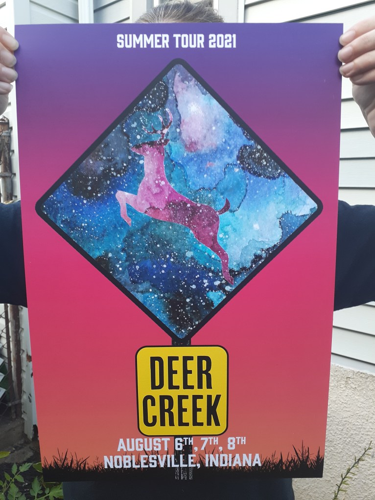 My Deer Creek (I refuse to address it by any other name) print has quickly become one of my favorites for the tour. It was created by accident while playing around in Illustrator after learning how to actually use it! Prior to this, I had no idea how to use Illustrator and everything I knew about Photoshop was the result of trial and error. The sign and the deer were watercolor paintings, and the rest was digitally created. This was just going to be a postcard design, but I got enough feedback telling me it should also be a print. Printed on 11×17 100lb uncoated smooth paper, they are signed and numbered and limited to an edition of 50.