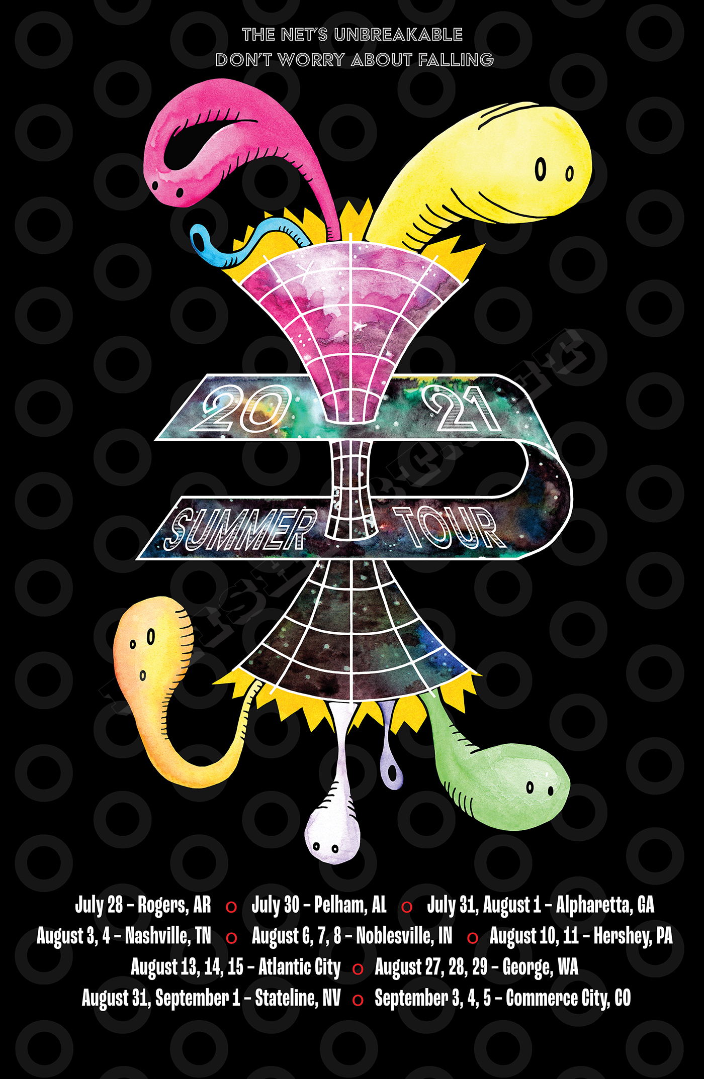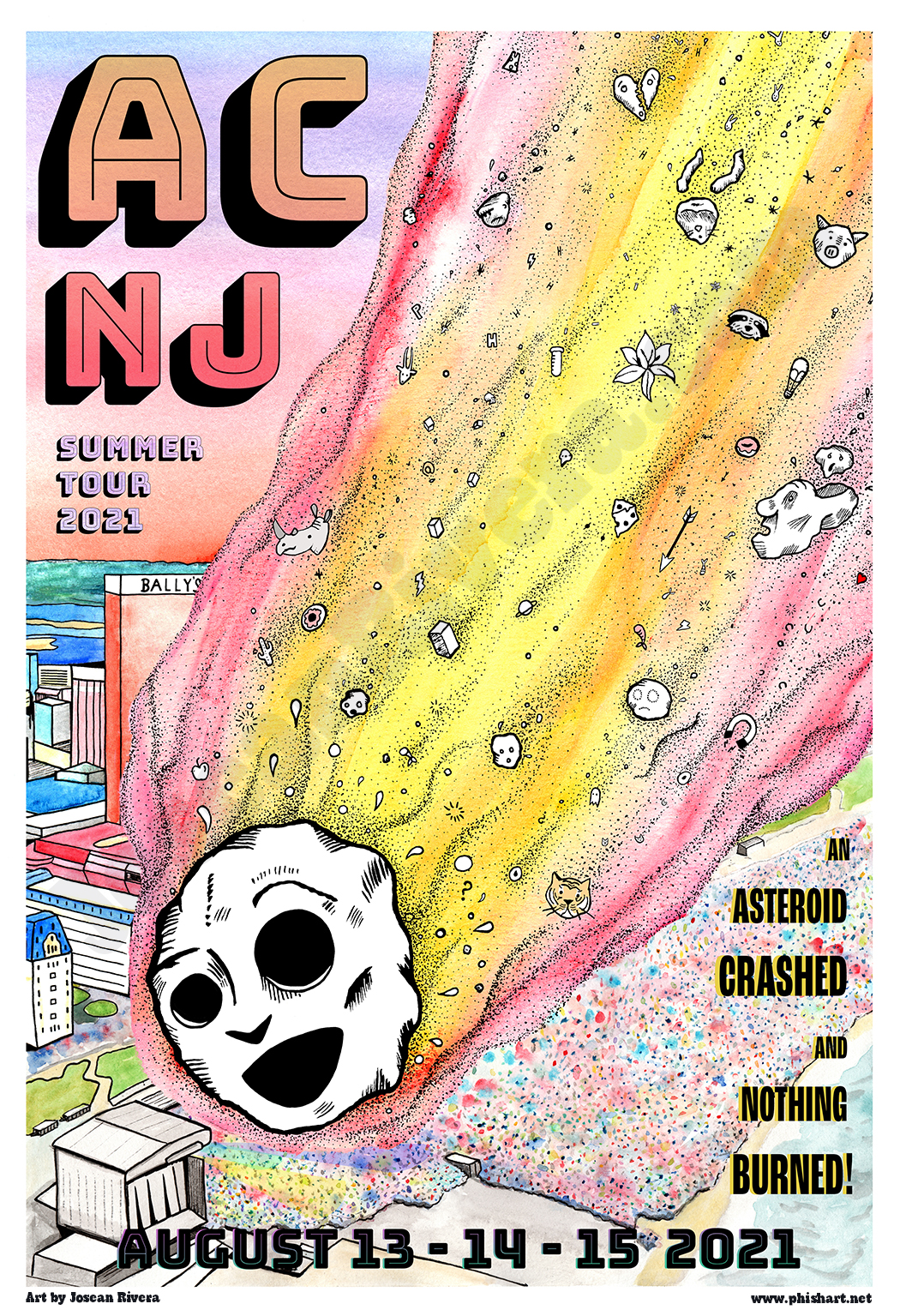 My AC print is another that began in 2020, revisiting an old style that I haven done in a while. It’s inspired by the song Tube, and includes many images from the song in the asteroid debris, as well as random Phish related nonsense. This probably took my the longest to draw due to the stippling style of inking found in the asteroid. The original drawing was done with Micron pens and gouache paint. The print measures 13×19 and is printed on 120 lb smooth uncoated matte paper, printed by Fireball Printing in Philadelphia. Each print is signed and numbered and limited to an edition of 100. These are now available in my shop, as well as the Phanart show in AC.
