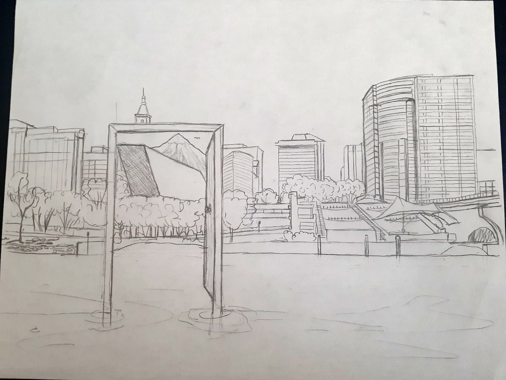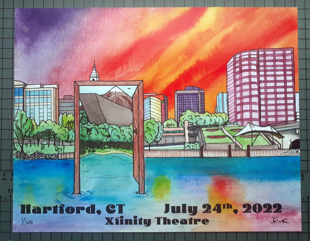 My design for the Hartford show. I do not like to draw city skylines yet I keep doing them! I was inspired by the Connecticut Science Center, which instantly reminded me of the Rhombus from The Man Who Stepped Into Yesterday. The original painting was ink, watercolor, and gouache paint. Prints are 11×14, signed and numbered, and limited to an edition of 100. Tickets are based on PTBMs, and the barcode links to the setlist on Phish.net!