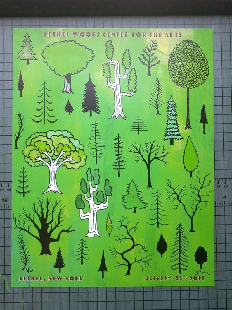 My design for the Bethel Woods shows. I’ve always loved drawing trees, and it seemed fitting for this venue. The original painting was ink, watercolor, and gouache paint. Prints are 11×14, signed and numbered, and limited to an edition of 100. Tickets are based on PTBMs, and the barcode links to the setlist on Phish.net!