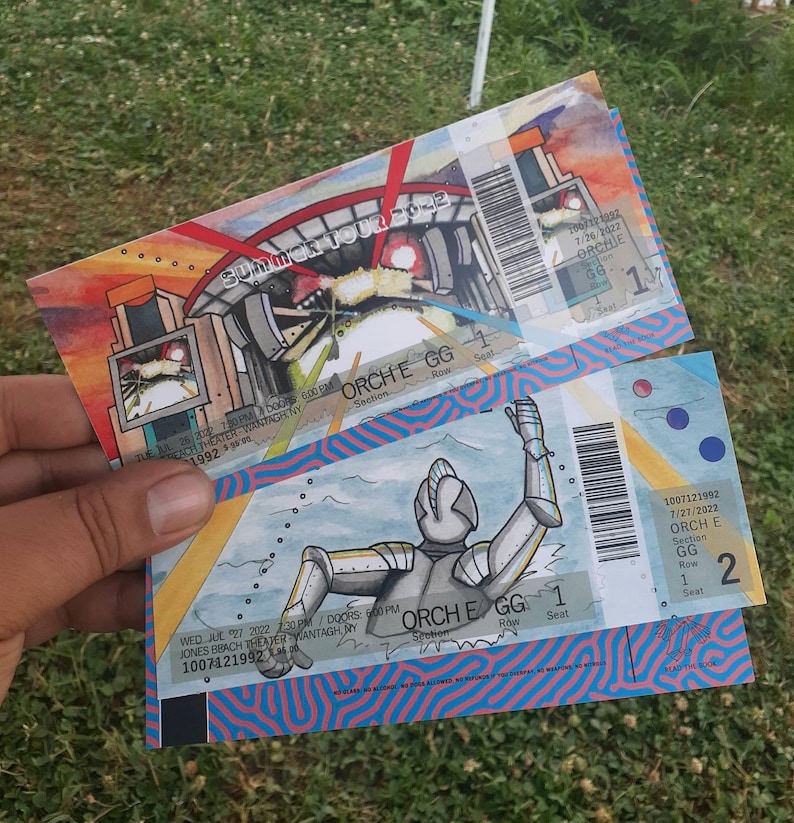 My design for the Jones Beach shows. The ticket art was inspired by the old pictures of Jones Beach when there was water between the stage and the audience, and the song Lizards. The original painting was ink, watercolor, and gouache paint. Prints are 11×14, signed and numbered, and limited to an edition of 100. Tickets are based on PTBMs, and the barcode links to the setlist on Phish.net!