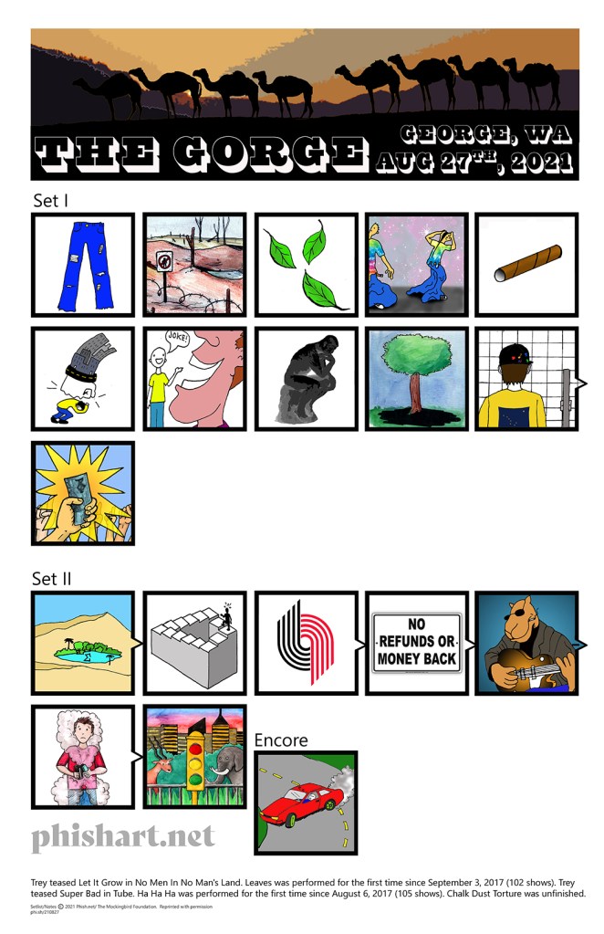 Trey teased Let It Grow in No Men In No Man’s Land. Leaves was performed for the first time since September 3, 2017 (102 shows). Trey teased Super Bad in Tube. Ha Ha Ha was performed for the first time since August 6, 2017 (105 shows). Chalk Dust Torture was unfinished.